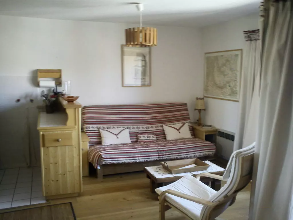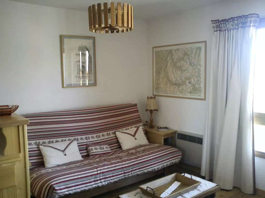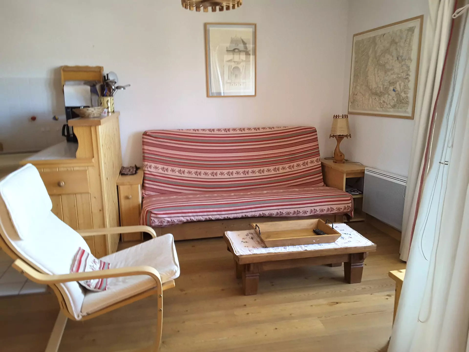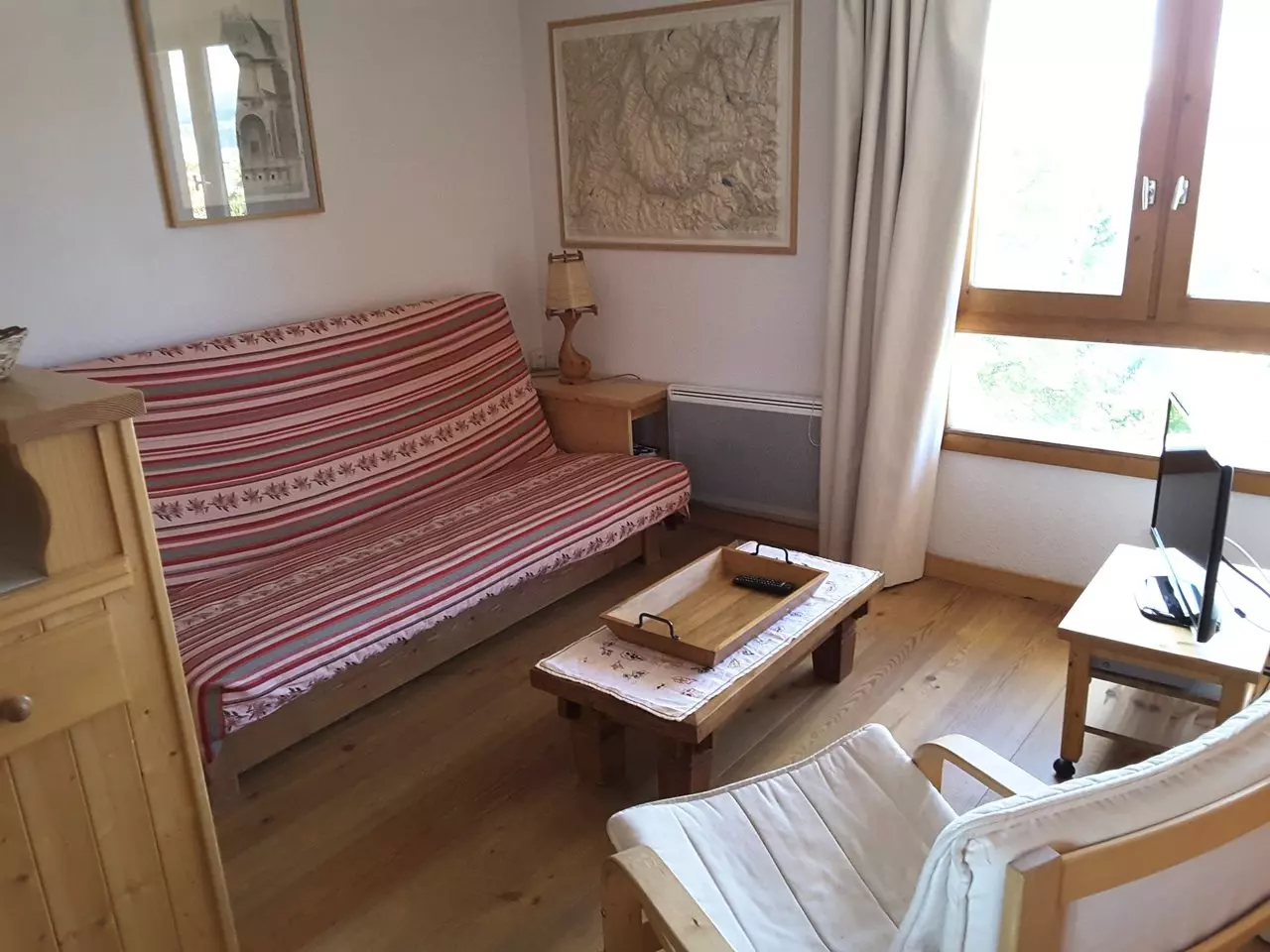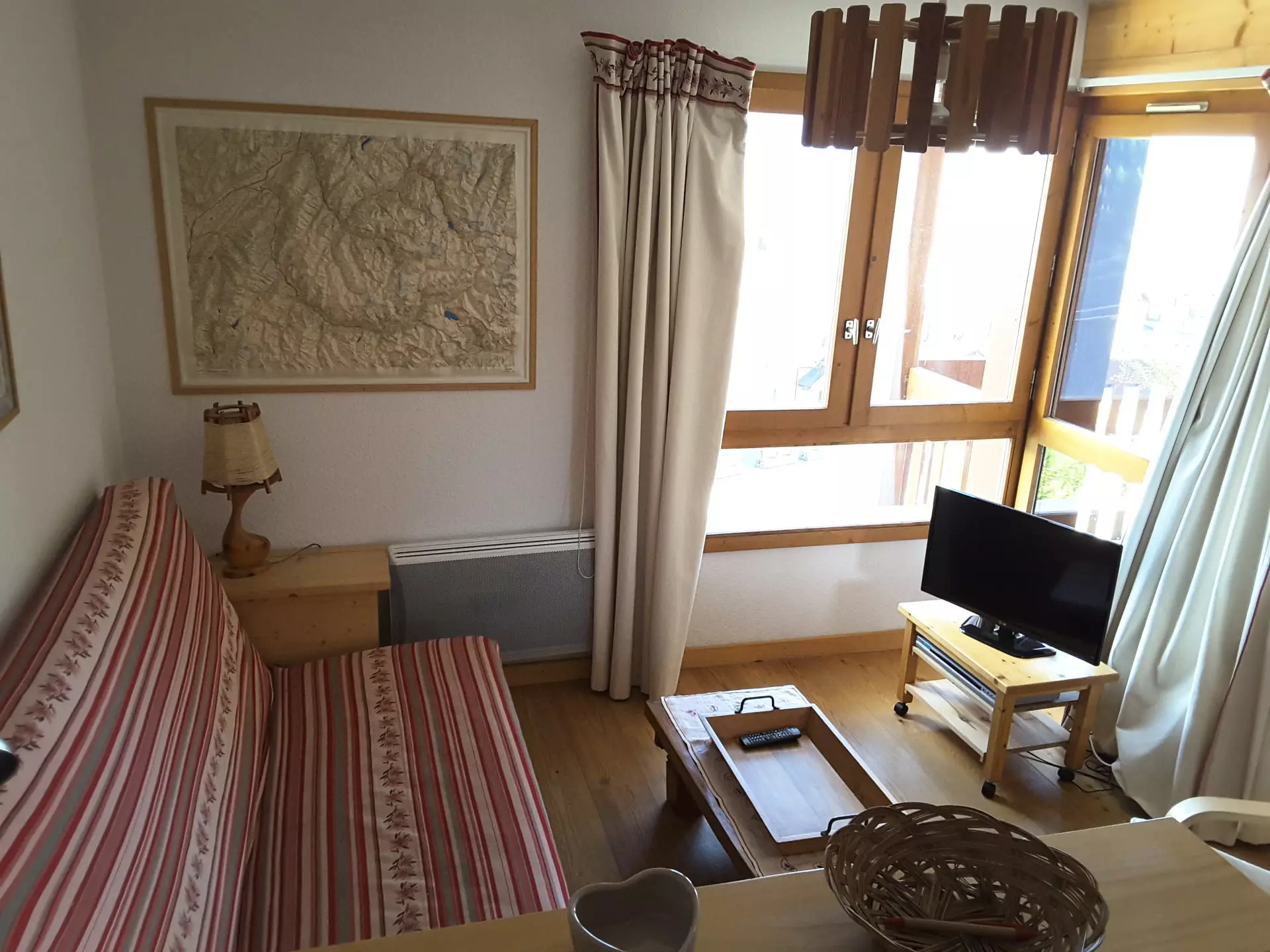 Apartment of 36m², in a residence located in the heart of Plan Peisey. Rented for 4 to 6 people, it consists of a bedroom with 1 double bed, a mountain alcove with two bunk beds, a bathroom (with washing machine) and separate toilet, and a kitchen area open to the living room.
