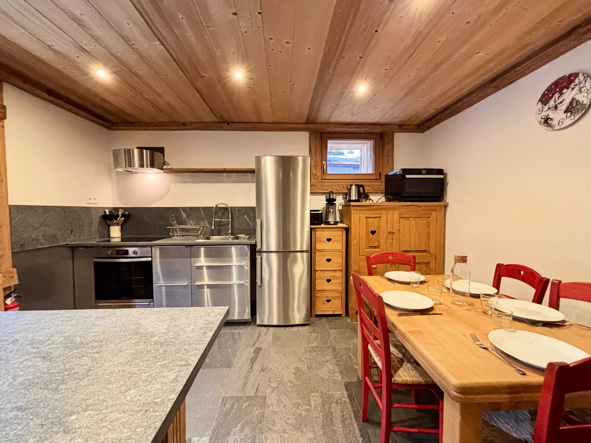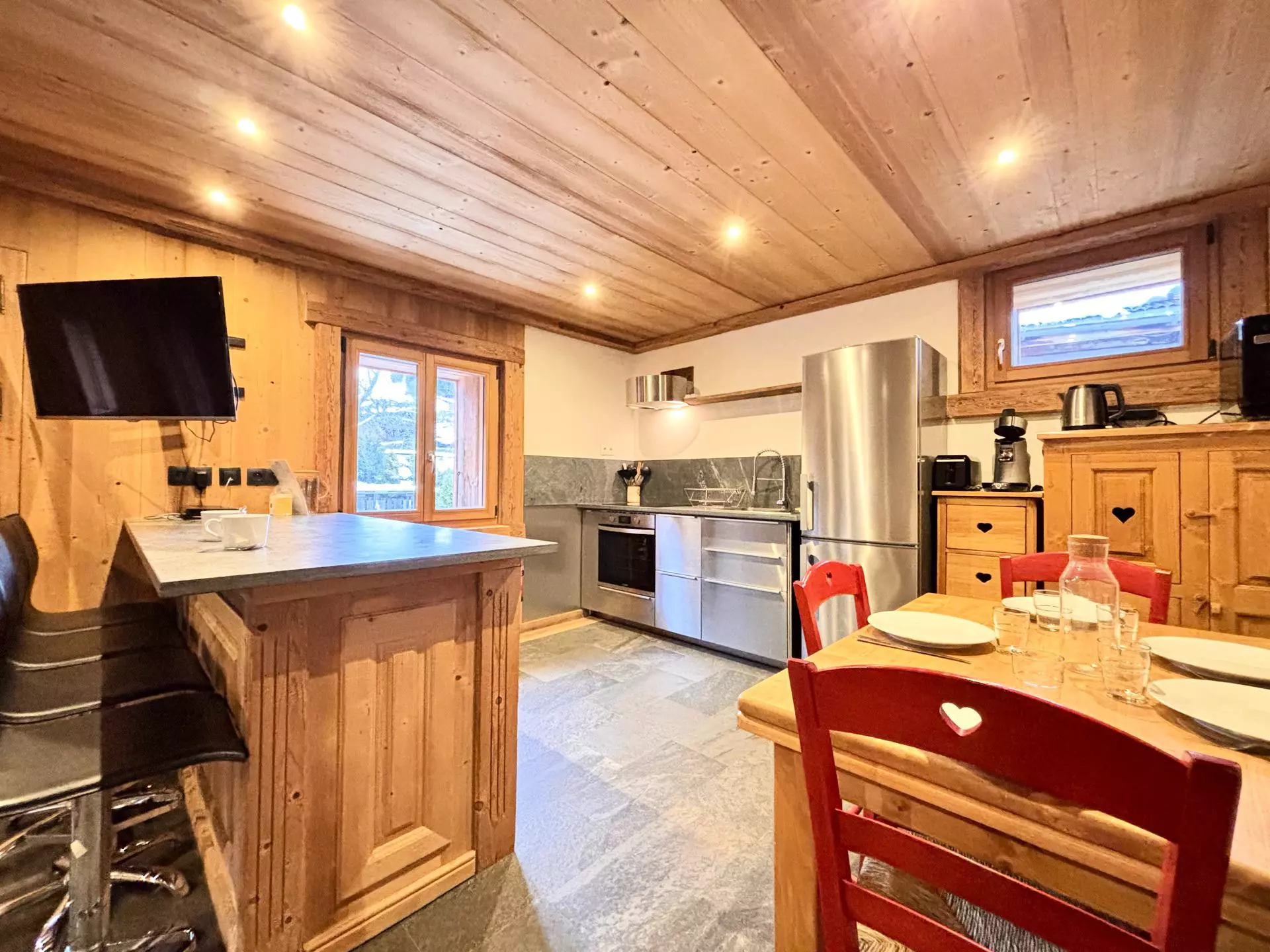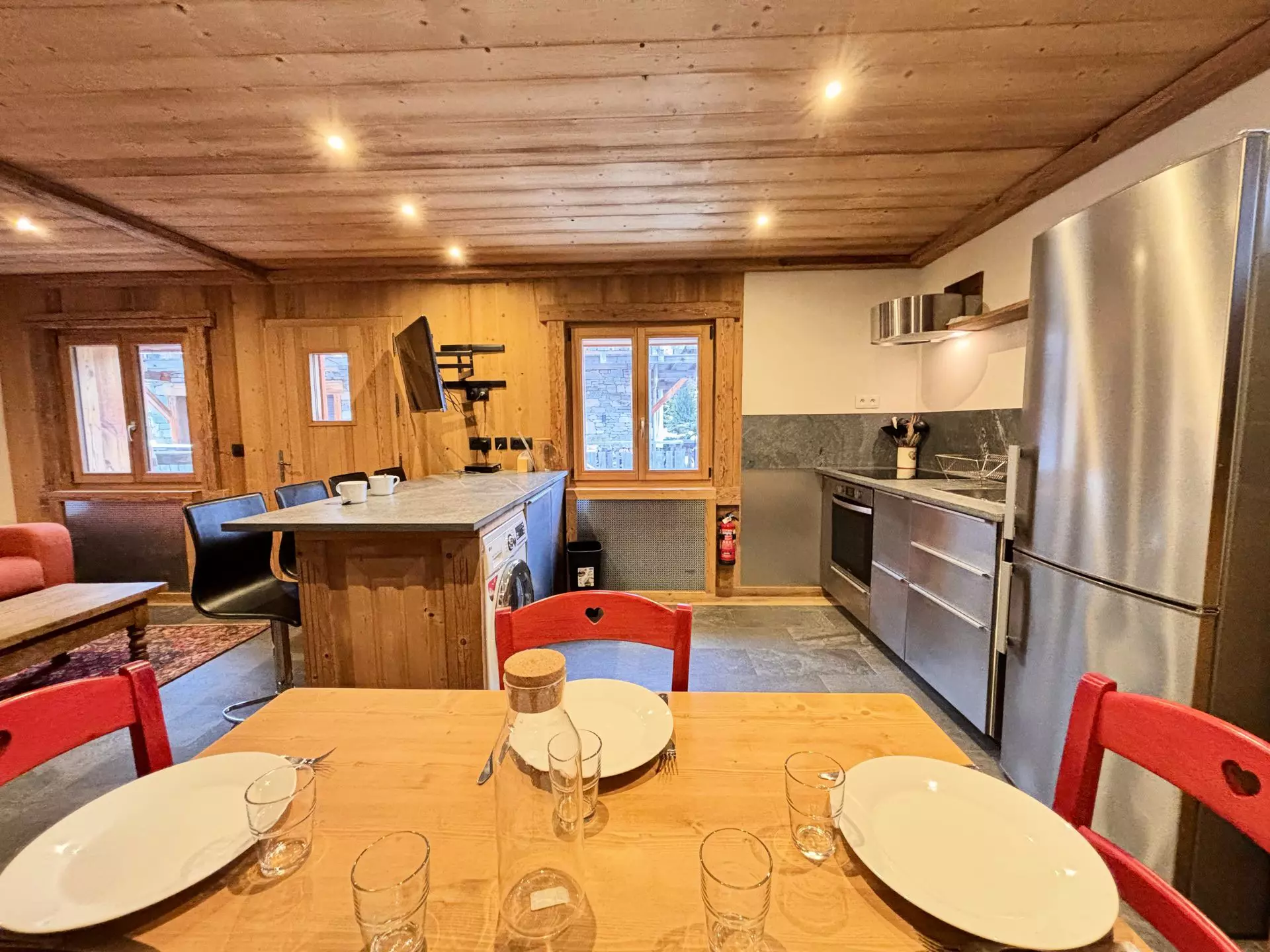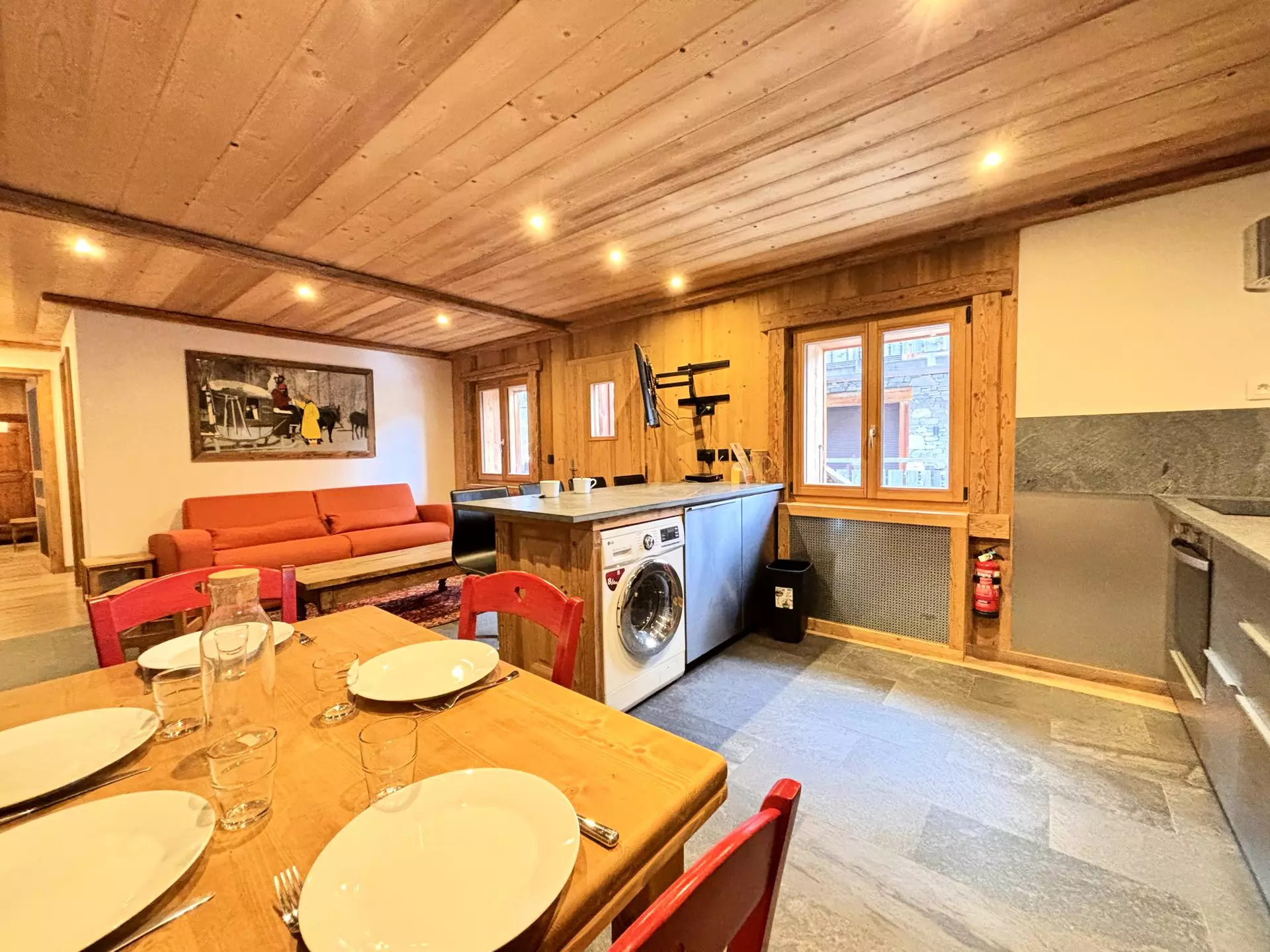 - Fully equipped open-plan kitchen: 4 induction hobs, oven, microwave, refrigerator, freezer, dishwasher, washer/dryer