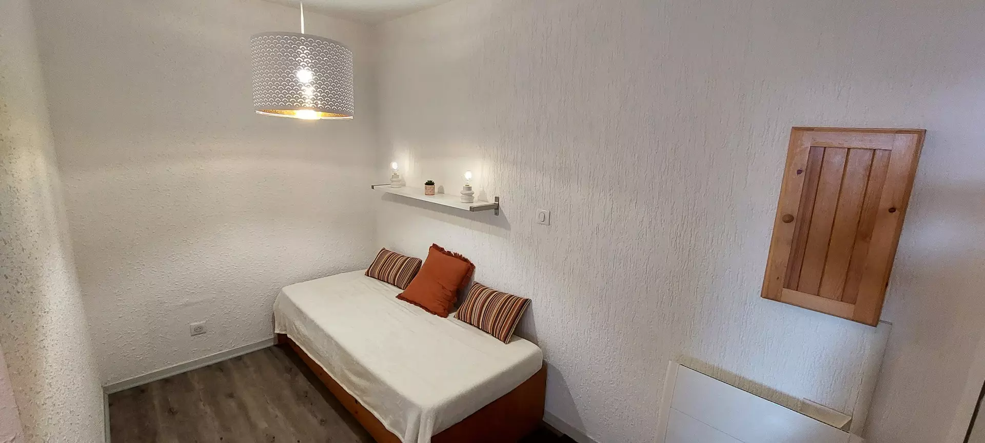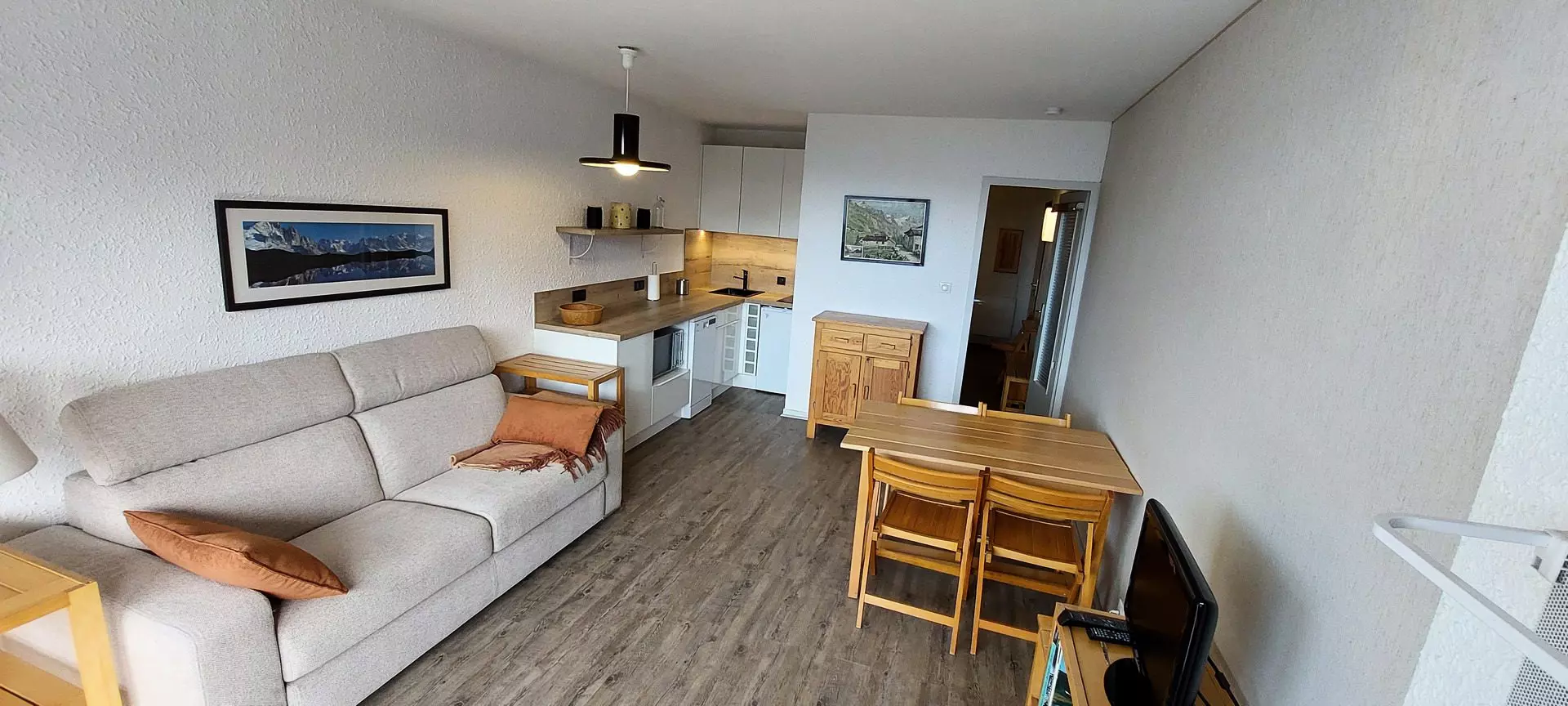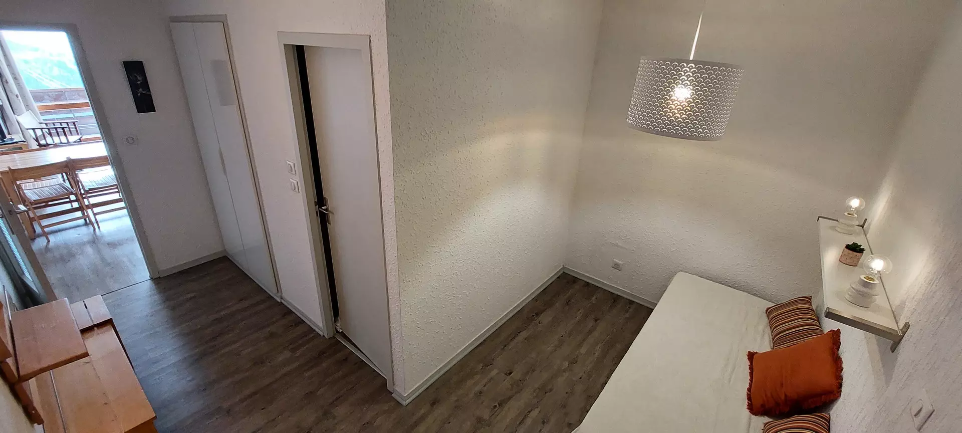 The apartment consists of an entrance with an alcove containing a set of pull-out beds, a shower room with toilet, an open kitchen area (fully renovated) opening onto the living room with a sofa bed for 2 people and a west-facing balcony offering magnificent views over the entire valley.