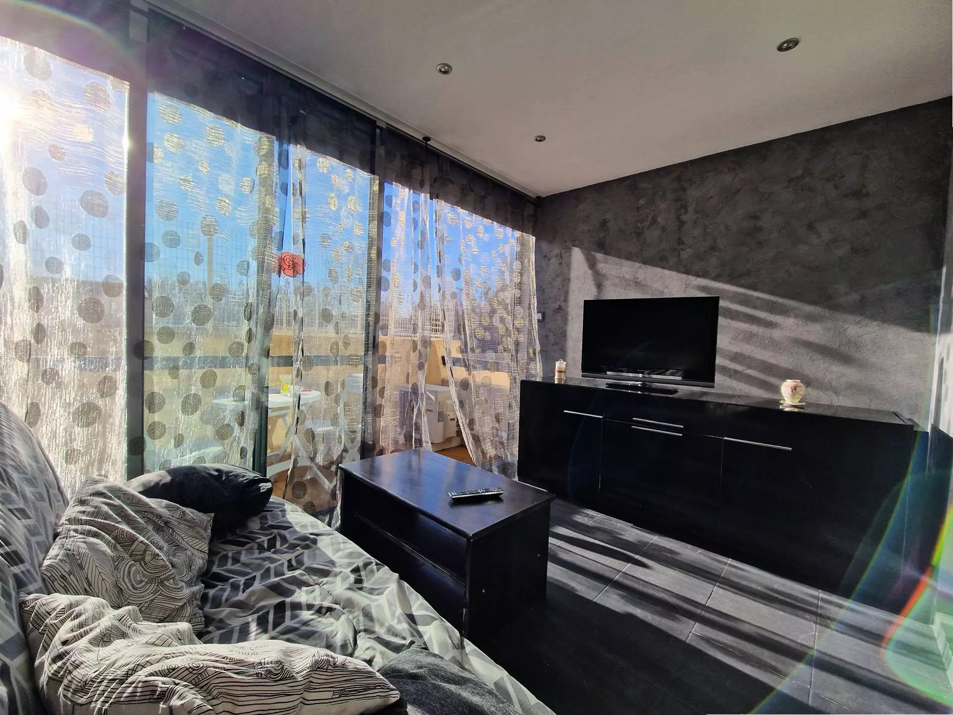 Pleasant veranda with sofa, furniture and television.