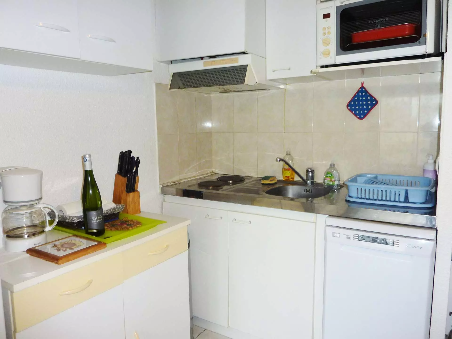 Open-plan fitted kitchen: fridge/freezer, washing machine, dishwasher, microwave, electric hob, mini oven and electric coffee maker.