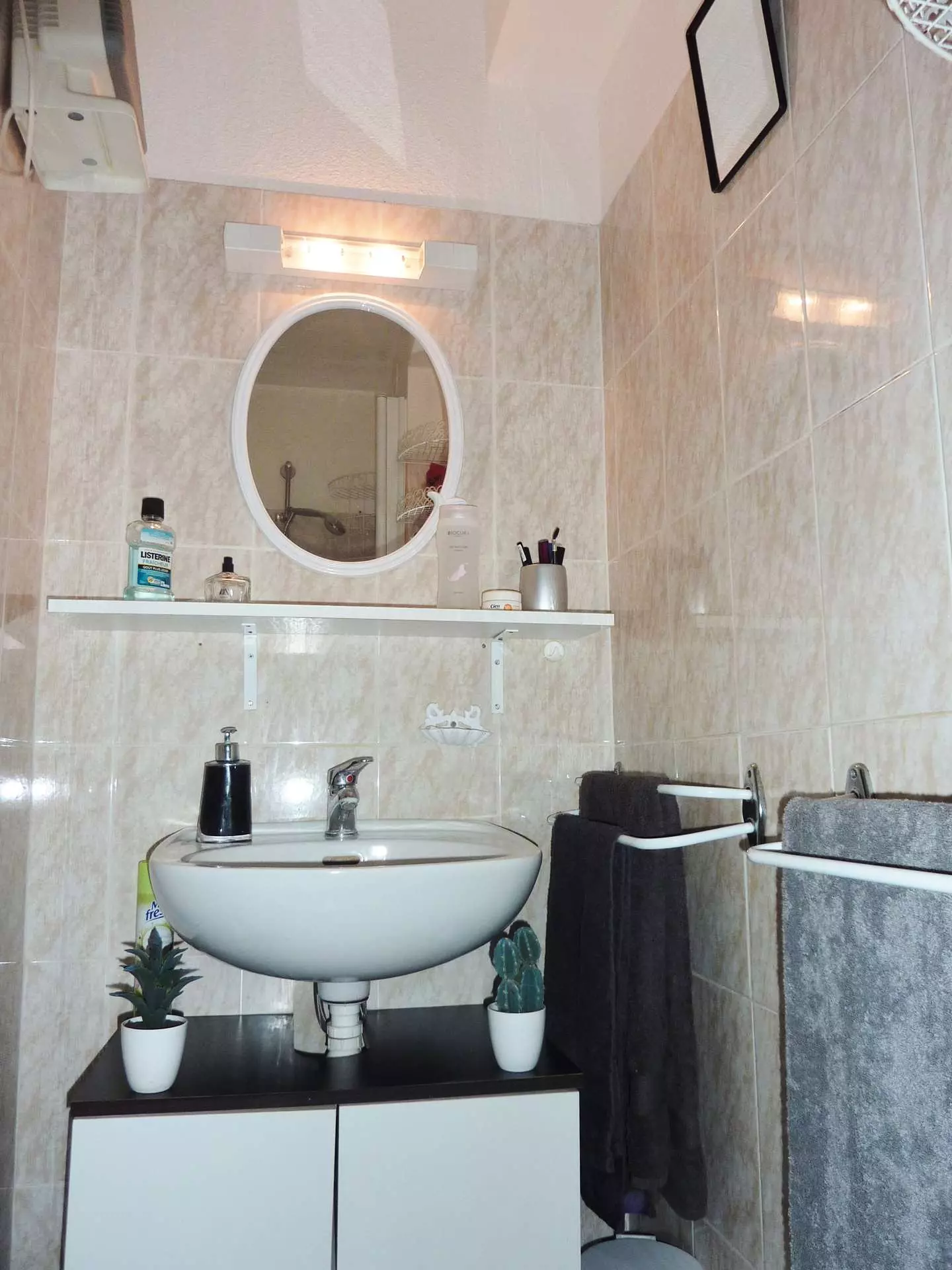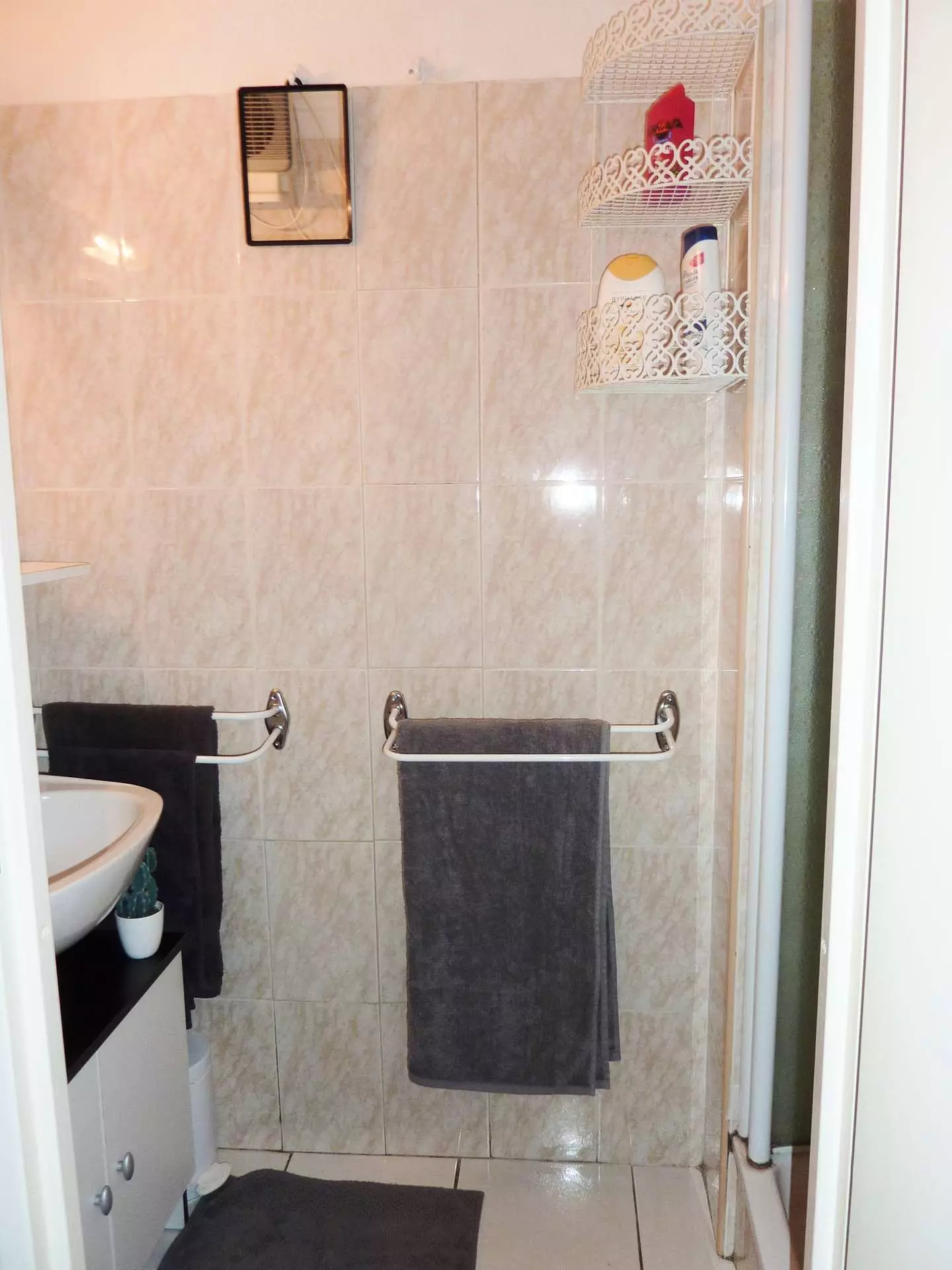 Bathroom with shower and sink, separate WC.
