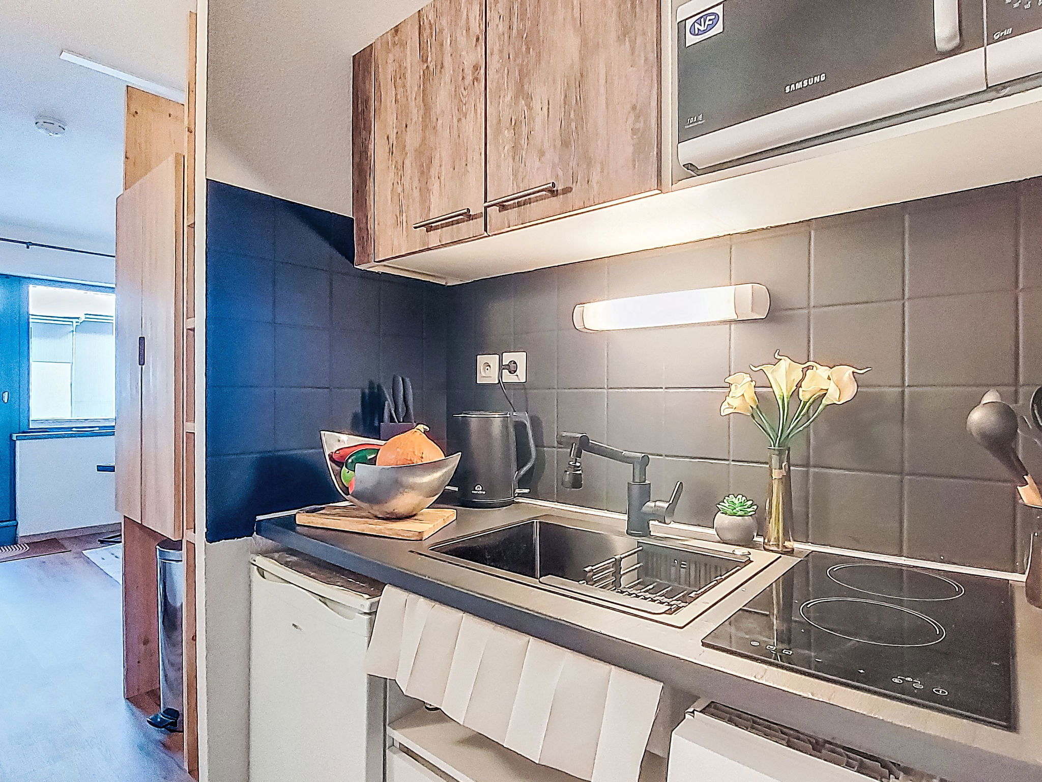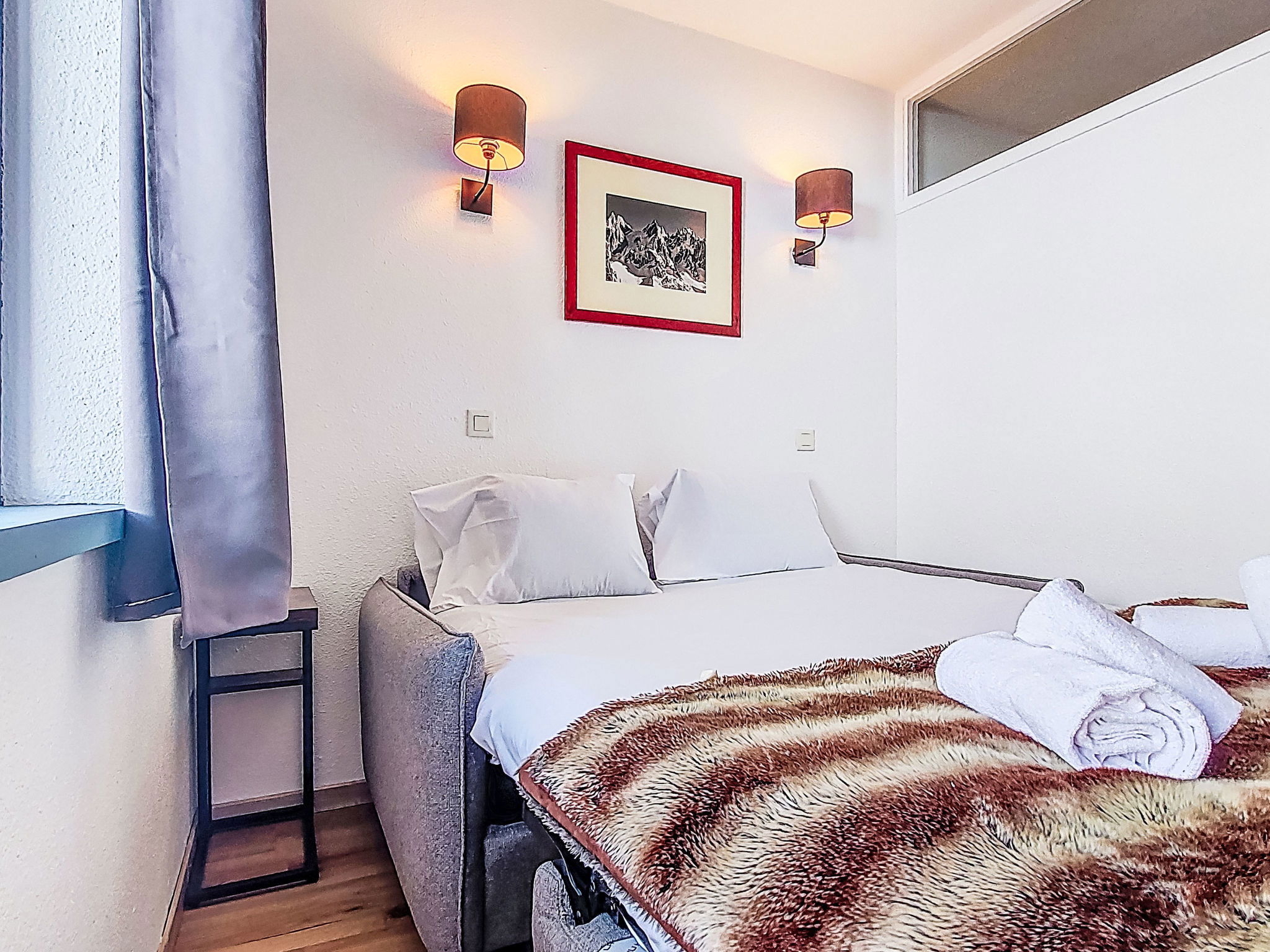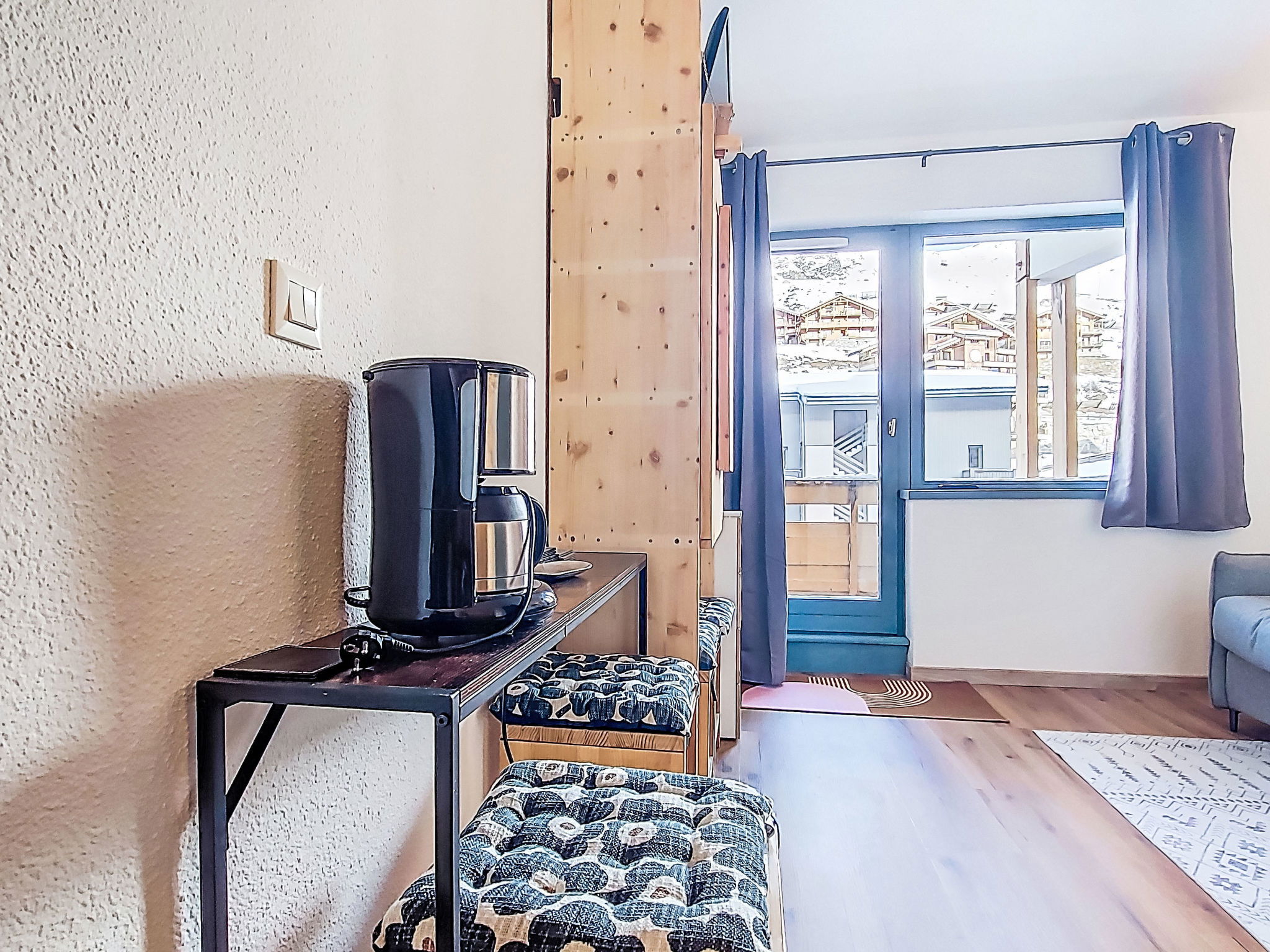 1-room studio 21 m2 on 2nd floor, north facing position. Partly renovated in 2025, modern and cosy furnishings: living/dining room with 1 double sofabed (1 x 140 cm, length 190 cm), dining table and TV (flat screen), electric heating. Exit to the balcony, north facing position. Entrance hall with kitchen corner. Sleeping alcove with 1 x 2 bunk beds (80 cm, length 190 cm). Kitchenette (dishwasher, 2 induction hot plates, toaster, kettle, electric coffee machine, combination microwave). Bathroom, sep. WC. Parquet floors. Small balcony 3 m2, north facing position. Beautiful view of the mountains, the valley and the resort. Facilities: Internet (WiFi, extra). Please note: non-smokers only. Offer by a private individual according to Art. 155, IV of CGI.