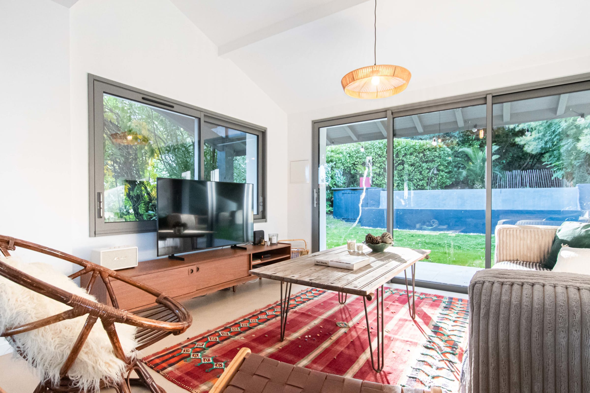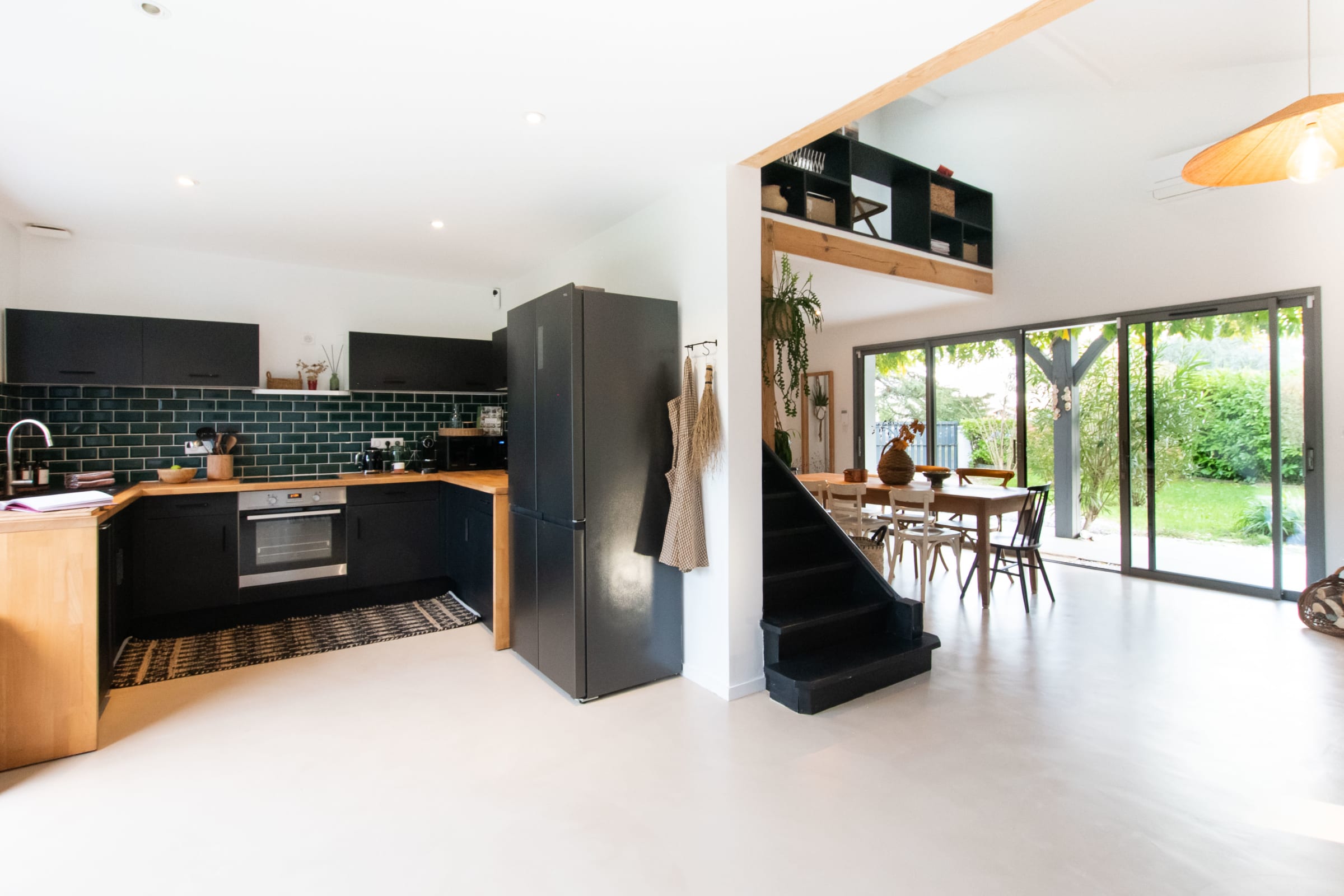 The modern, fully equipped kitchen opens onto a large, light-filled living room with wide glass doors leading to the terrace and landscaped garden.