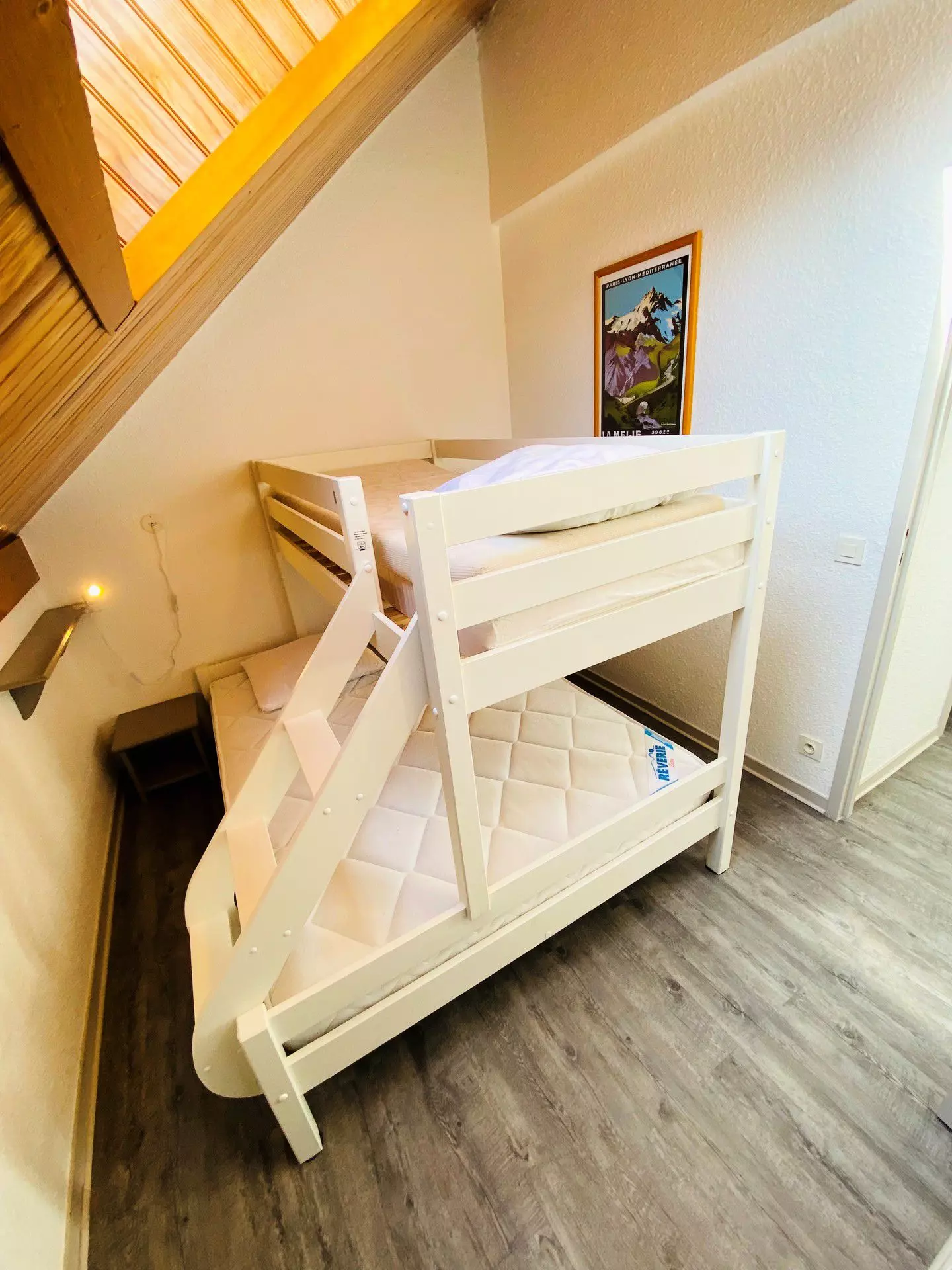 - Bedroom 2 (upstairs): 1 double bed (140x190) + 1 single bunk bed (90x190)