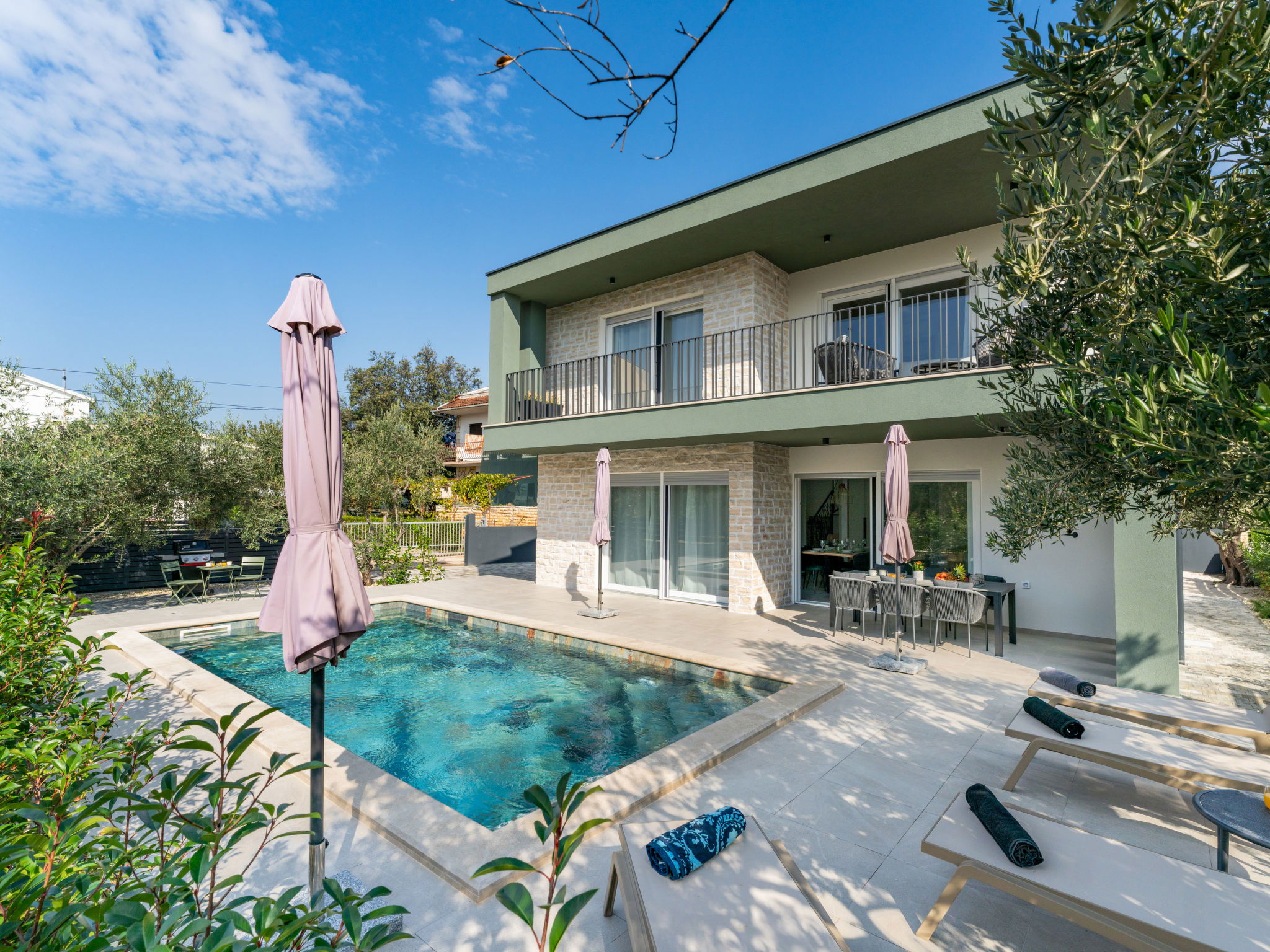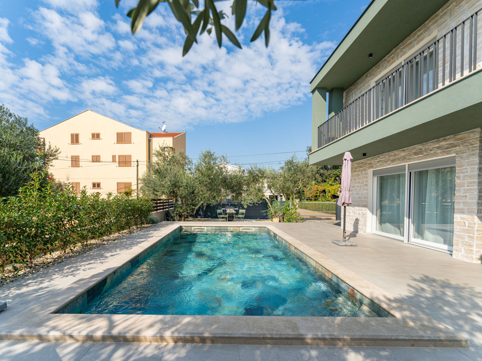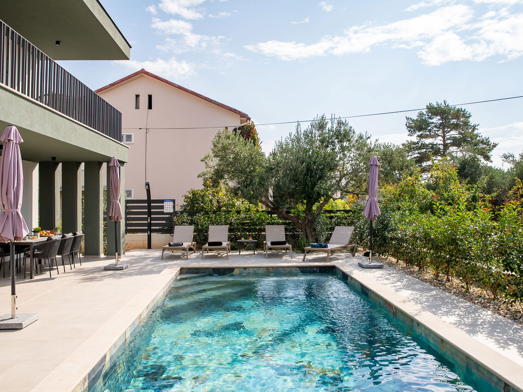 Modern single-family house "Amala", 2 storeys. 2.5 km from the centre of Sukošan, in a quiet, sunny position, 100 m from the sea, 100 m from the beach. Private: property 600 m2 (fenced), swimming pool angular, heated (8 x 4 m, depth 145 cm, seasonal availability: 01.May. - 30.Sep.) with internal staircase. Outdoor shower, garden furniture, barbecue. In the house: internet access, washing machine. Parking (for 2 cars) at the house on the premises. Shop 50 m, restaurant 300 m, bus stop 250 m, pebble beach 100 m. Groups of teenagers on request only.