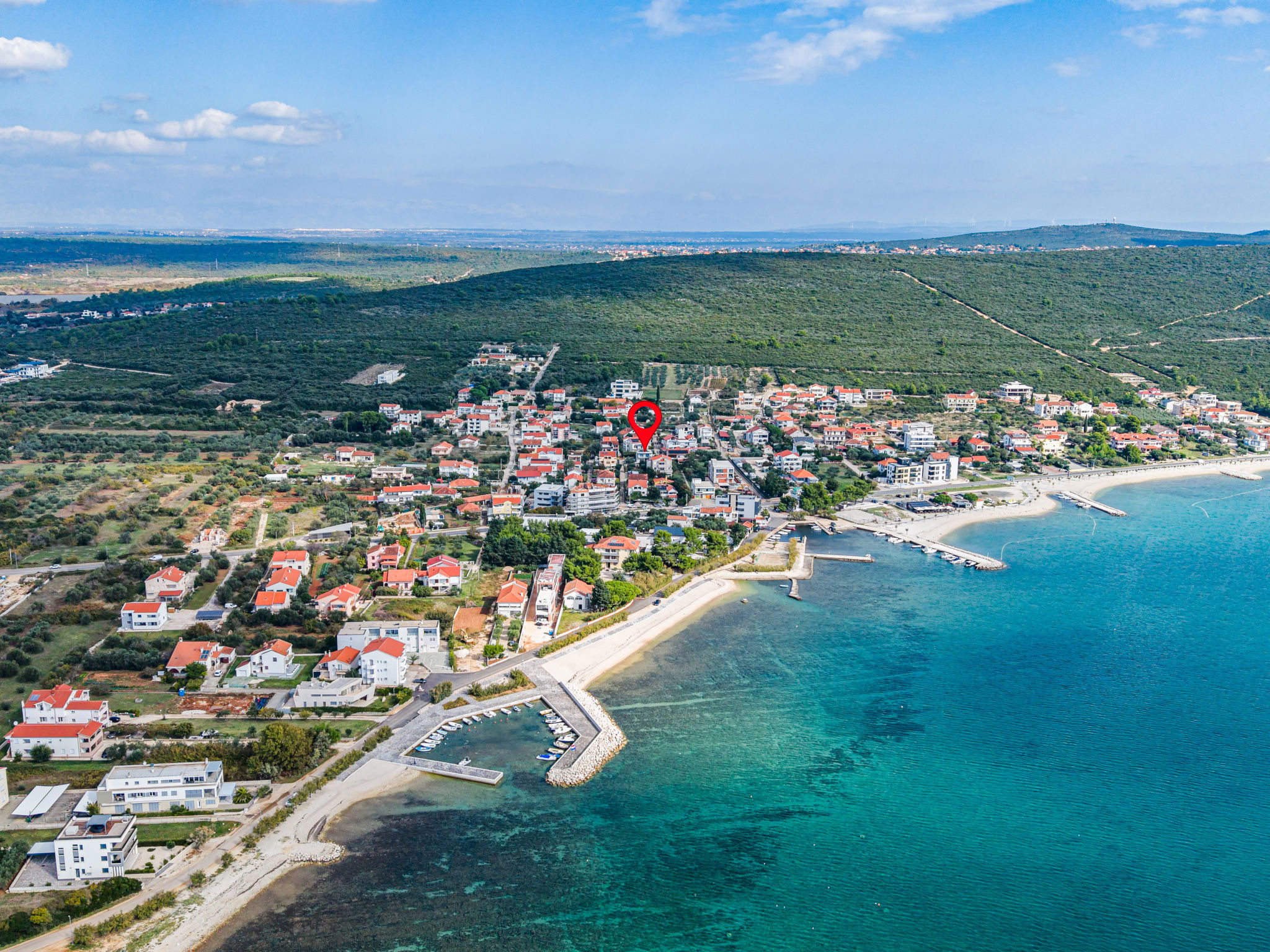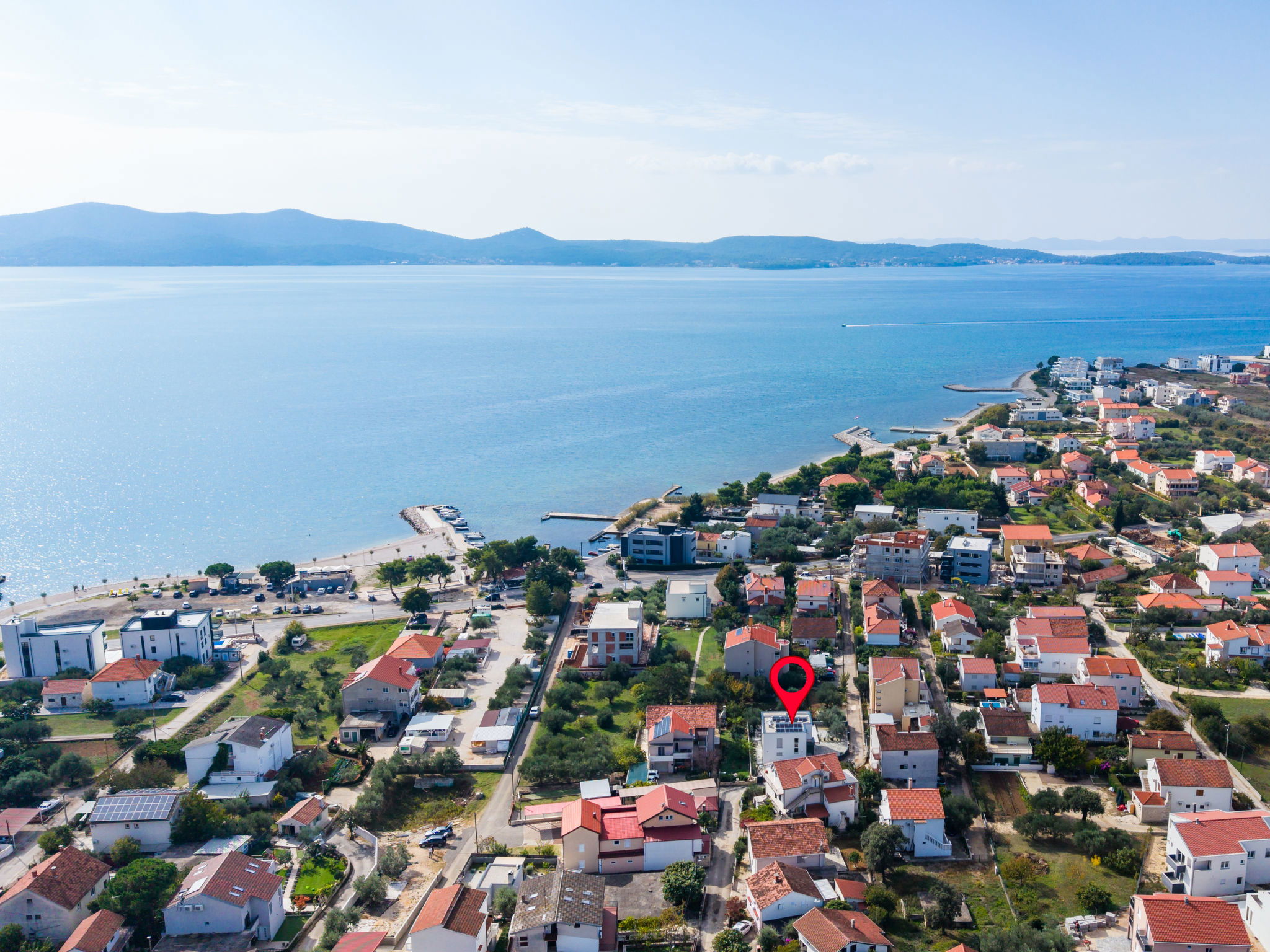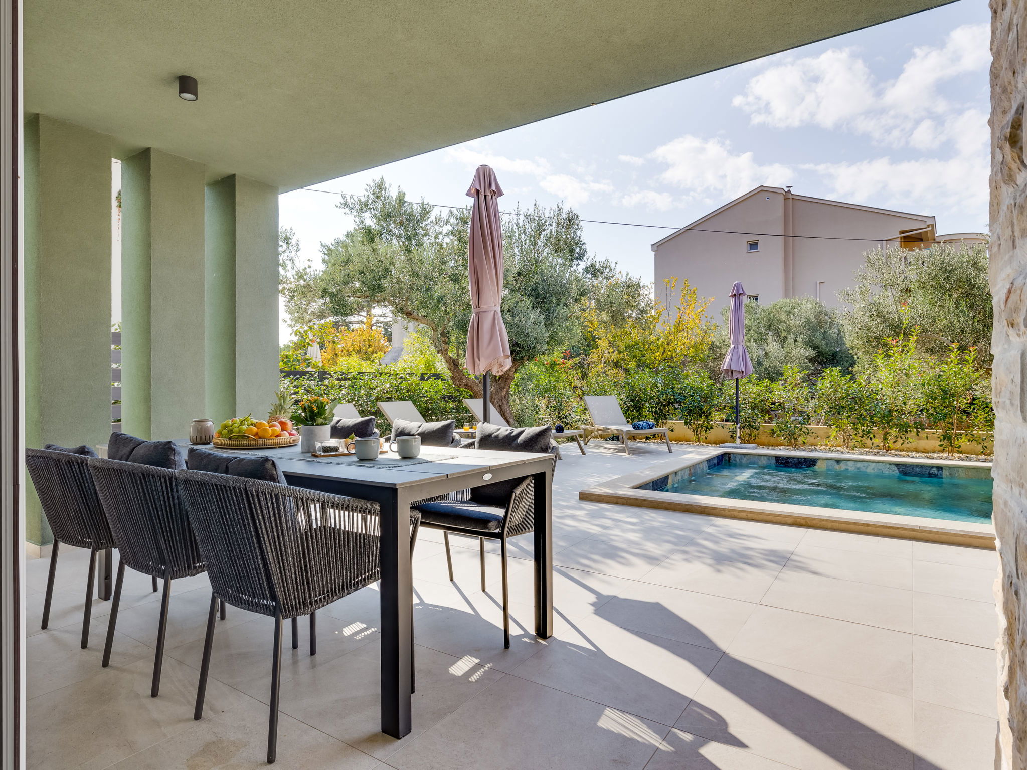 Modern single-family house "Amala", 2 storeys. 2.5 km from the centre of Sukošan, in a quiet, sunny position, 100 m from the sea, 100 m from the beach. Private: property 600 m2 (fenced), swimming pool angular, heated (8 x 4 m, depth 145 cm, seasonal availability: 01.May. - 30.Sep.) with internal staircase. Outdoor shower, garden furniture, barbecue. In the house: internet access, washing machine. Parking (for 2 cars) at the house on the premises. Shop 50 m, restaurant 300 m, bus stop 250 m, pebble beach 100 m. Groups of teenagers on request only.
