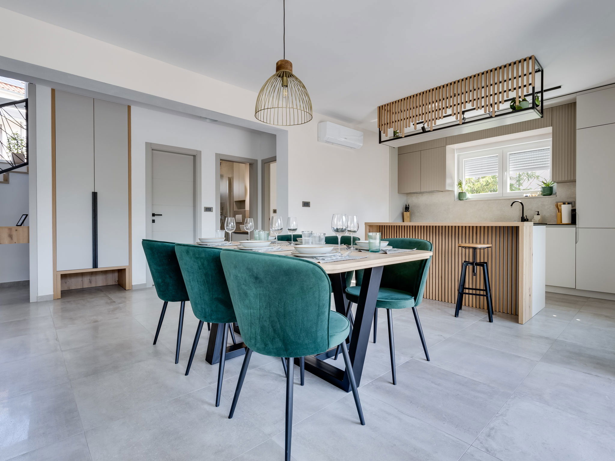4-room house 160 m2 on 2 levels. Modern furnishings: living/dining room with satellite TV (flat screen), air conditioning. Exit to the swimming pool. Open kitchen (oven, dishwasher, 4 induction hot plates, freezer, electric coffee machine). Shower/WC. Upper floor: 2 rooms, each room with 1 french bed (160 cm, length 200 cm), shower/WC and satellite TV (flat screen), air conditioning. Exit to the terrace. 1 room with 1 bed (120 cm, length 200 cm), satellite TV (flat screen), air conditioning. Floor heating, forced-air heating (extra). Balcony 15 m2. Deck chairs (5). Facilities: Internet (WiFi, free). Please note: non-smoking house.