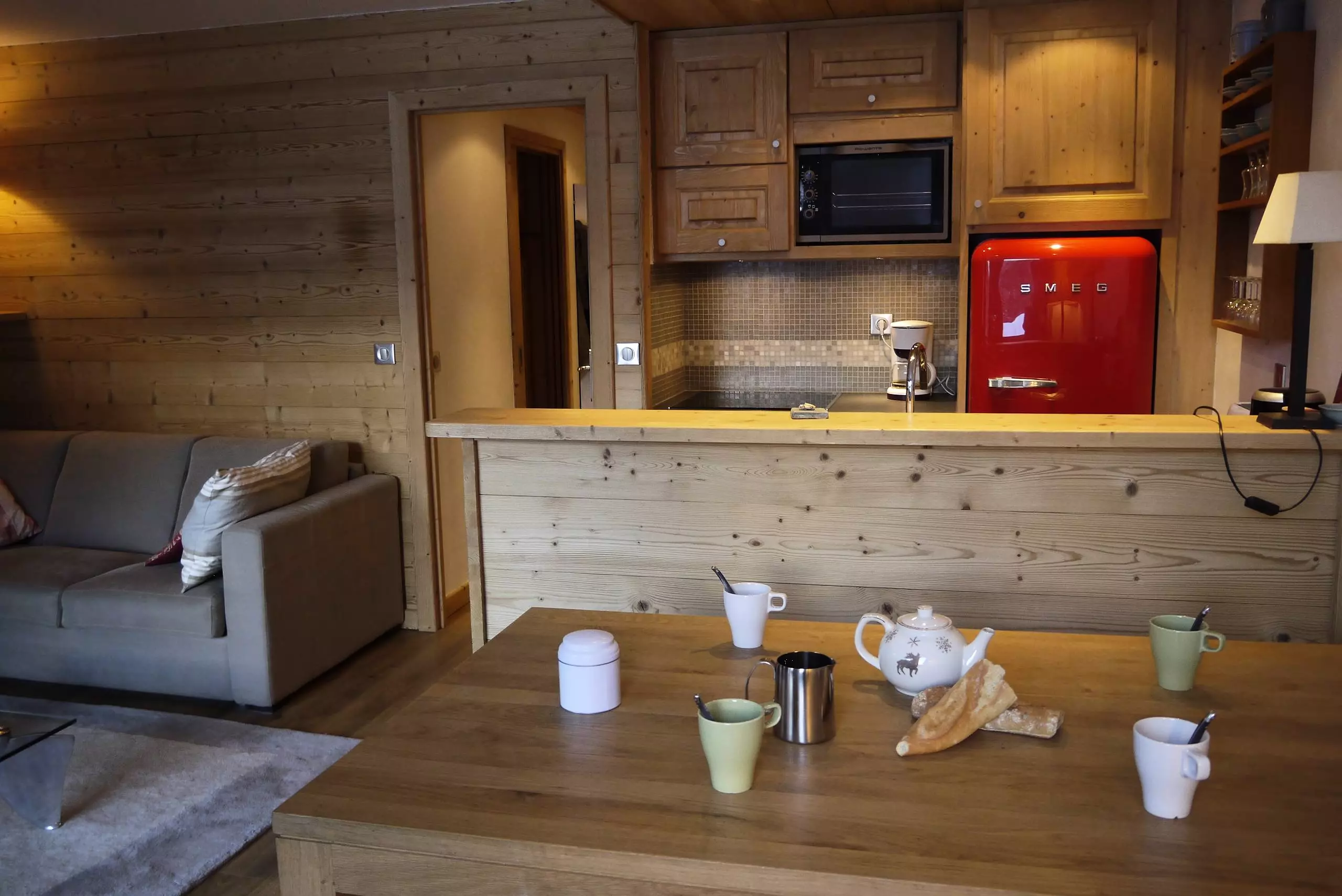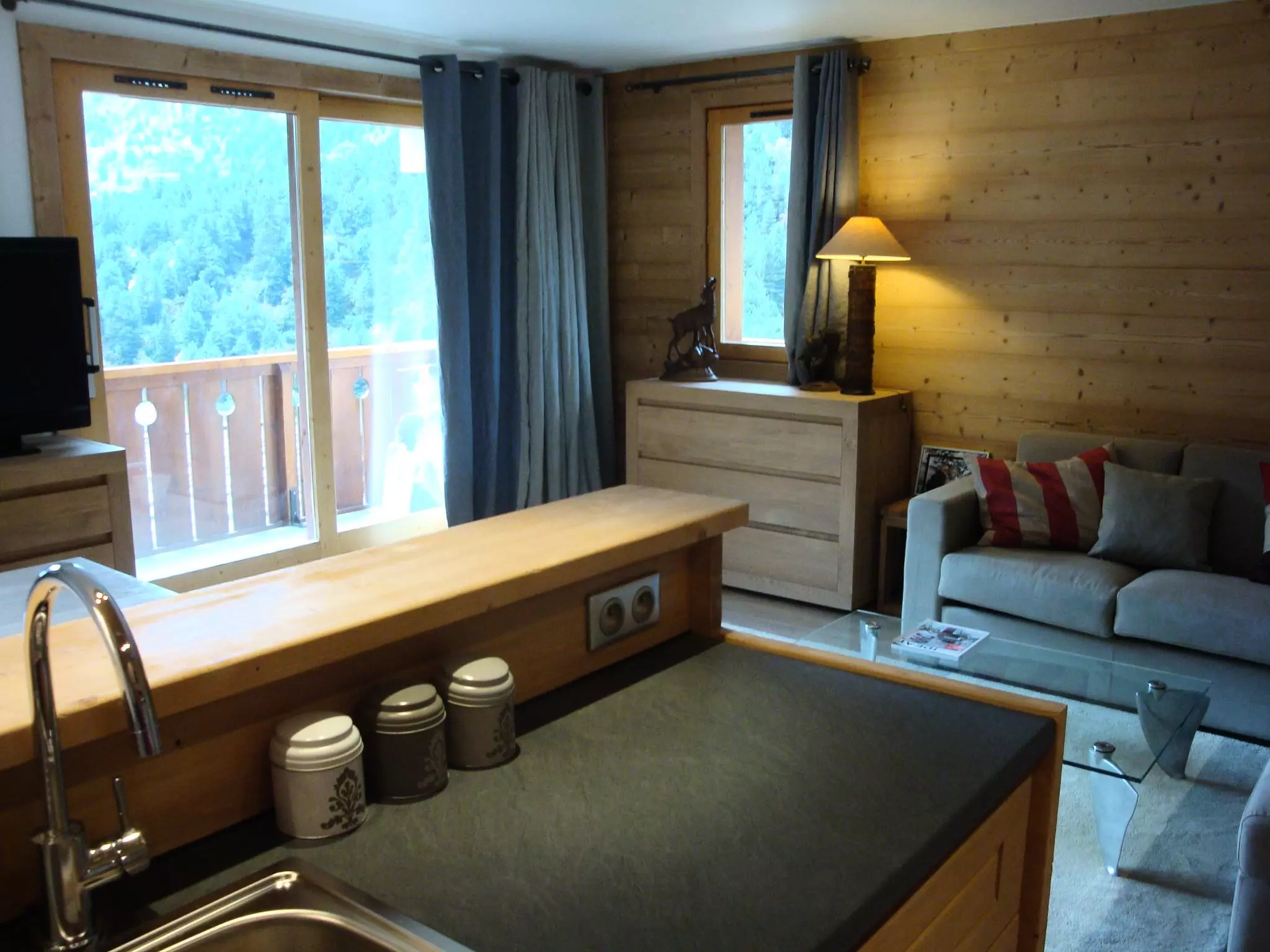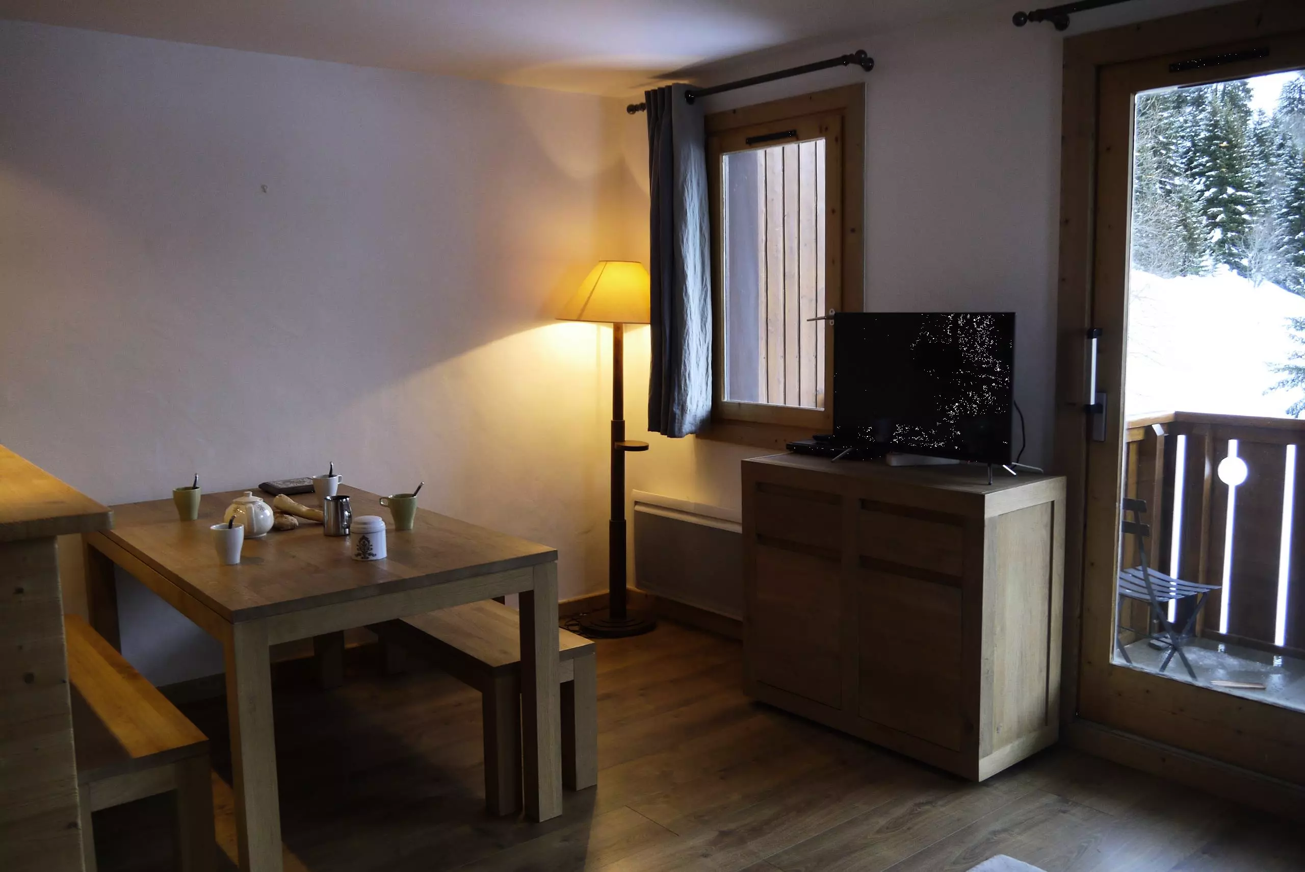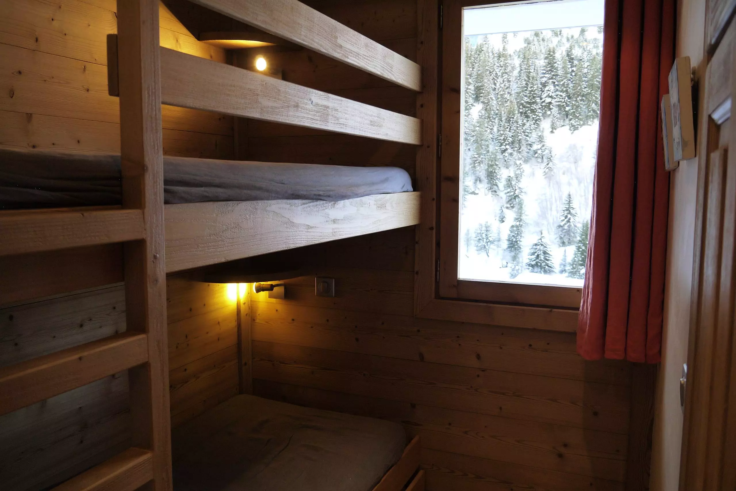 The living room has a sofa bed (160x190) and a television. There is one bedroom with a double bed (140x190) and an en-suite shower room. A cabin bedroom has a set of bunk beds and a pull-out bed (80x190). The open-plan kitchen is equipped with a ceramic hob, microwave, oven, dishwasher, refrigerator, coffee maker, and toaster. There is a shower room with a washer/dryer and a separate WC. A southwest-facing balcony and a ski locker are available in the building. Private Wi-Fi access is provided. This is a non-smoking apartment and pets are not allowed. Located on level -1