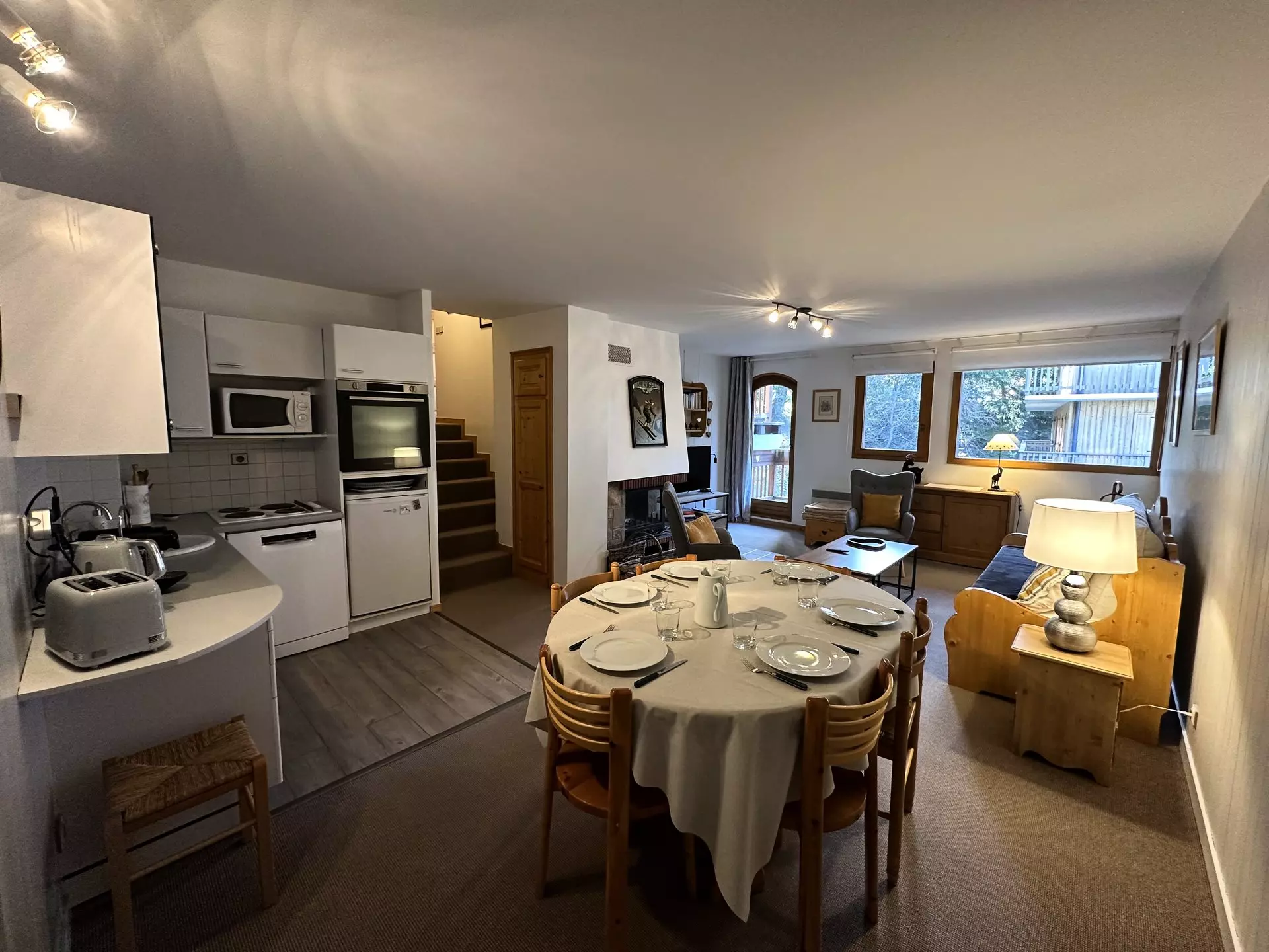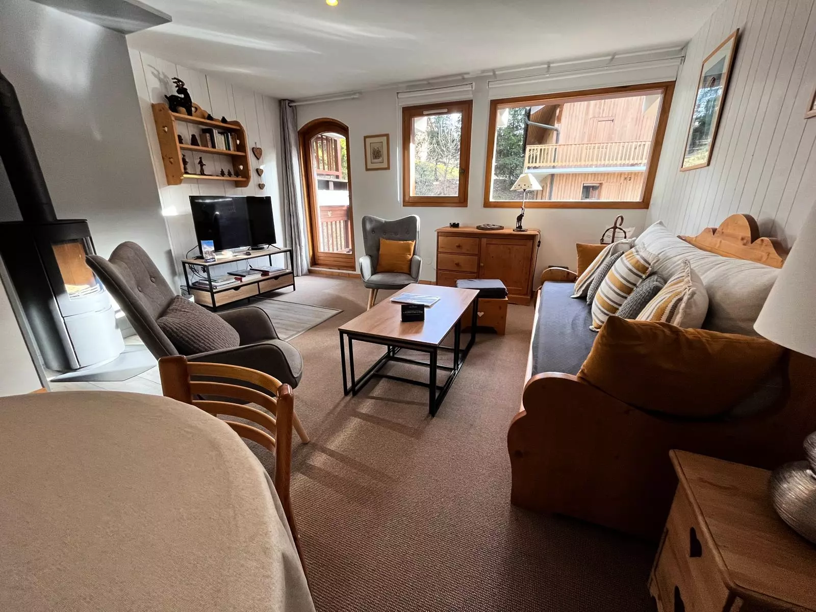 Living room with flat screen TV, ground-floor access to the balcony and its magnificent brand-new wood-burning stove, perfect for enjoying a cozy spot after a great day of skiing.