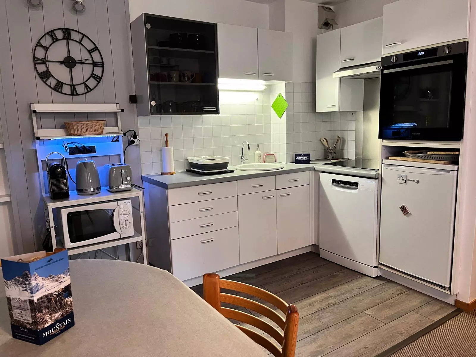 Open-plan fitted kitchen: 4 electric hobs, kettle, toaster, Nespresso coffee machine, dishwasher, oven and microwave