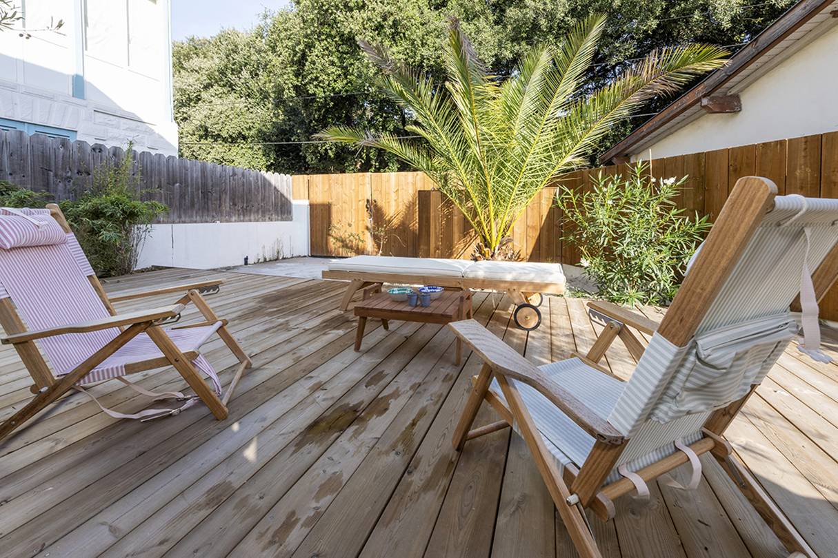 The exterior of the house is surrounded by beautiful wooden terraces with landscaped areas. An outdoor shower allows you to rinse off, ideal for returning from the beach with children. An outdoor table for meals on the terrace and a lounge area with sunbeds complete the exterior of the house.