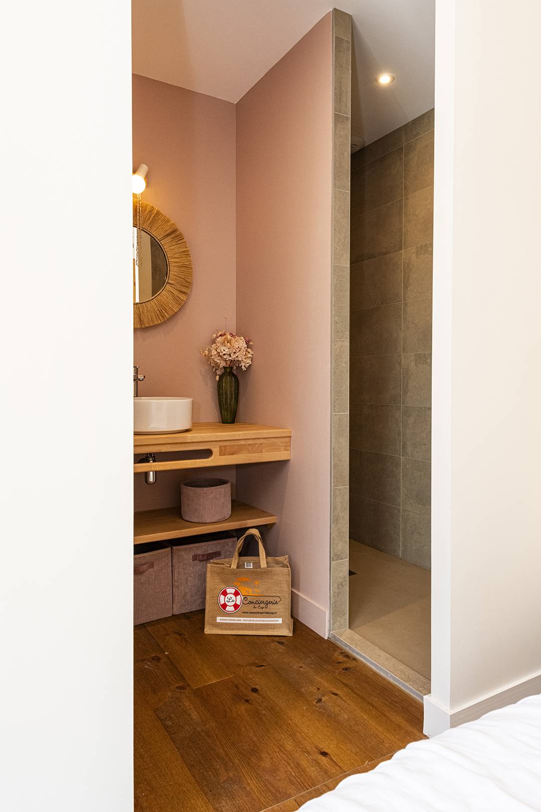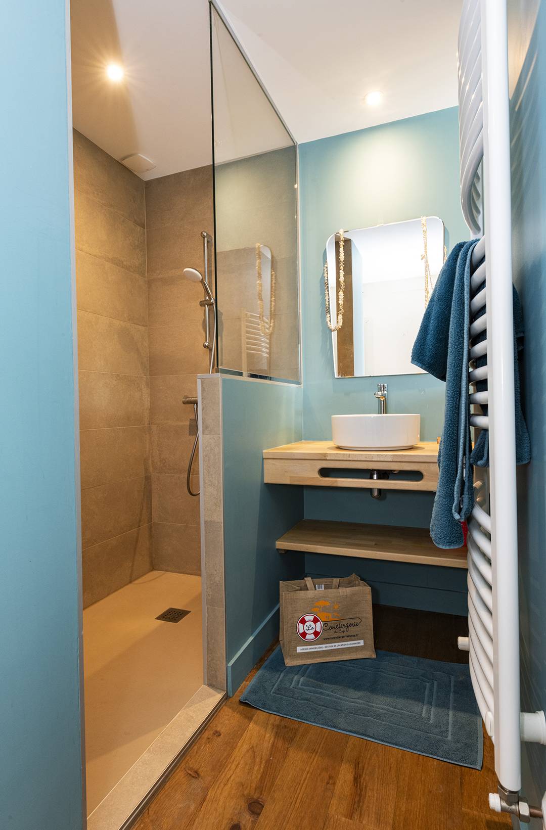 - 1 Suite avec 2 lits en 90 pouvant être réunis pour faire lit king size en 180, accompagné d'une salle d'eau avec douche.