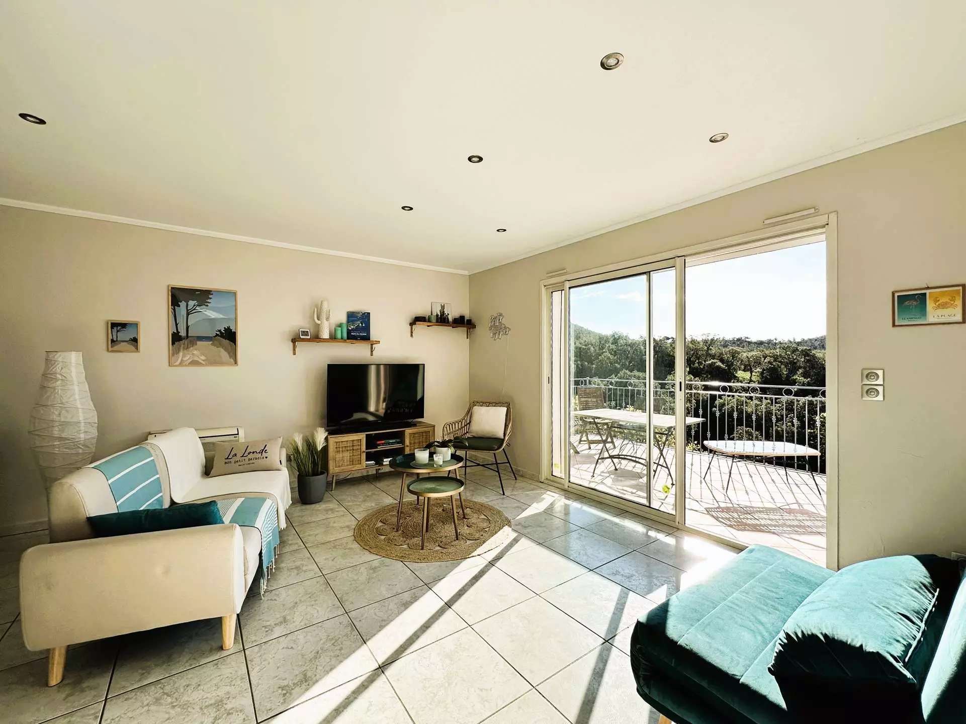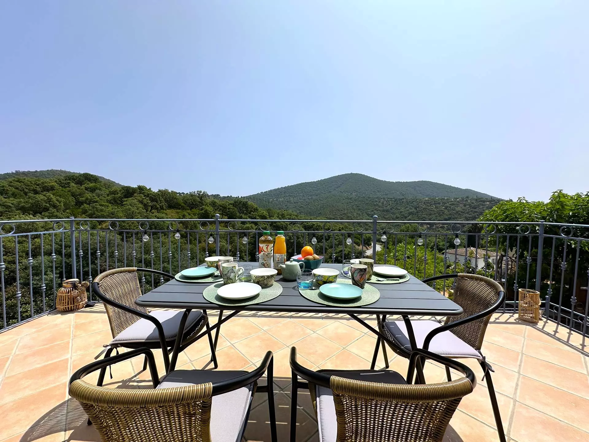 Inside, a living/dining room opens onto a south/east facing terrace, benefiting from a large awning and a beautiful view of the hills.