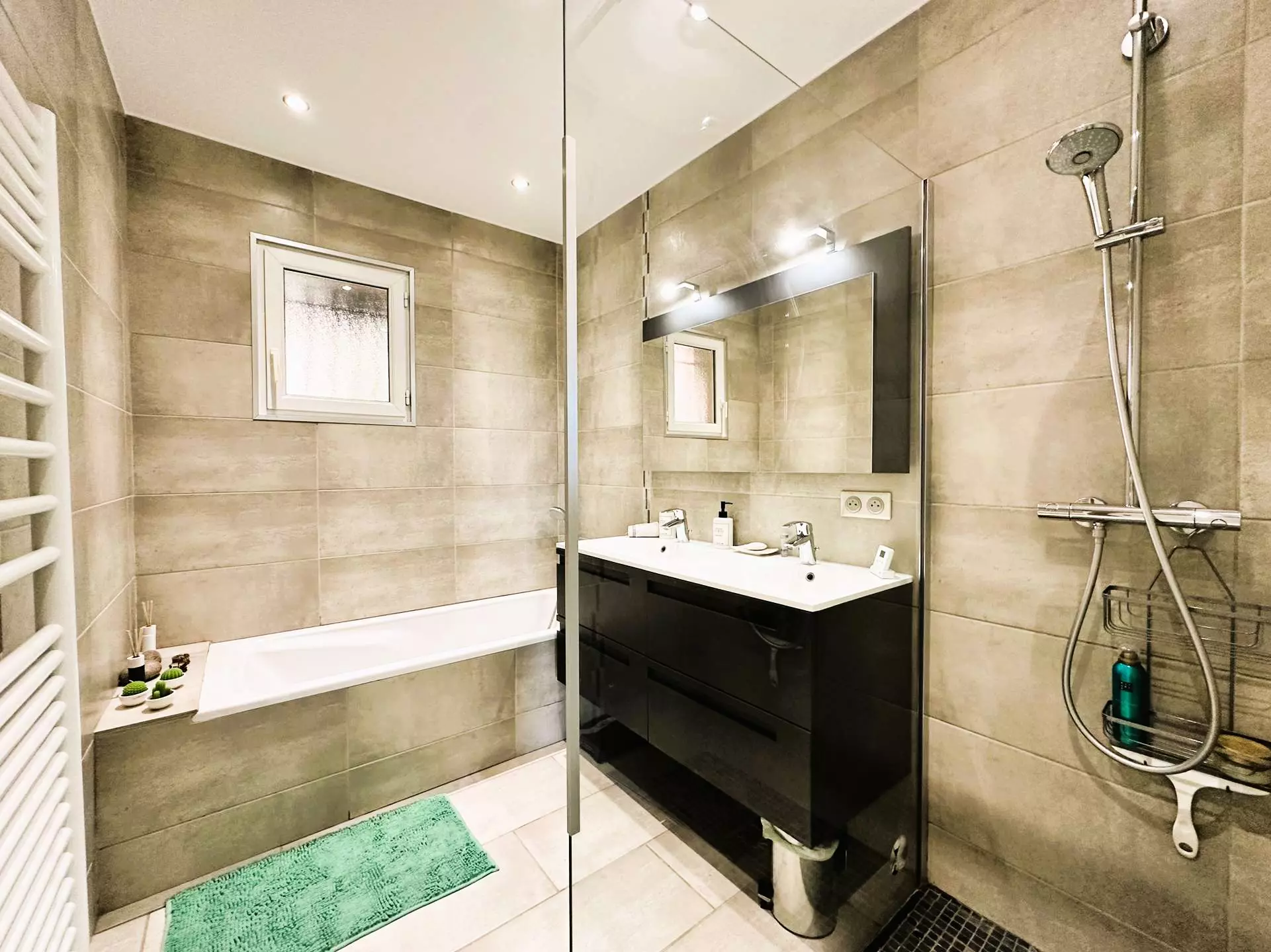 In the sleeping area on the same level, there is an air-conditioned double bedroom with a king-size bed (200x200cm) and a wardrobe. There is also a second double bedroom with a double bed (140x190cm) and a wardrobe, and a bedroom with two single beds (90x200cm) and a wardrobe. A bathroom with a shower and a separate toilet complete the accommodation.