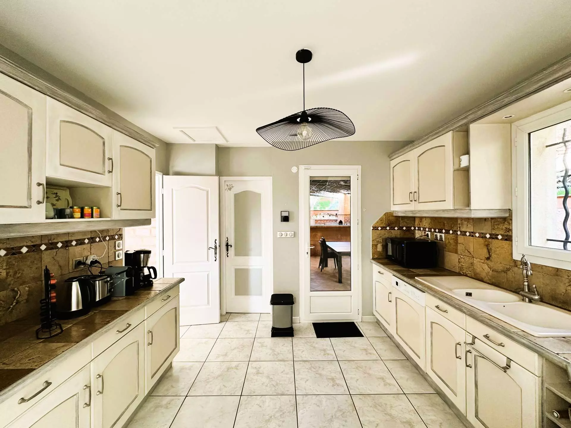 A fully equipped kitchen (electric oven, hob, dishwasher, Nespresso and filter coffee machines, toaster, kettle, etc.) opens onto a shaded terrace at the rear of the villa, perfect for summer lunches with family or friends. A pantry is also available.
