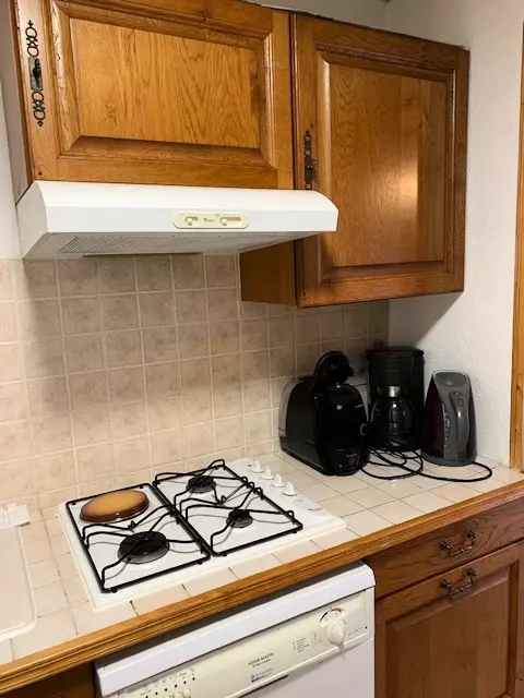 Open kitchen: oven, microwave, dishwasher, refrigerator (122L) / freezer (40L), 3 gas burners + 1 electric hob.