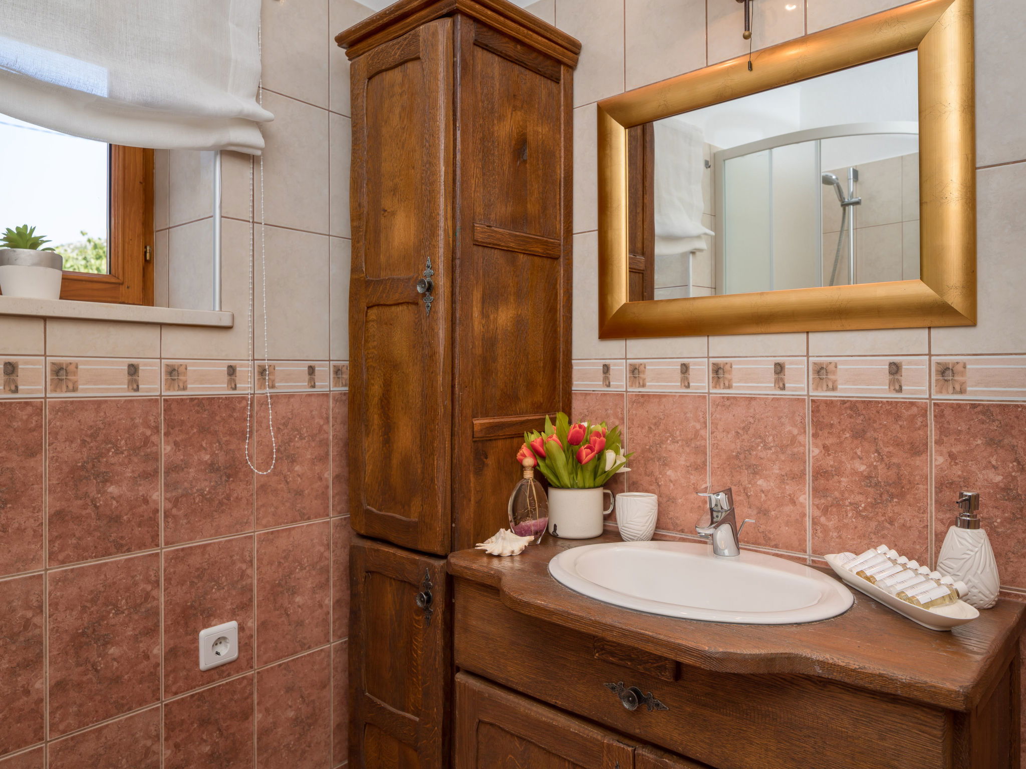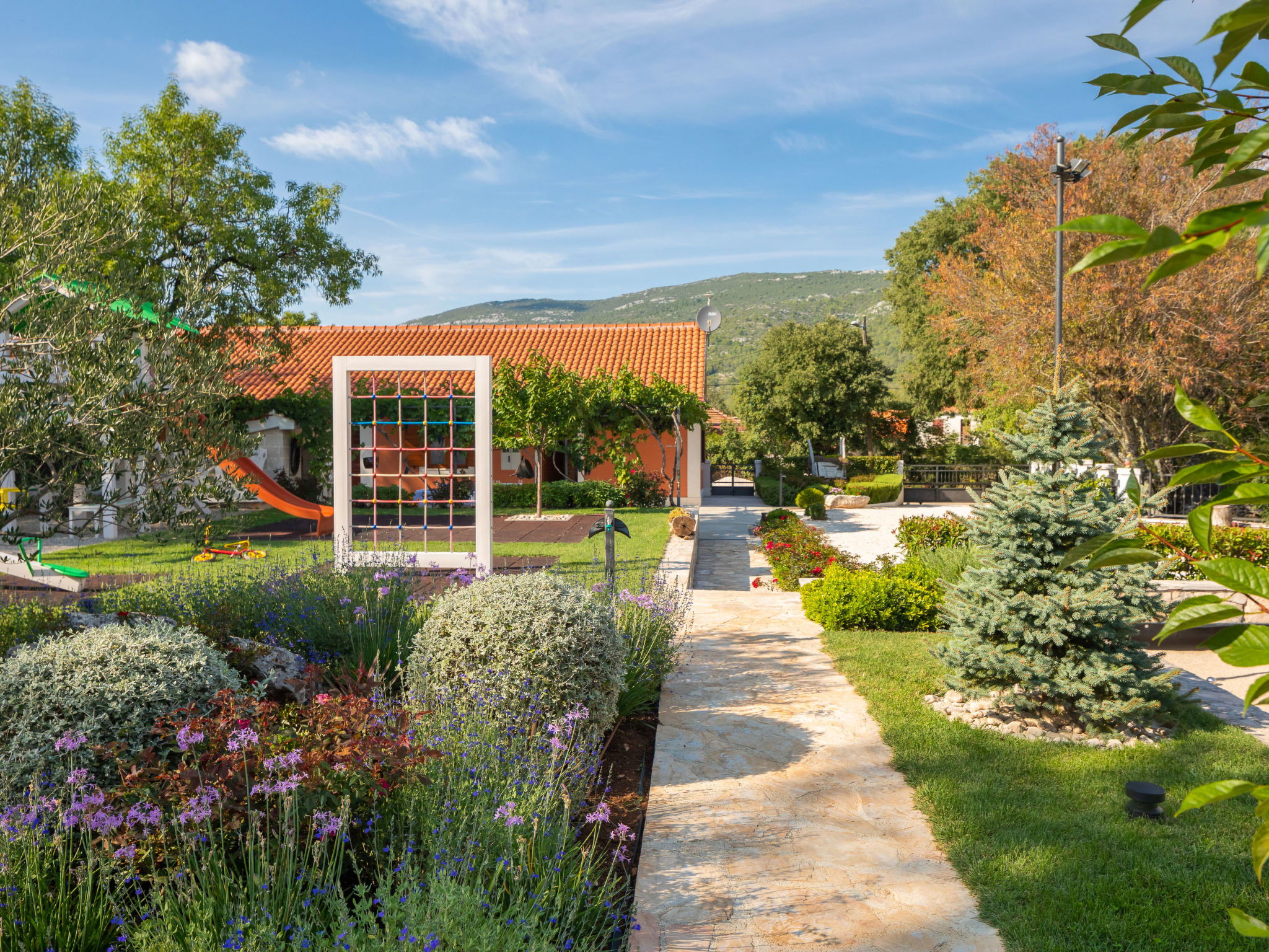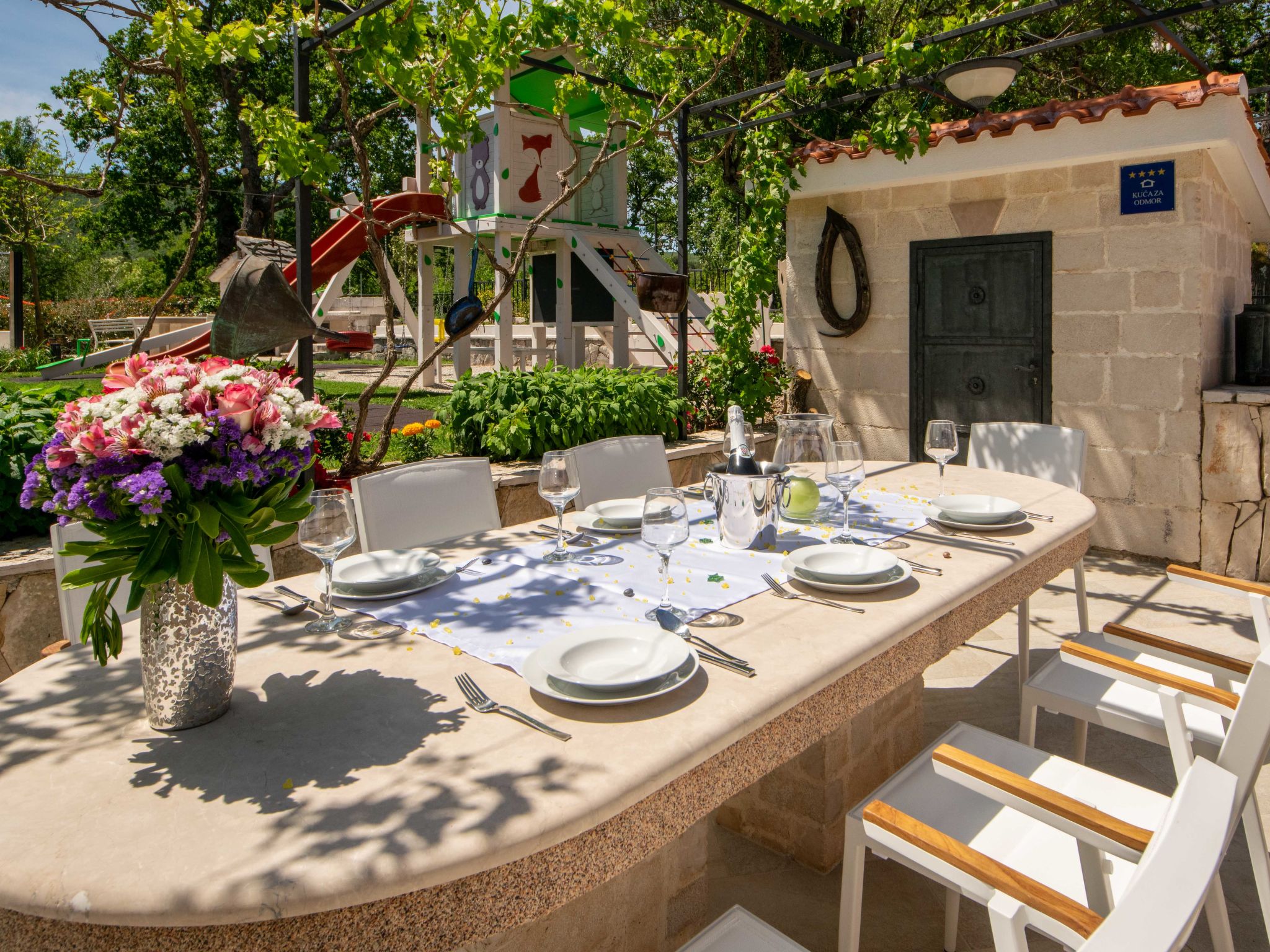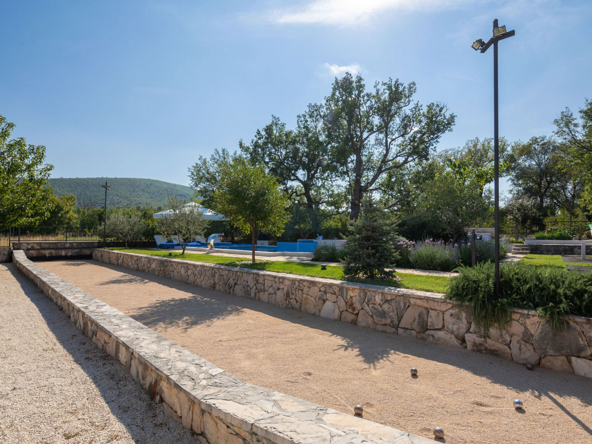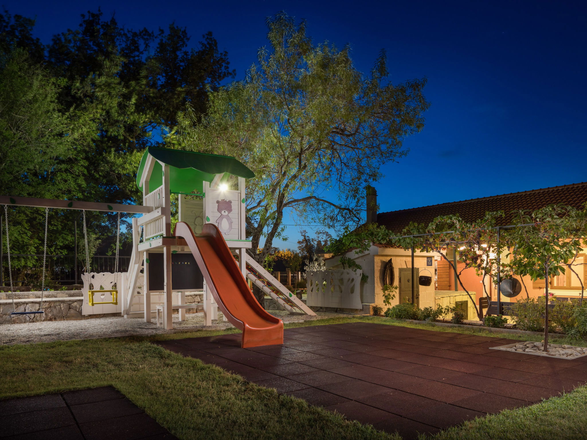 Child friendly single-family house "Villa Dalmatica moderna". In the hamlet Žuvani 13 km from the centre of Trogir, 24 km from the centre of Primošten, in a quiet, sunny position, 13 km from the sea. Private: property 1'600 m2 (fenced), well-kept garden, swimming pool heated (32 m2, depth 35 - 155 cm, seasonal availability: 02.May. - 26.Sep.) with internal staircase and salt-electrolysis pool-cleaning system. Unconventional pool shape. Shower/WC in the pool area, boules, terrace (10 m2), garden furniture, barbecue, children's playground (slide, swing, sandbox). In the house: internet access, sauna, central heating system, washing machine, tumble dryer. Parking (for 3 cars) at the house on the premises. Shop 13 km, restaurant 13 km, bus stop 750 m, pebble beach 13 km, public bathing area 13 km. Swimming pool with hydromassage and waterfall.