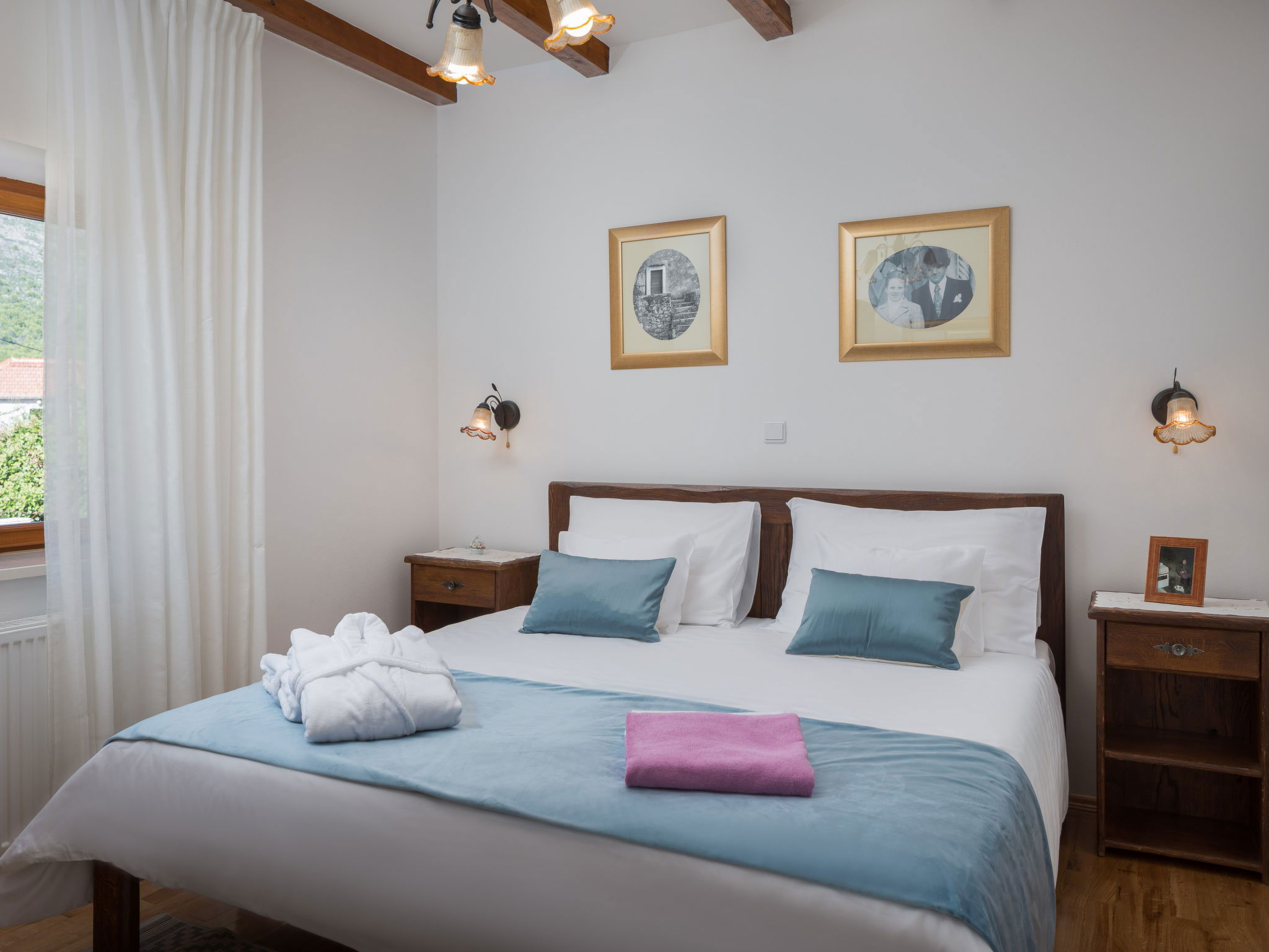4-room house 134 m2, south facing position. Living/dining room with 1 double sofabed (140 cm, length 200 cm), open-hearth fireplace, cable TV, hi-fi system, DVD and air conditioning. Exit to the terrace. 1 room with 1 double bed (2 x 80 cm, length 200 cm), shower/WC. 1 room with 1 double bed (2 x 80 cm, length 200 cm). 1 children's room with 1 x 2 bunk beds (90 cm, length 200 cm), TV. Open kitchen (4 hot plates, oven, dishwasher, microwave, freezer, electric coffee machine). Shower/WC. Terrace 65 m2, roofed. Terrace furniture, deck chairs. Facilities: safe, iron, children's high chair, baby cot, hair dryer. Internet (WiFi, free). Parking (fenced).