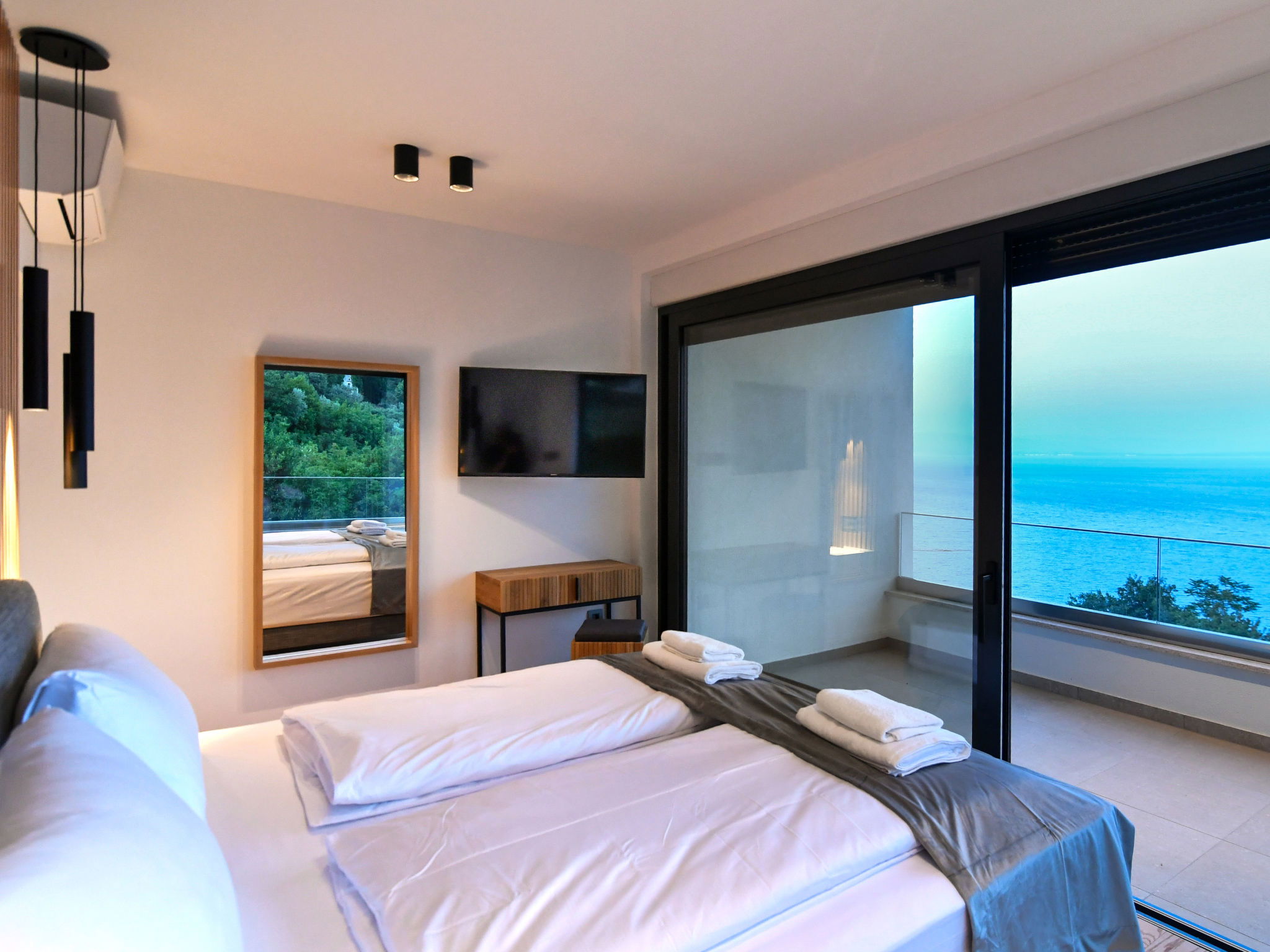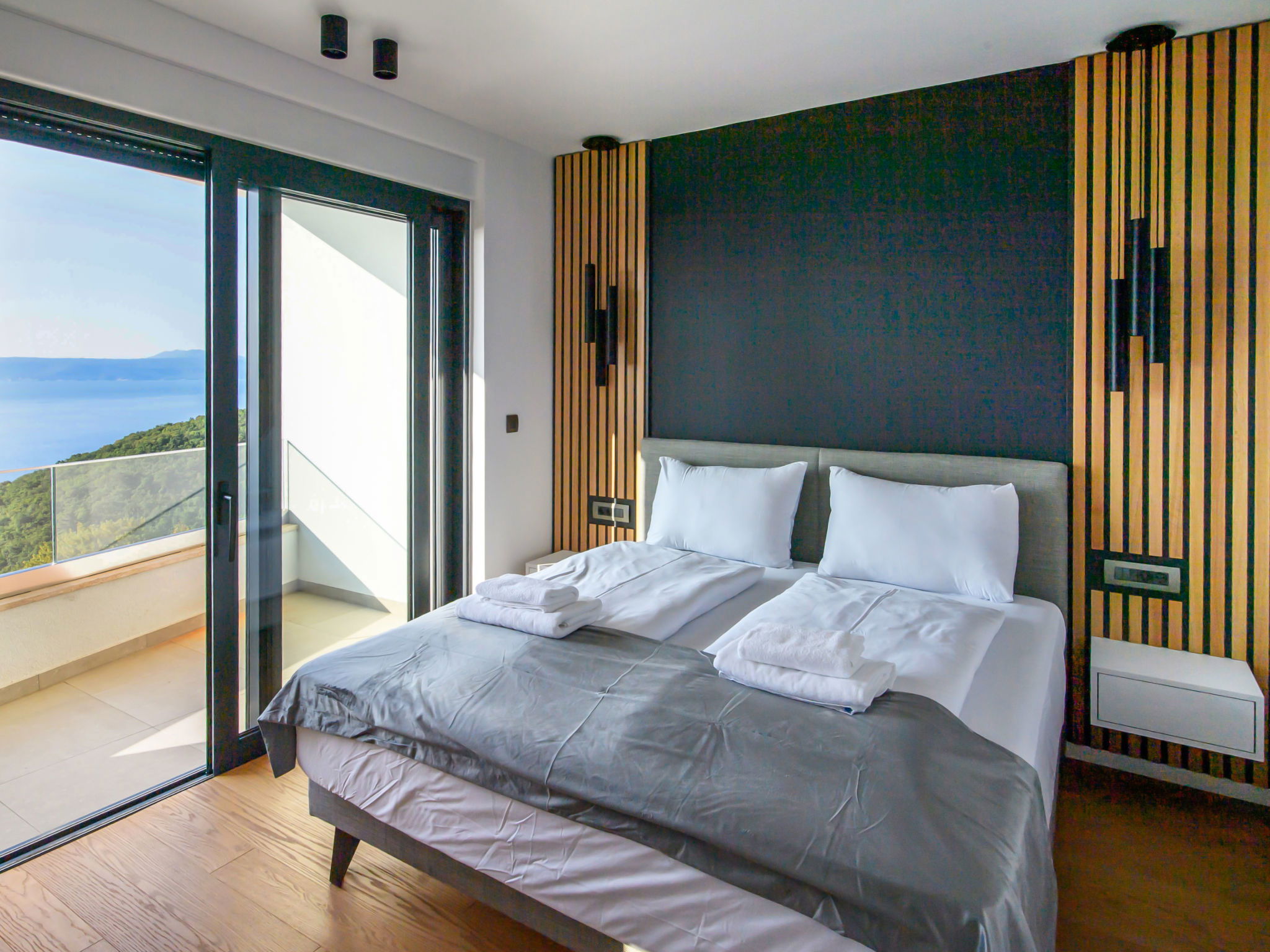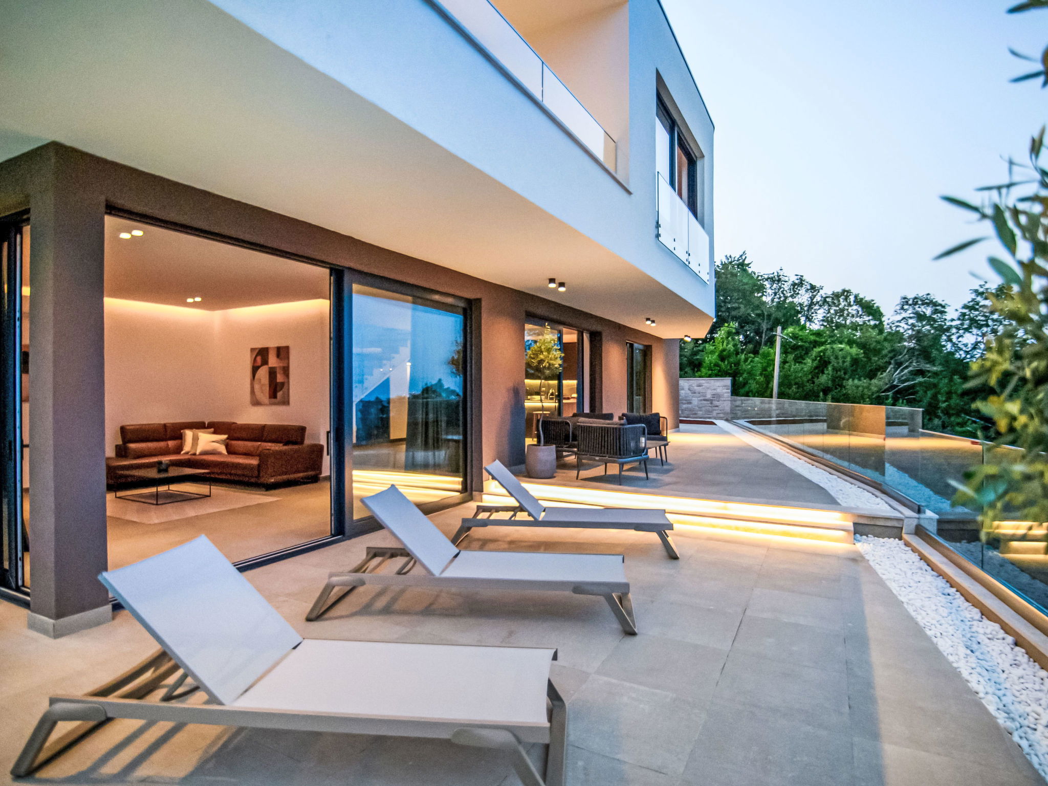 Medveja 3 km from Lovran: Very modern villa "Marmonte", 2 storeys, built in 2025. In a quiet, sunny, elevated position, 950 m from the sea, 950 m from the beach. Private: property 525 m2, swimming pool angular (7 x 3 m, depth 150 cm, seasonal availability: 01.May. - 30.Oct.) with internal staircase. Outdoor shower, terrace (50 m2), garden furniture, barbecue. In the house: internet access, central heating system, air conditioning, washing machine, tumble dryer. Steep motor access to the house. Parking at the house on the premises. Shop 950 m, supermarket 4 km, restaurant 150 m, bar, café, bus stop 950 m, pebble beach "Medveja" 950 m, shingle beach "Medveja" 950 m. Sports harbour 950 m.