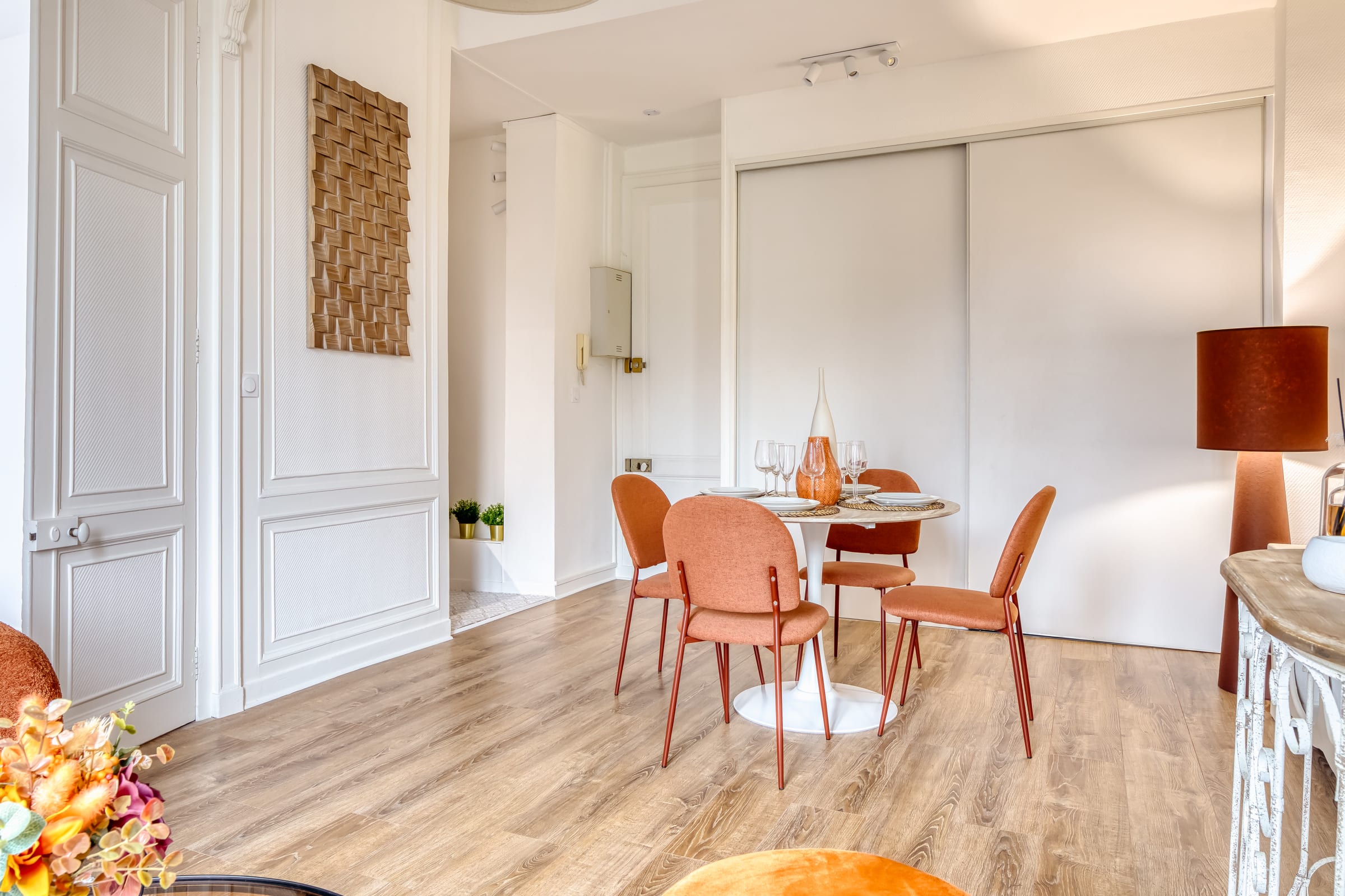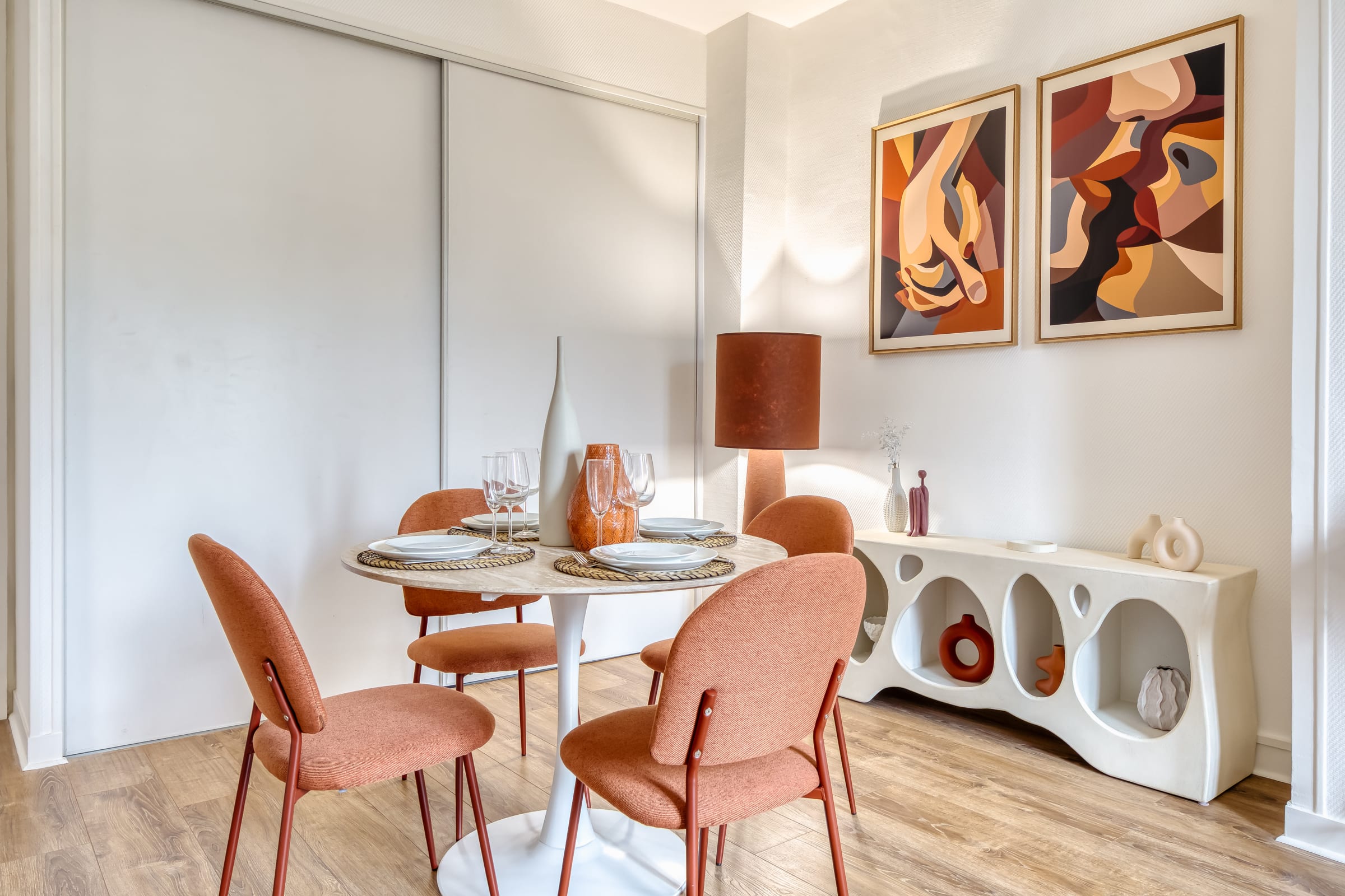 The bright living room is a true haven of relaxation, where you immediately feel at home. Sink into the sofa to watch your favourite programmes on television, share a drink or enjoy a good meal at the dining table in the living room, while enjoying the view and atmosphere of the square. Adjacent to the living room, the bedroom offers an intimate cocoon with a 140x190 cm double bed, ideal for resting after a day of sightseeing and waking up gently, in peace and quiet, above the city. Right next door, the bathroom has a bathtub and toilet, for a welcome moment of comfort and relaxation at the end of the day. As soon as you enter, the semi-open kitchen invites you to make yourself at home: fully fitted and equipped (washing machine, dishwasher, combination oven and microwave, refrigerator, Nespresso coffee machine, toaster, kettle), it allows you to easily prepare a gourmet breakfast, a romantic dinner for two or a simple coffee to enjoy by the window. Ironing equipment is also available in the large cupboards in the entrance hall to ensure that everything remains impeccable during your stay.