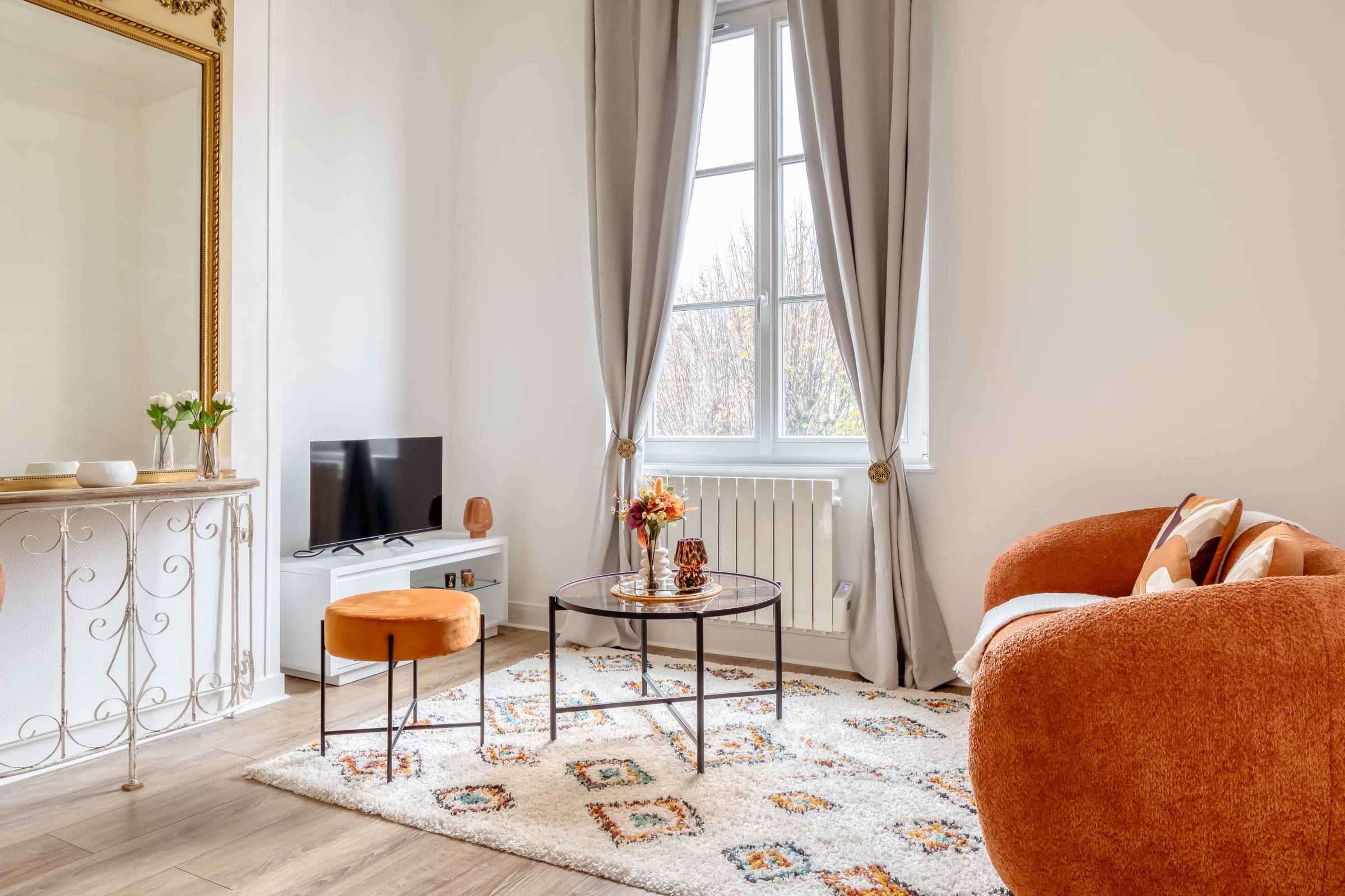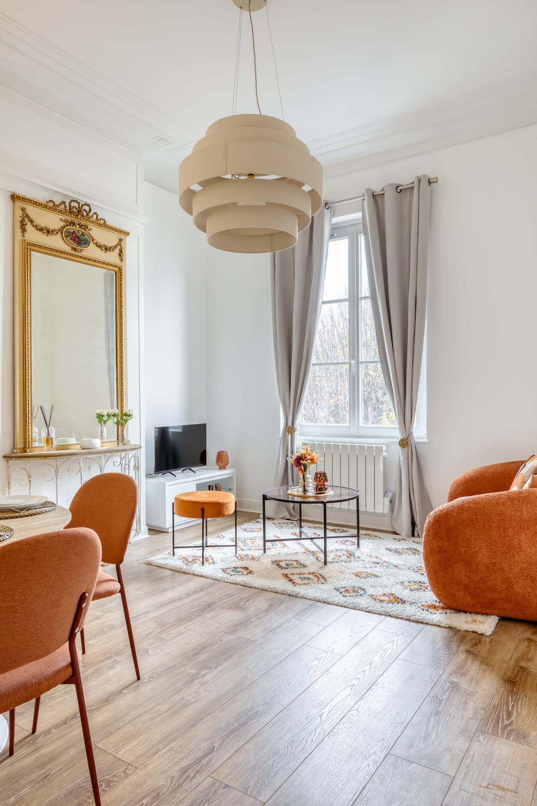 Welcome to this magnificent flat nestled directly on the famous Place des Carmes, in the very centre of Rouen. Located on the 3rd floor of a former mansion, this 36 m² cocoon with its refined and contemporary atmosphere is perfectly designed to accommodate two travellers in search of charm, comfort and tranquillity. As soon as you walk through the door, you are greeted by light: the high ceilings and south-west exposure flood the space with warm light from morning until the last rays of the sun. From the living room, simply step up to the window to watch the city come to life before your eyes: Place des Carmes bustles with passers-by, and when you look up, the spire of Rouen Cathedral stands proudly against the sky.