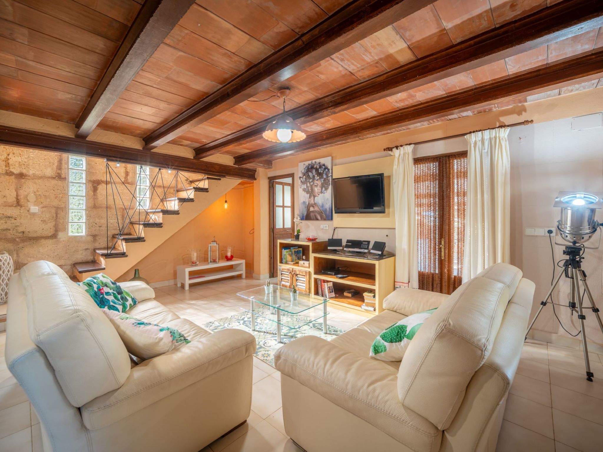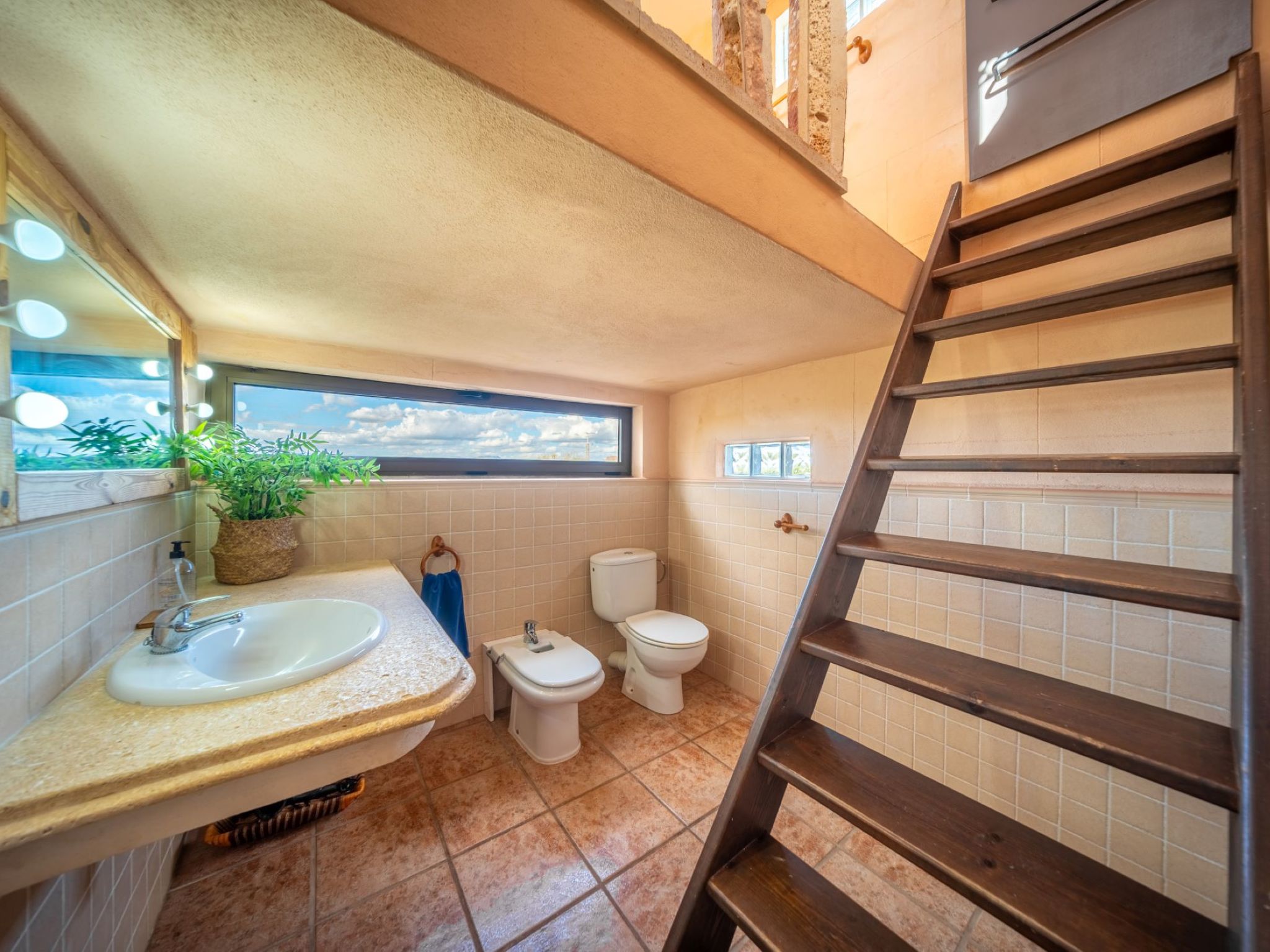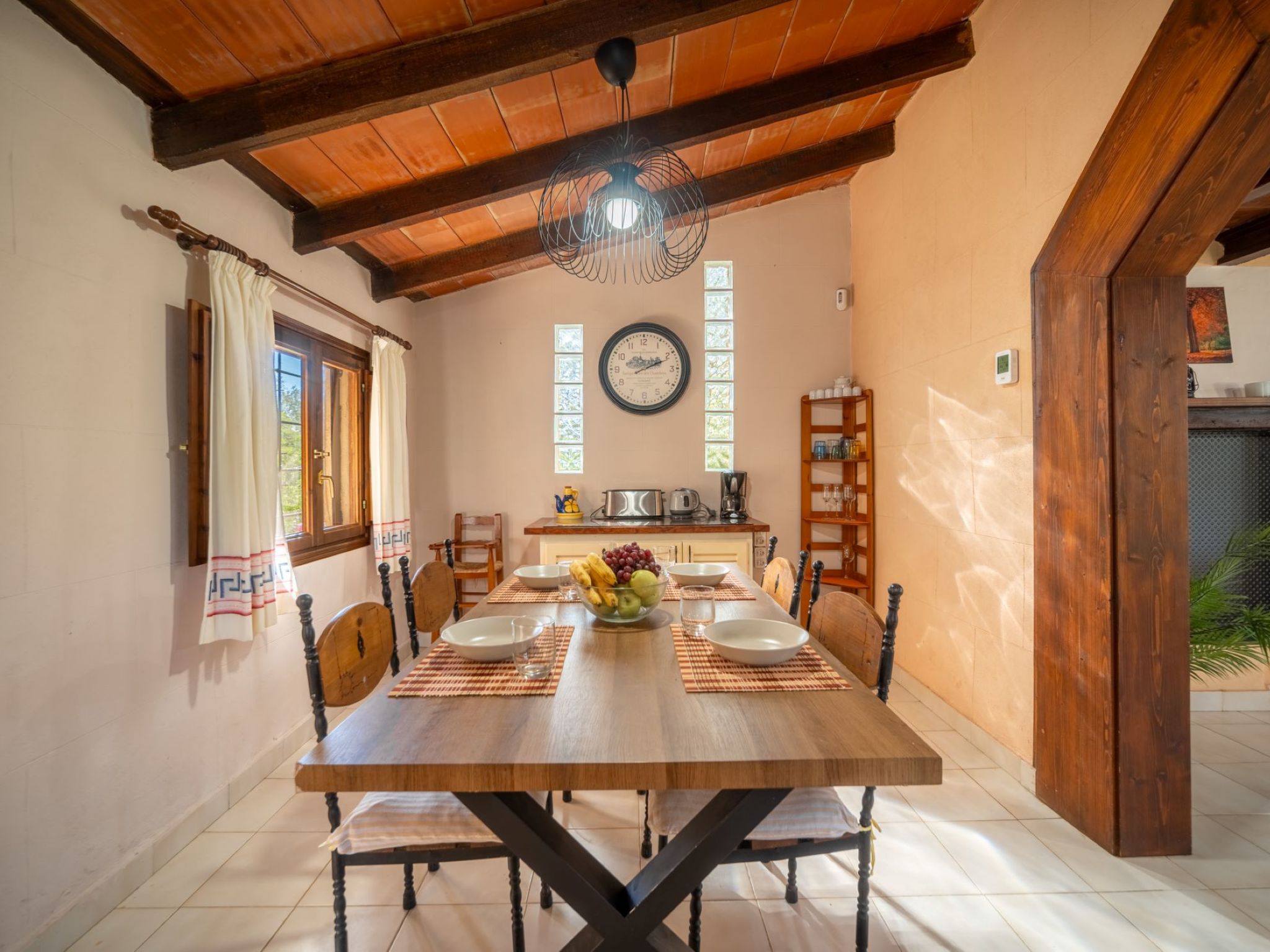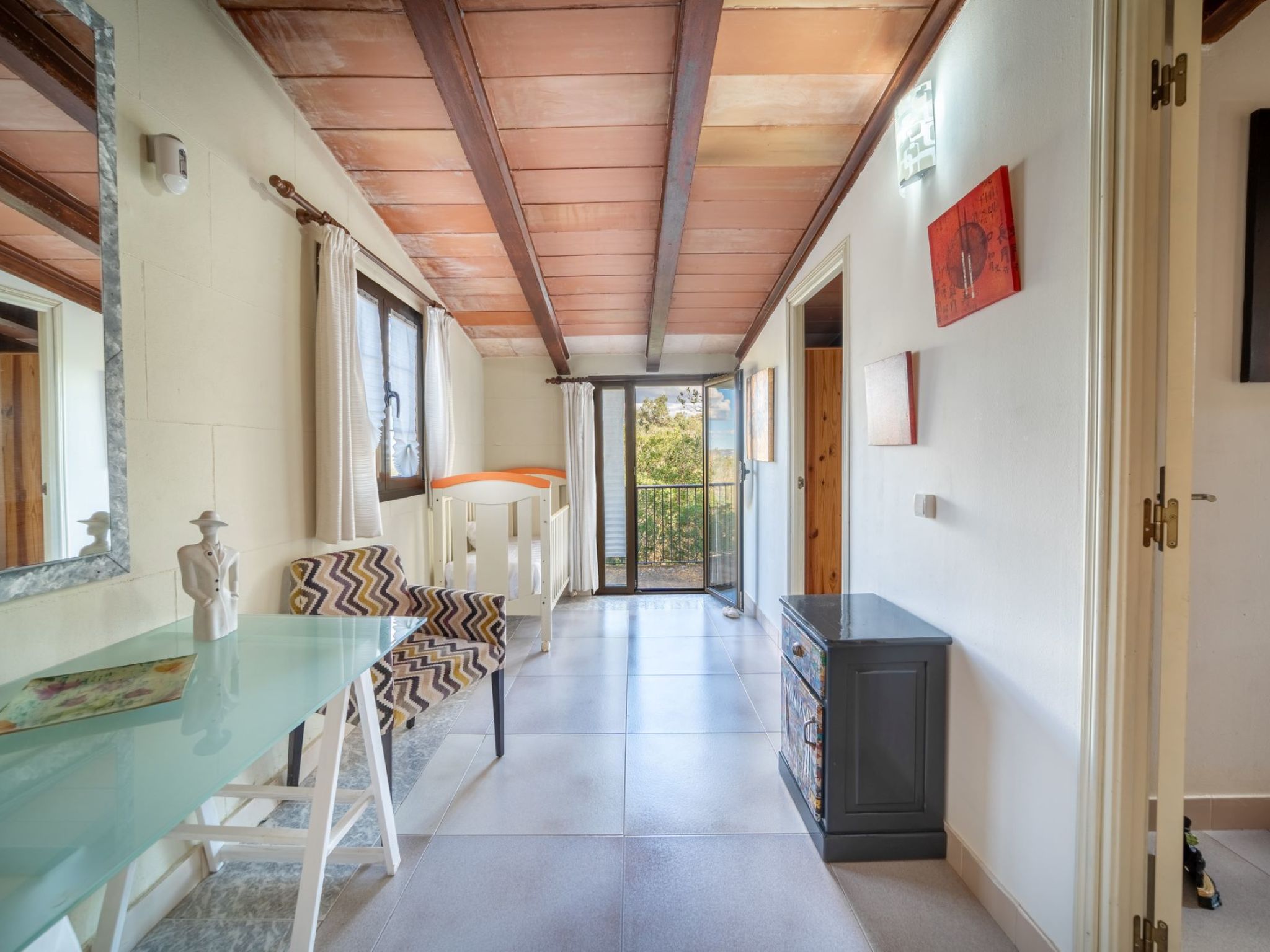 "Sa Torreta", 3-room house 120 m2. Partly with sloping ceilings, simple and rustic furnishings: living/dining room with open-hearth fireplace. Exit to the patio. Small kitchen (dishwasher, 4 ceramic glass hob hotplates, toaster, kettle, microwave, electric coffee machine). Exit to the patio. Shower/WC. Upper floor: 1 double bedroom with 2 beds (90 cm, length 190 cm), fan. 1 double bedroom with 1 french bed (1 x 150 cm, length 190 cm), fan. Bath/WC. Natural stone floors. Patio. Terrace furniture, balcony furniture, barbecue, deck chairs, covered balcony. View of the mountains. Facilities: washing machine, iron, children's high chair, baby cot for up to 2 year olds, hair dryer. Internet (WiFi, free). Parking at the house. ETV/5186 // Reg. Nr.: ESFCTU00000700800038425300000000000000000000ETV/51868