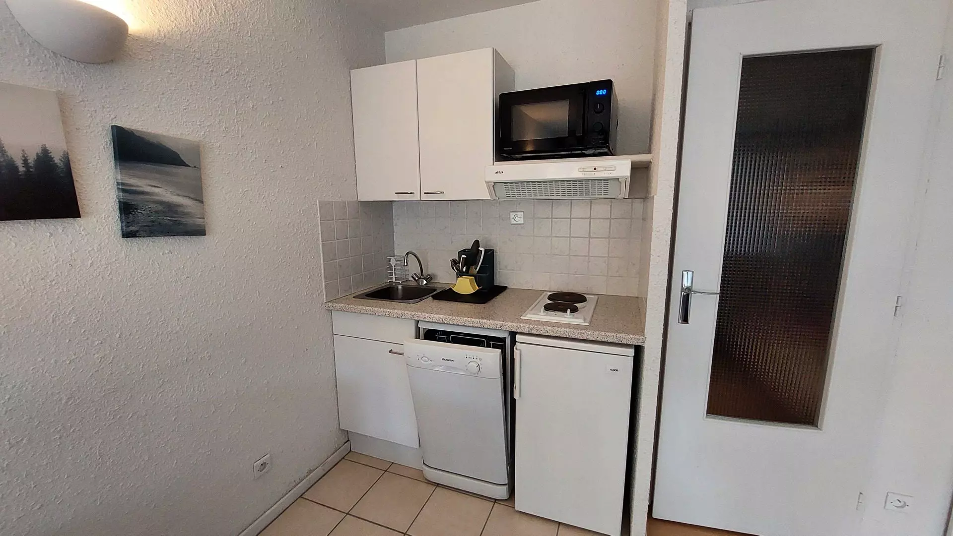 Equipment: 2 electric hobs, microwave oven, refrigerator, dishwasher, coffee maker, kettle