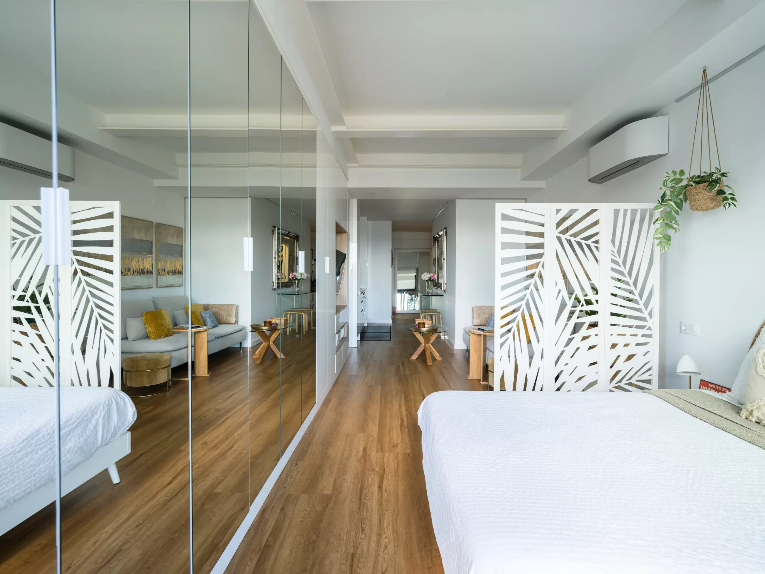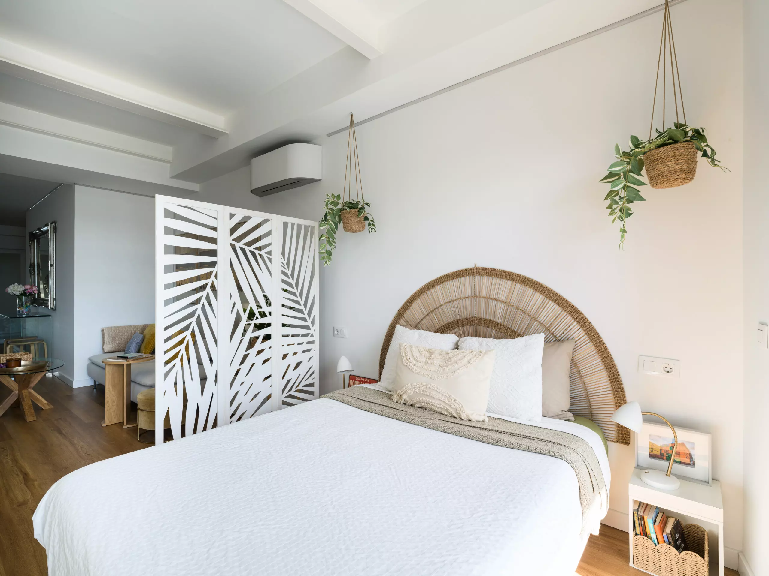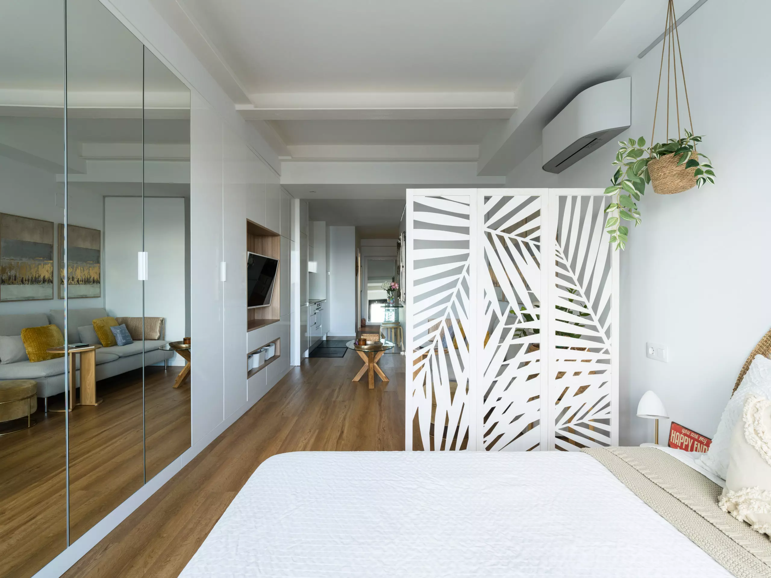 The space features a master bedroom with a double bed (1.35 meters wide) and a pillow-top mattress, ensuring a restful sleep. The carefully selected decor creates an elegant and relaxing atmosphere, ideal for those who value design and comfort.