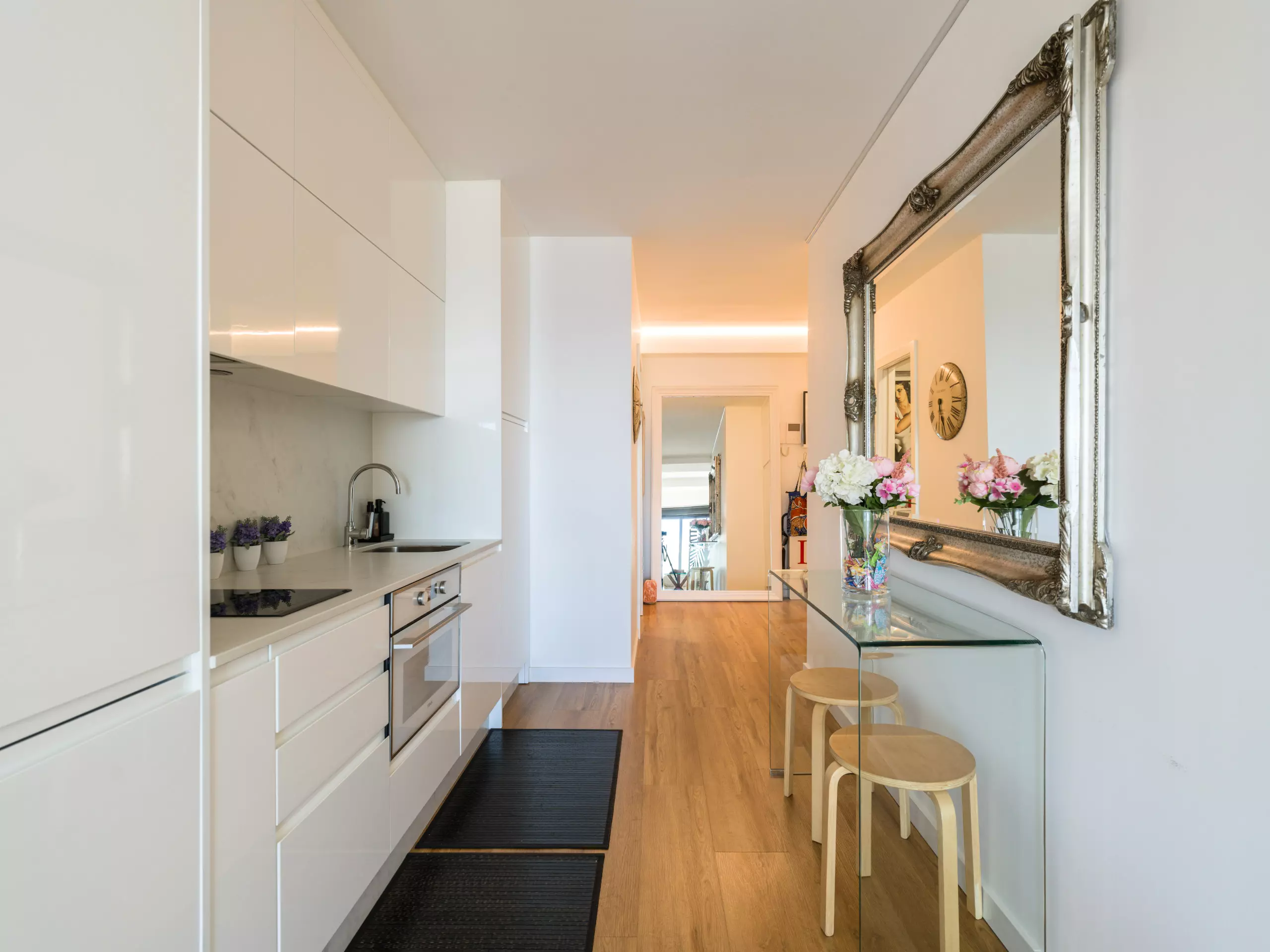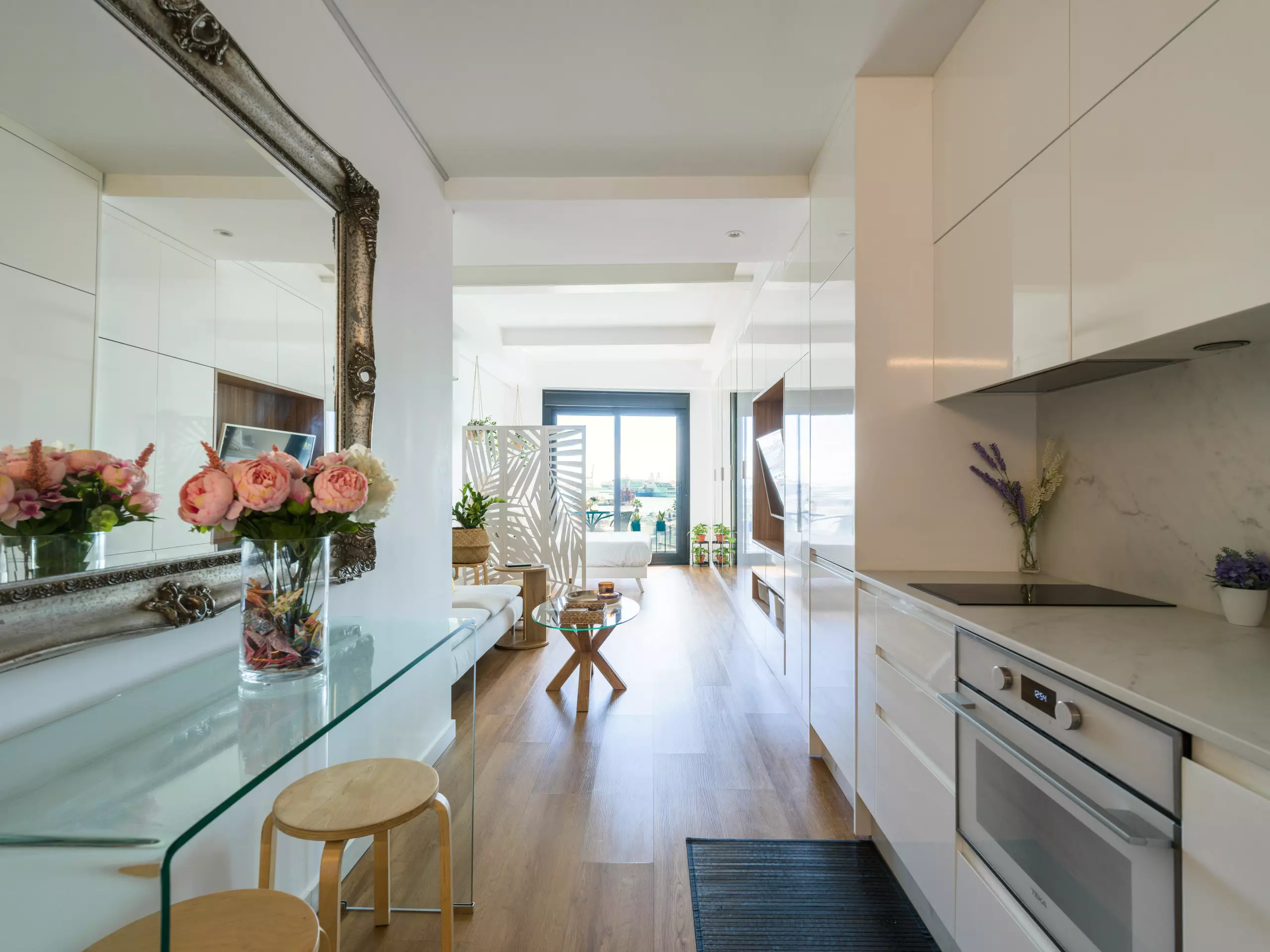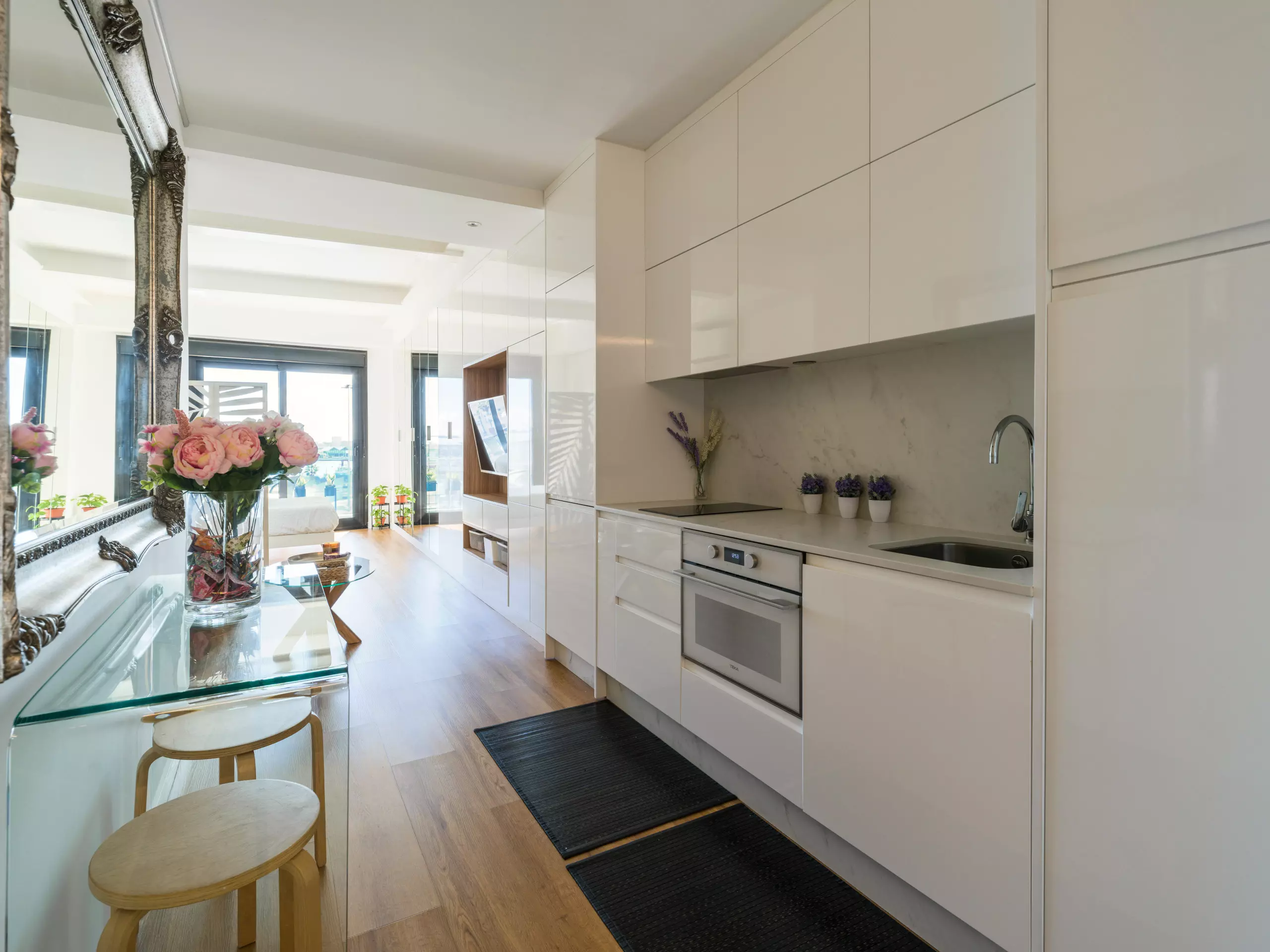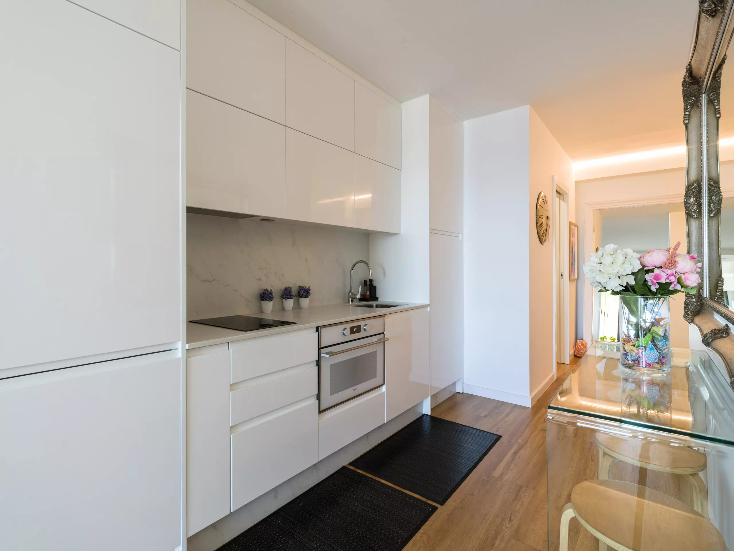 The American-style kitchen is fully equipped with state-of-the-art appliances, including a washing machine, dryer, oven, microwave, and coffee maker. Perfect for preparing quick meals or enjoying an intimate gourmet evening.