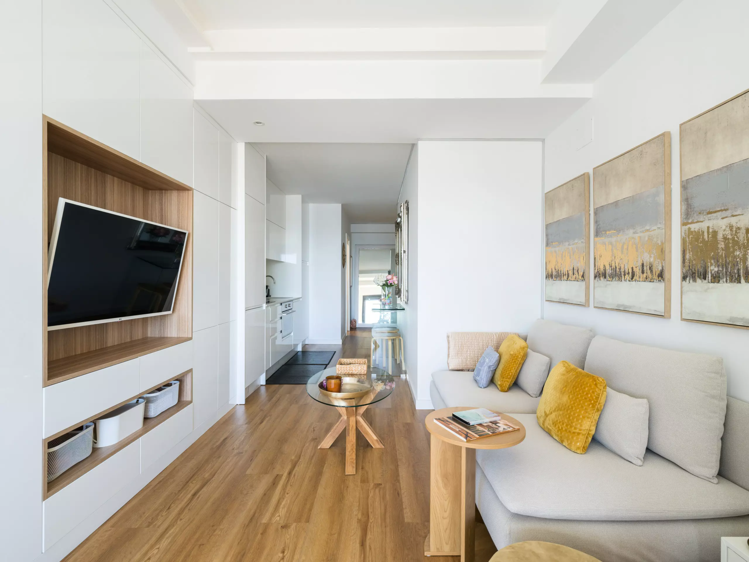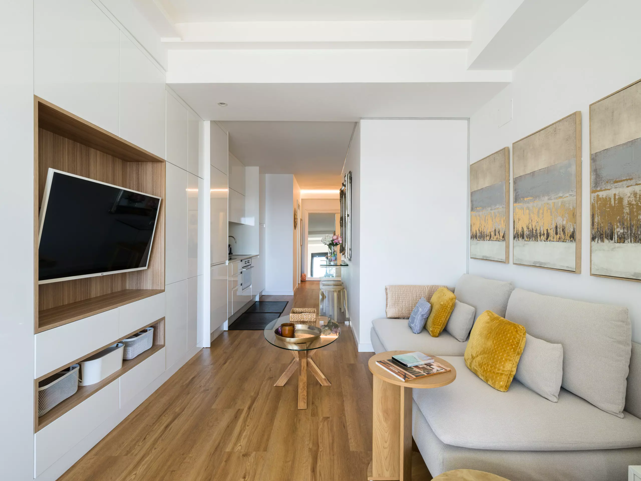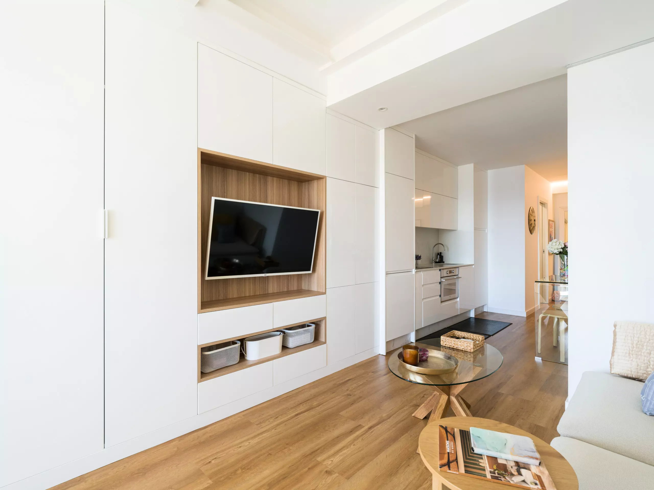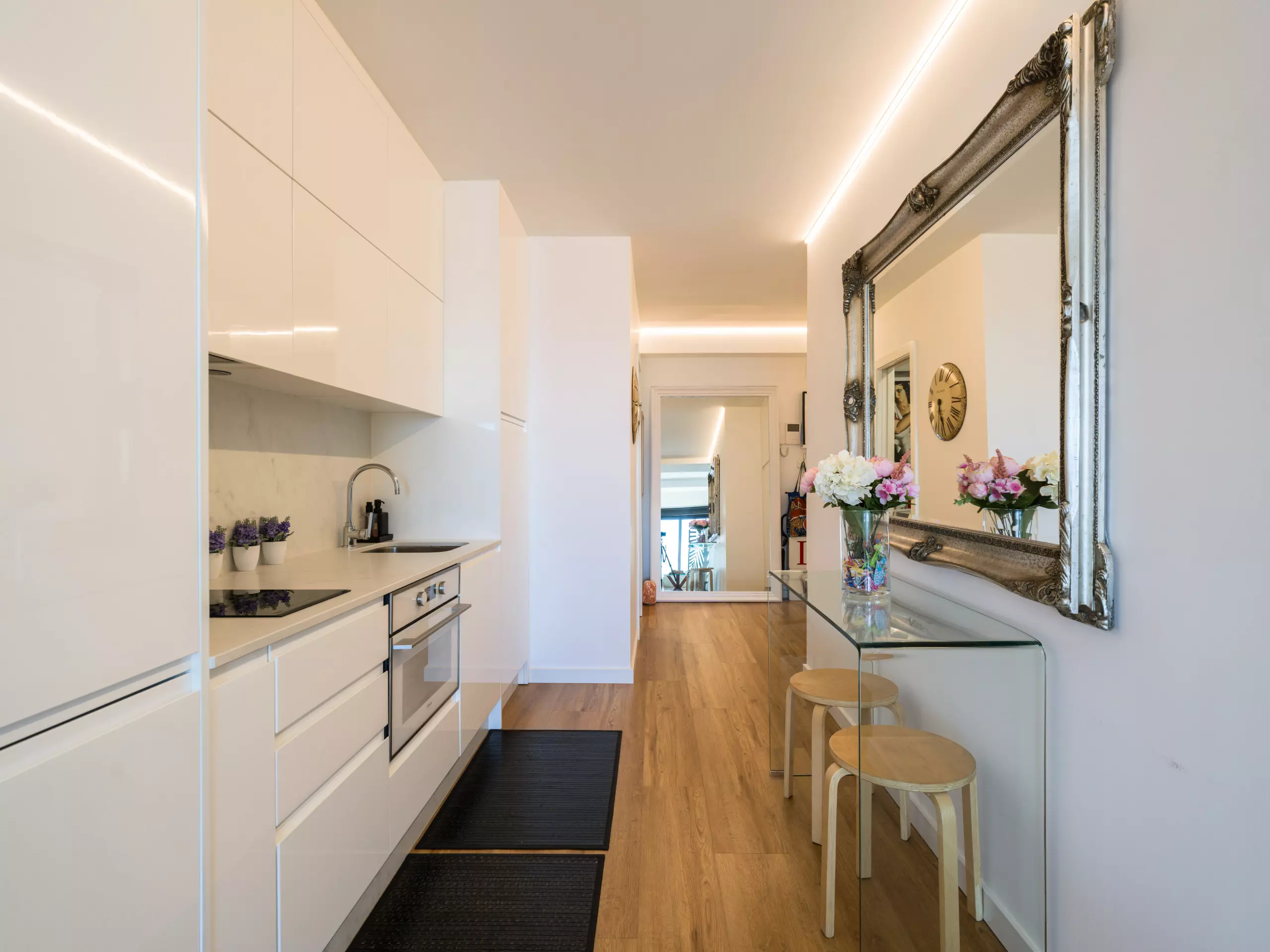 The American-style kitchen is fully equipped with state-of-the-art appliances, including a washing machine, dryer, oven, microwave, and coffee maker. Perfect for preparing quick meals or enjoying an intimate gourmet evening.