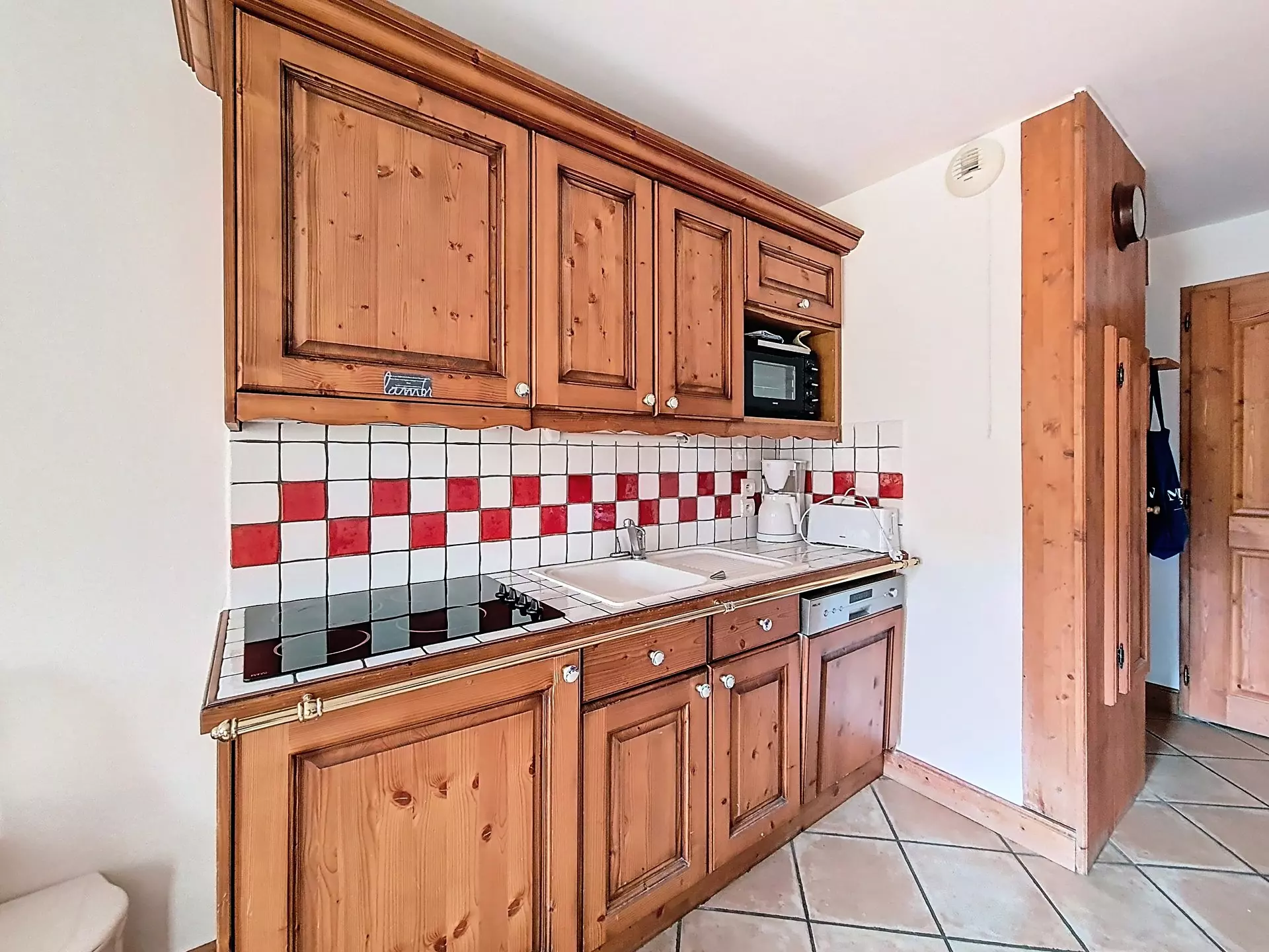 American-style kitchen equipped with 4 ceramic hobs, extractor hood, refrigerator, mini oven, dishwasher, coffee maker, toaster, kettle.