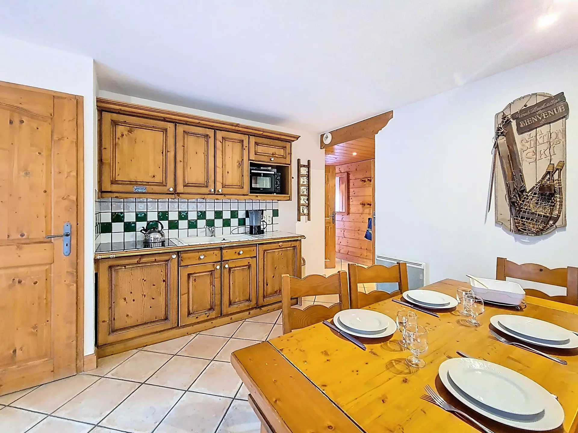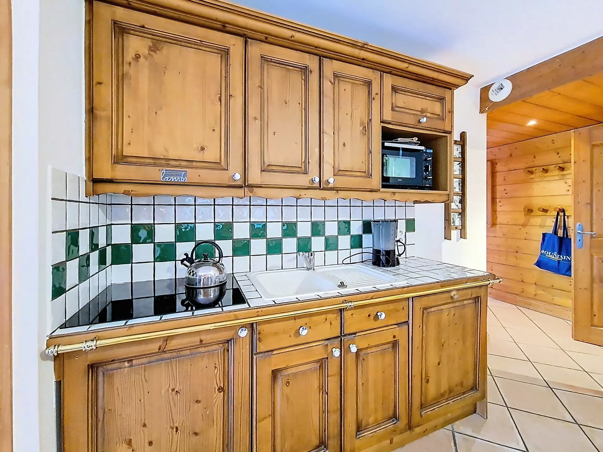 Kitchen equipped with 4 ceramic hobs, extractor hood, refrigerator, mini oven, dishwasher, coffee maker, toaster, kettle.