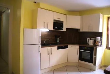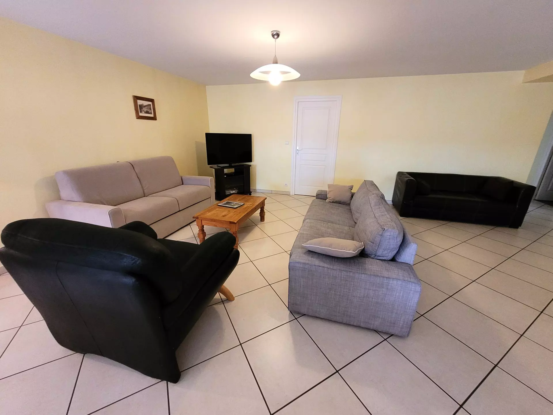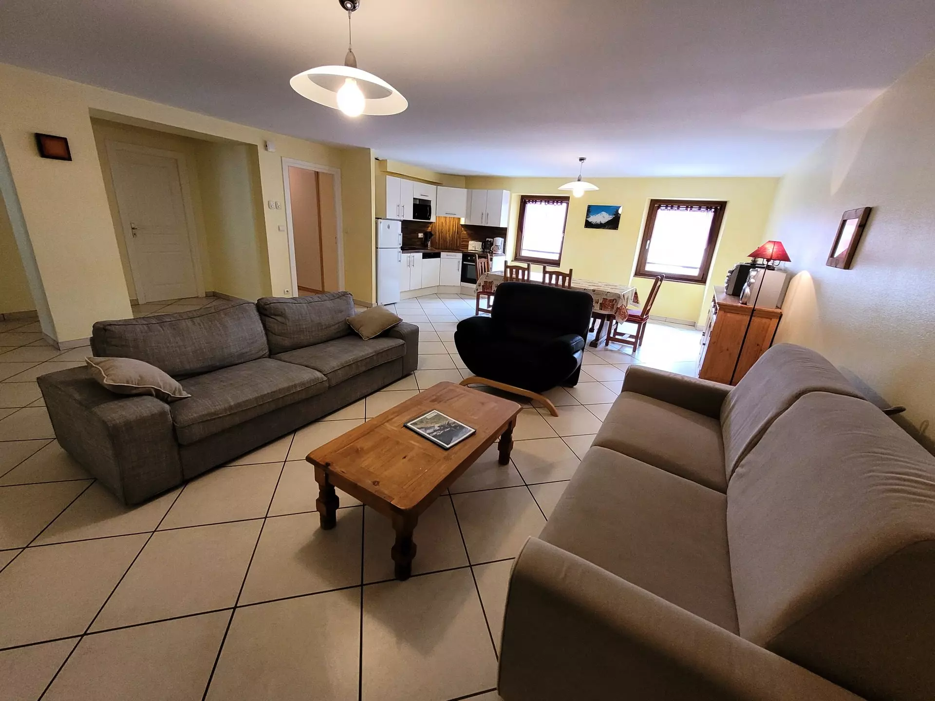 Large, welcoming living room with fully equipped kitchenette (oven, microwave, refrigerator with freezer compartment, induction hobs, dishwasher), large family table and lounge area with television and armchairs.