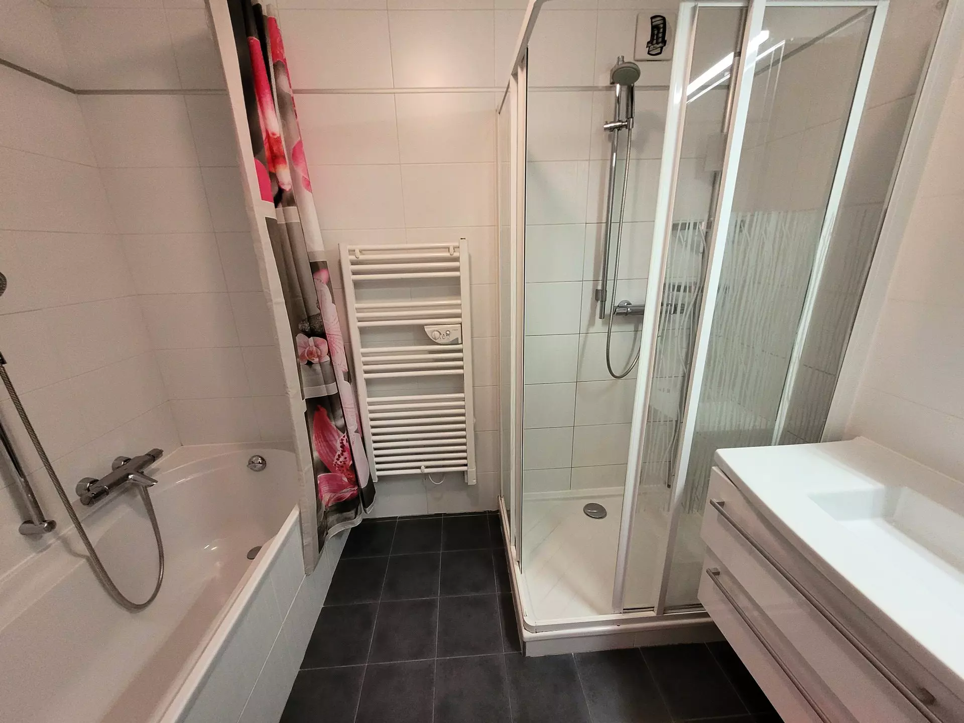 Bathroom with bath, shower, sink and towel warmer. Separate WC.