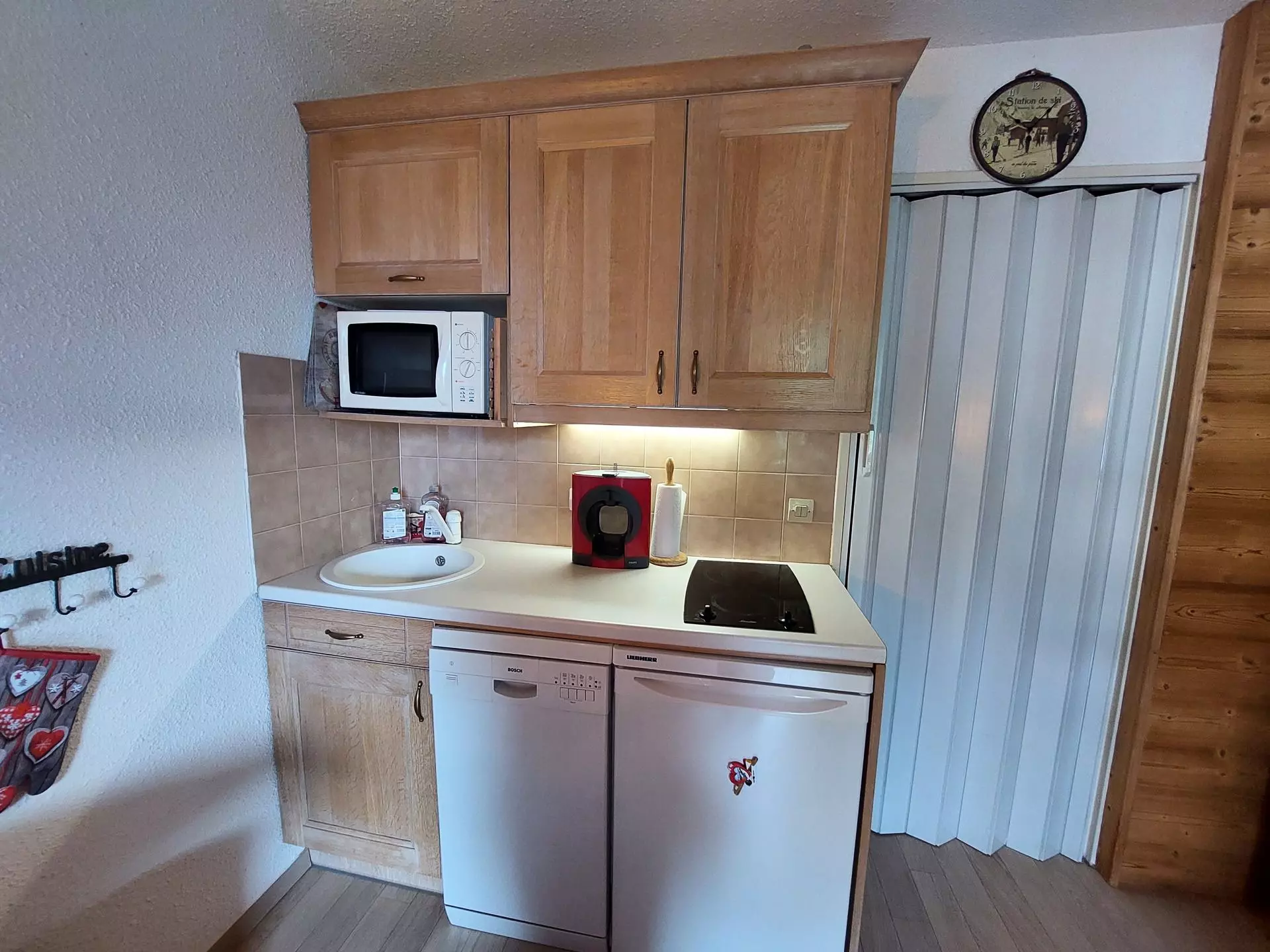 Kitchenette open to the living area: ceramic hob, refrigerator, dishwasher, microwave, filter coffee maker, Krups capsule coffee maker, raclette set, fondue set