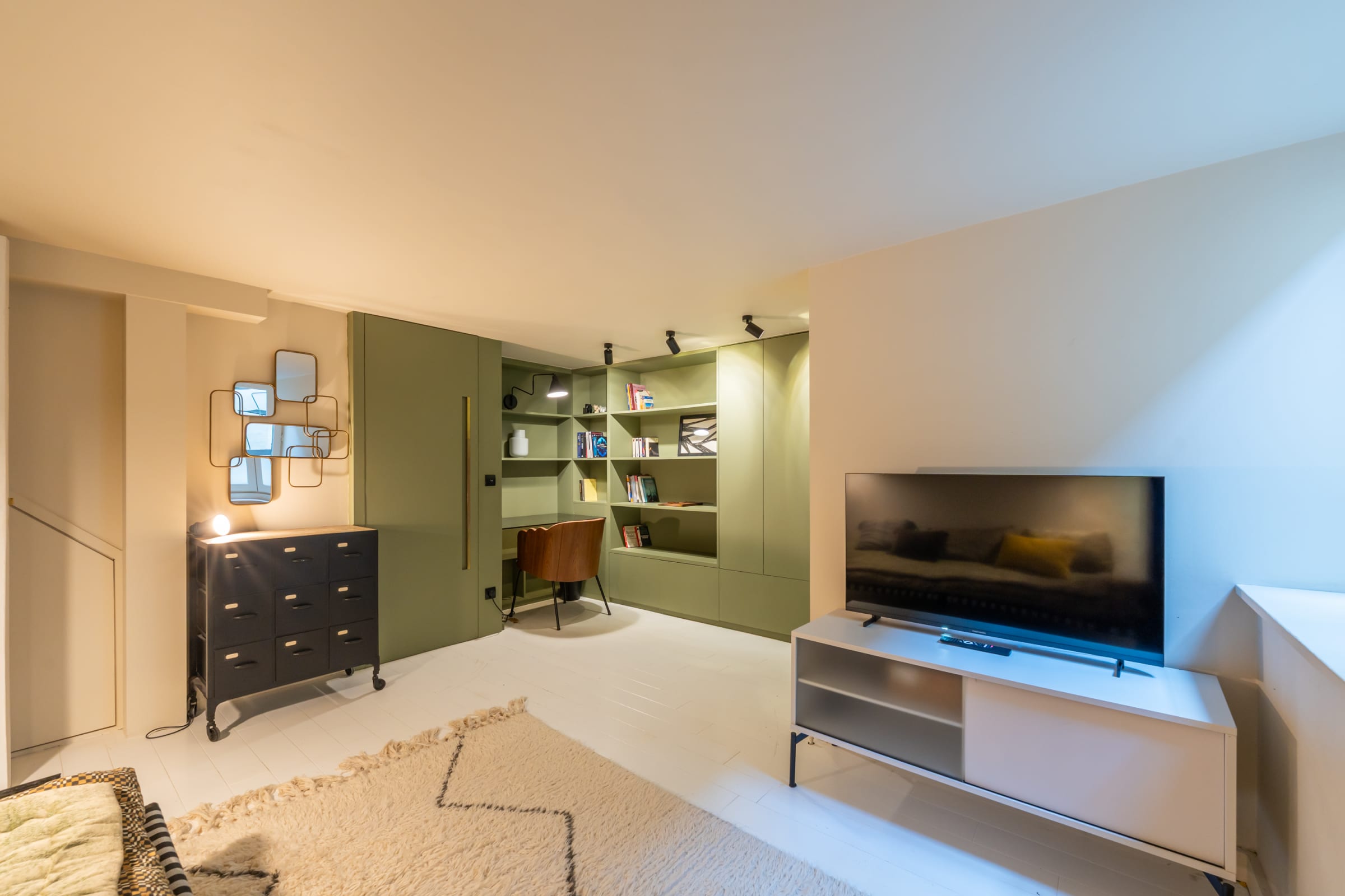 - on the mezzanine floor, an elegant office area with built-in storage extends into a secondary living room, ideal for relaxing, reading or watching a movie.