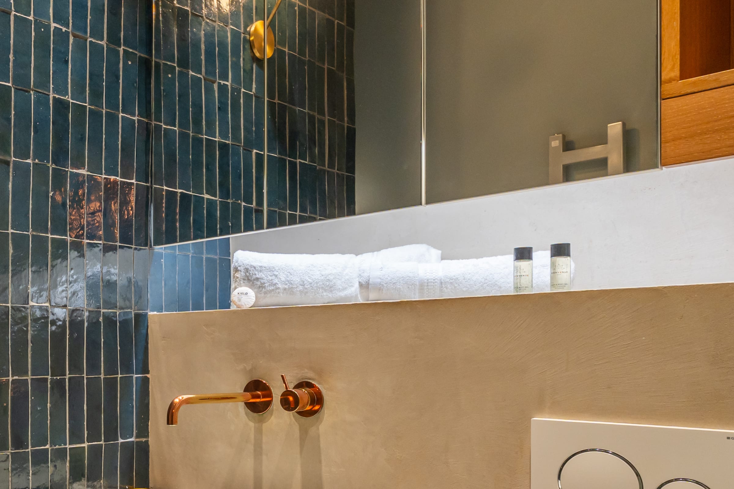 - on the top level, a modular space offering two sleeping areas with two single beds and an elegant waxed concrete bathroom.