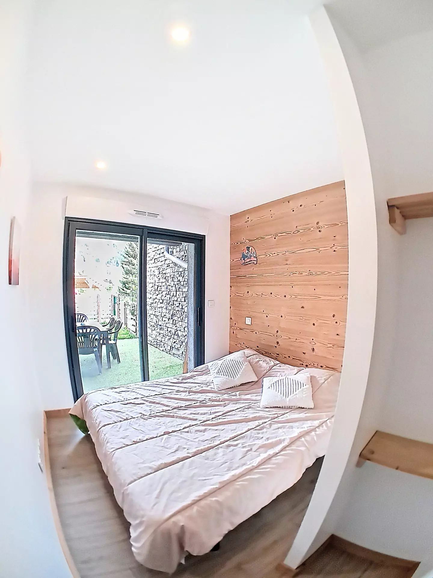 The living room is equipped with a television and overlooks the small south-facing garden (equipped with 2 sun loungers - table and garden chairs).