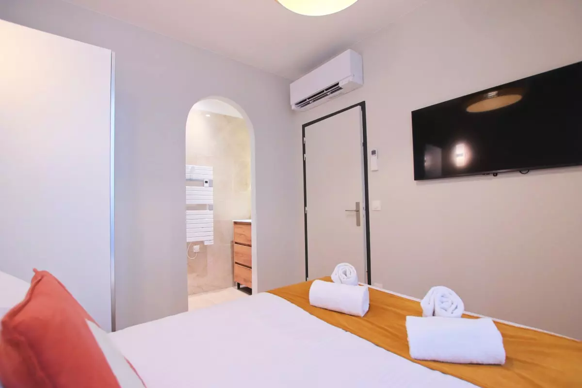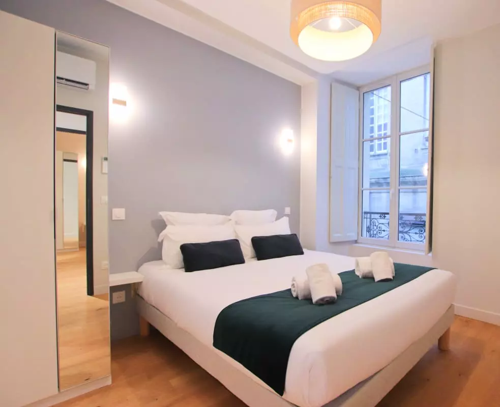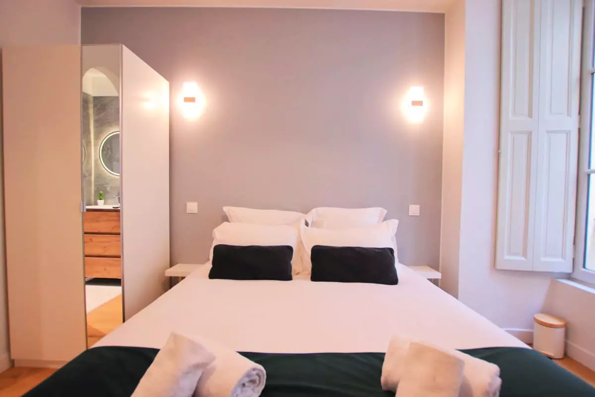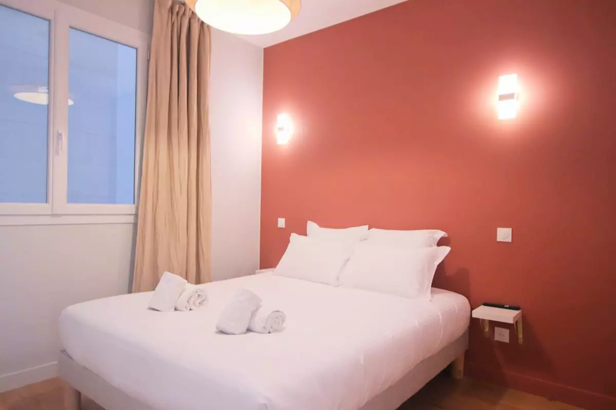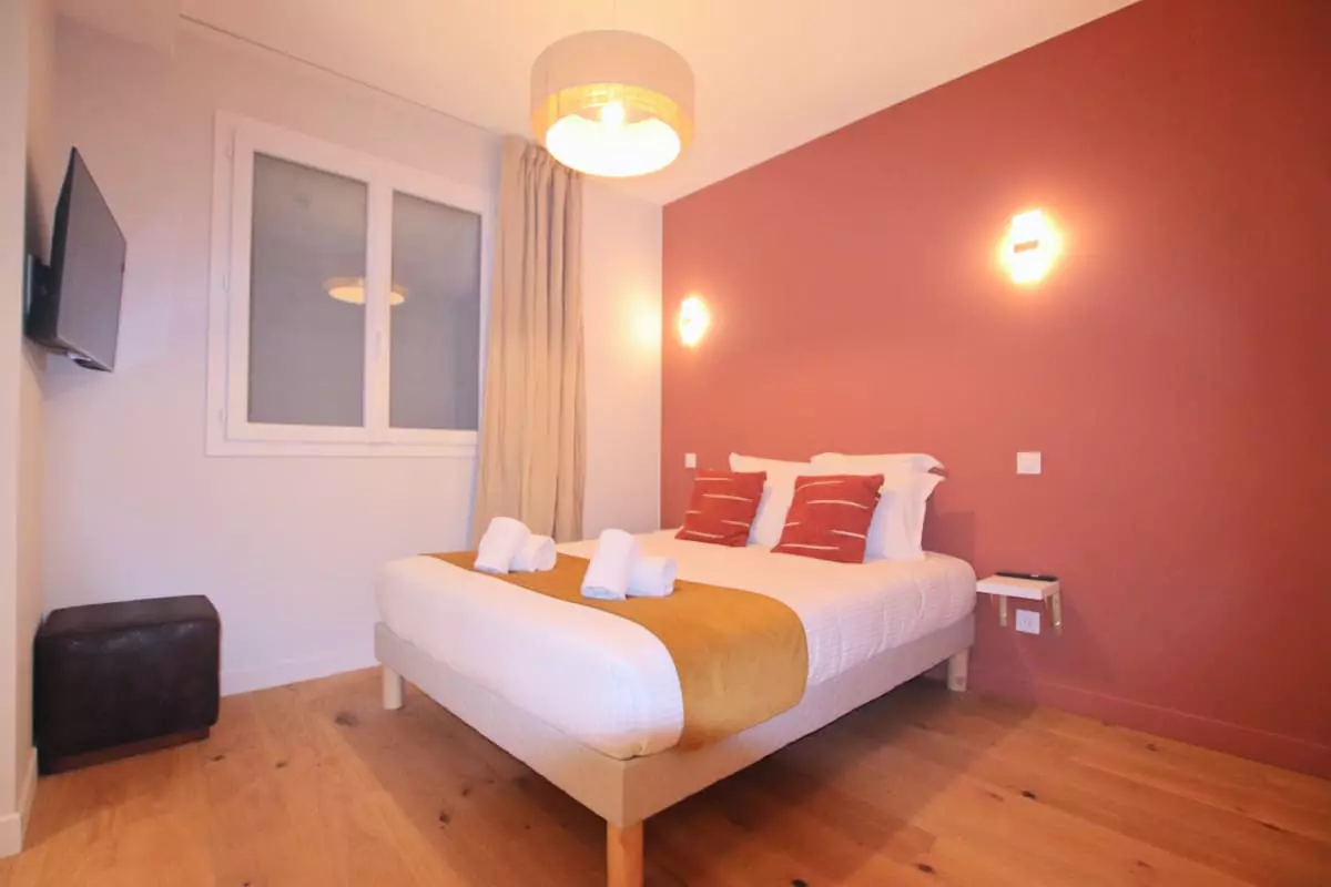 Modern 3-bedroom apartment for 6 people in the heart of Bordeaux. Three bedrooms with queen-size beds, private bathrooms, and air conditioning, one of which is wheelchair accessible. Comfortable living room with TV and Wi-Fi. Fully equipped kitchen (dishwasher, washing machine, oven, etc.). Secure building with elevator.