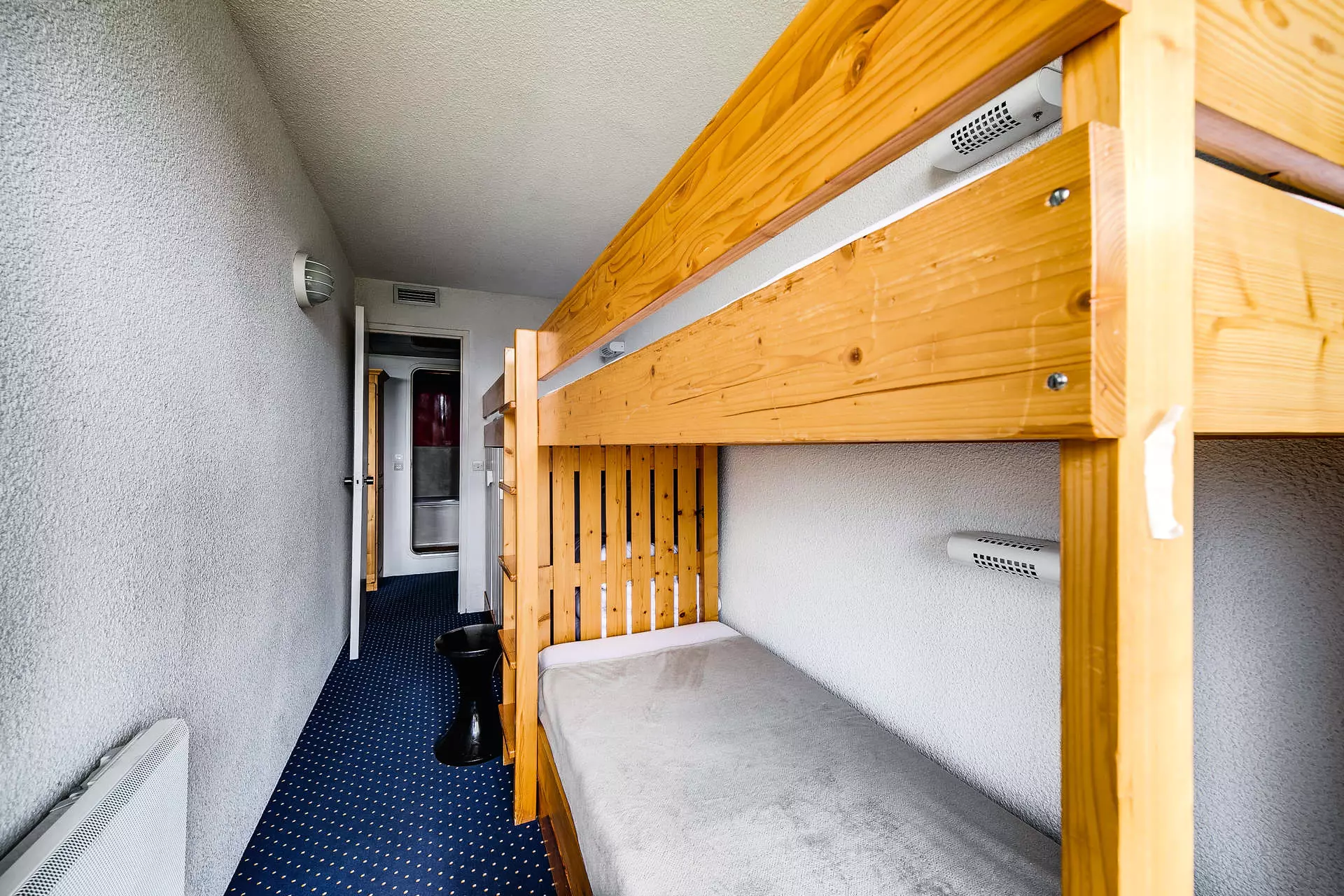A room with a set of three bunk beds, two of which are on the upper level.