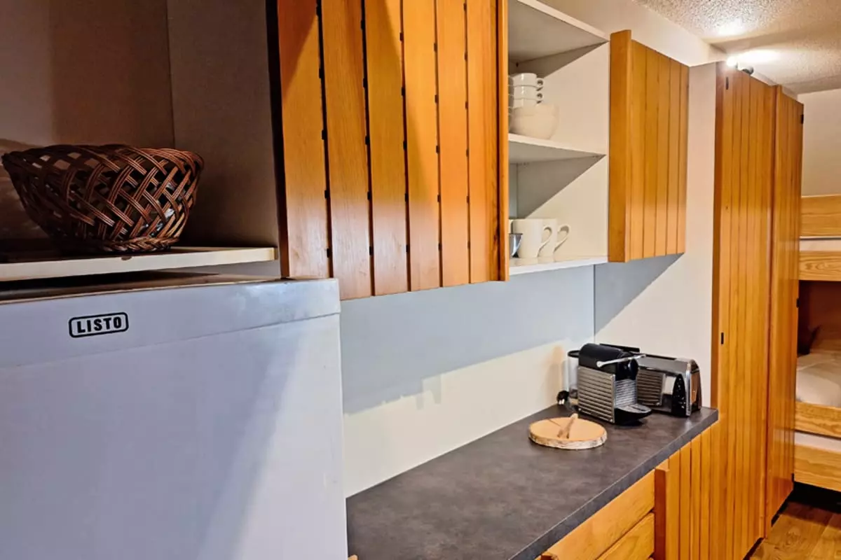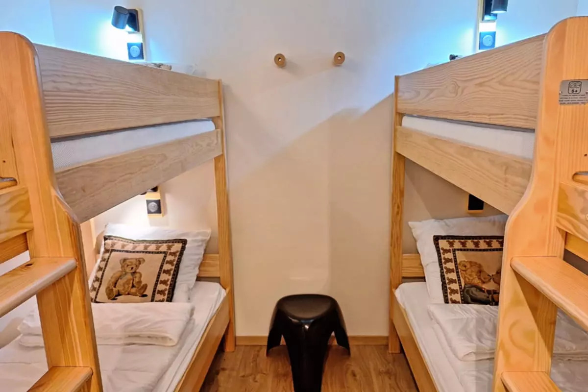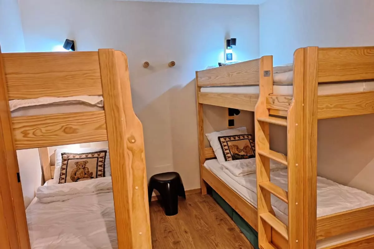 The apartment has a sleeping area with two 90 x 90 bunk beds. The living room is equipped with a 160 x 200 sofa bed.
