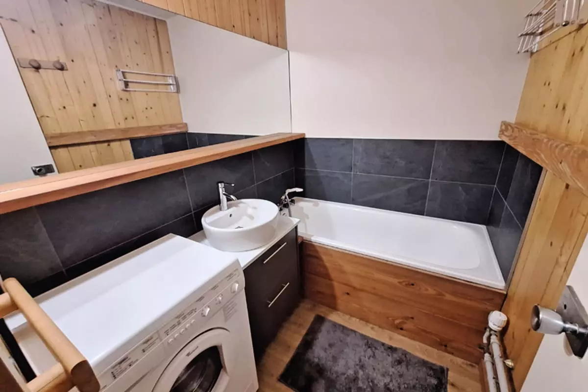 The functional bathroom, equipped with a washing machine, adds to the practicality of this space. The apartment also has a separate toilet with a sink.