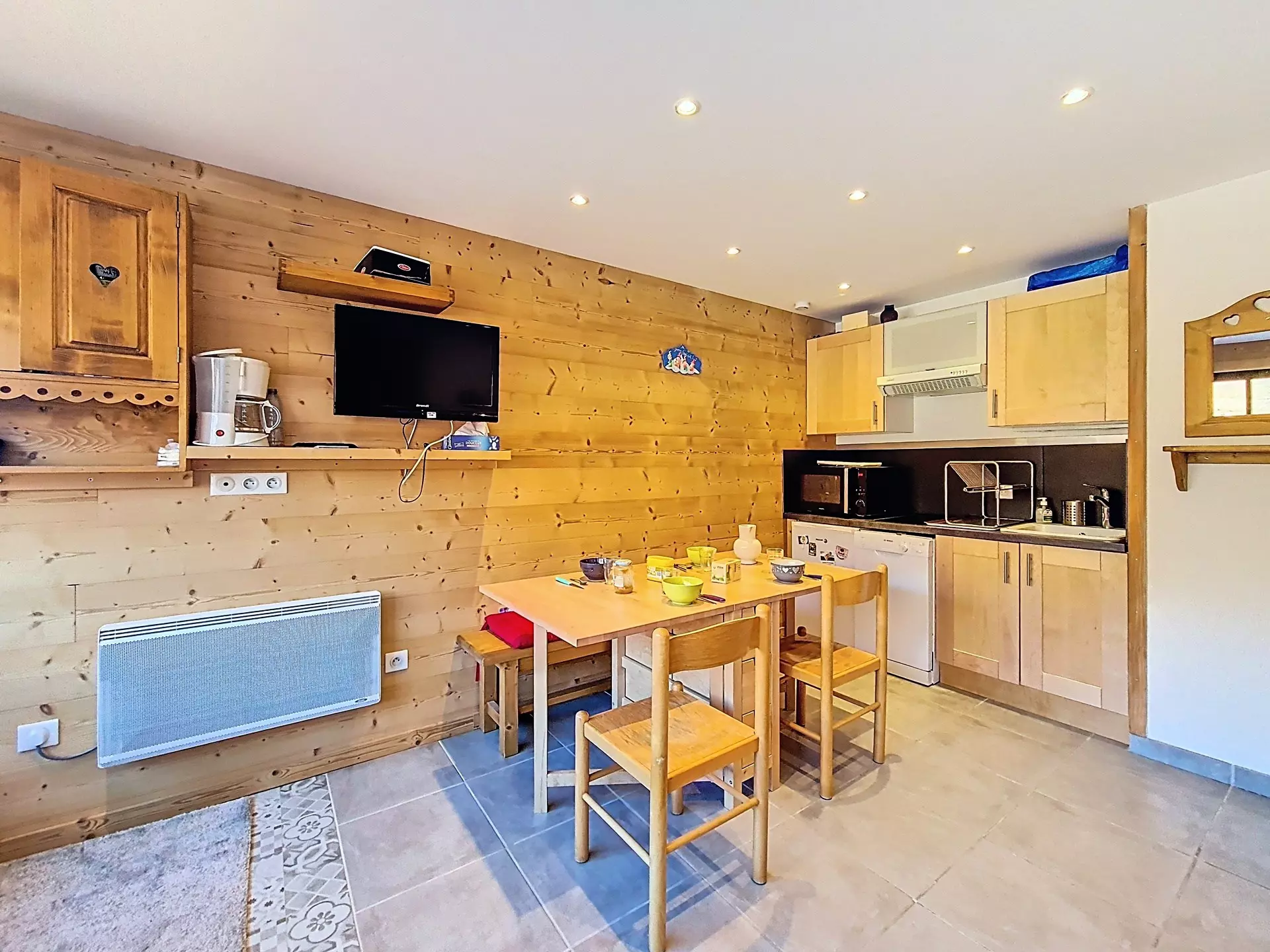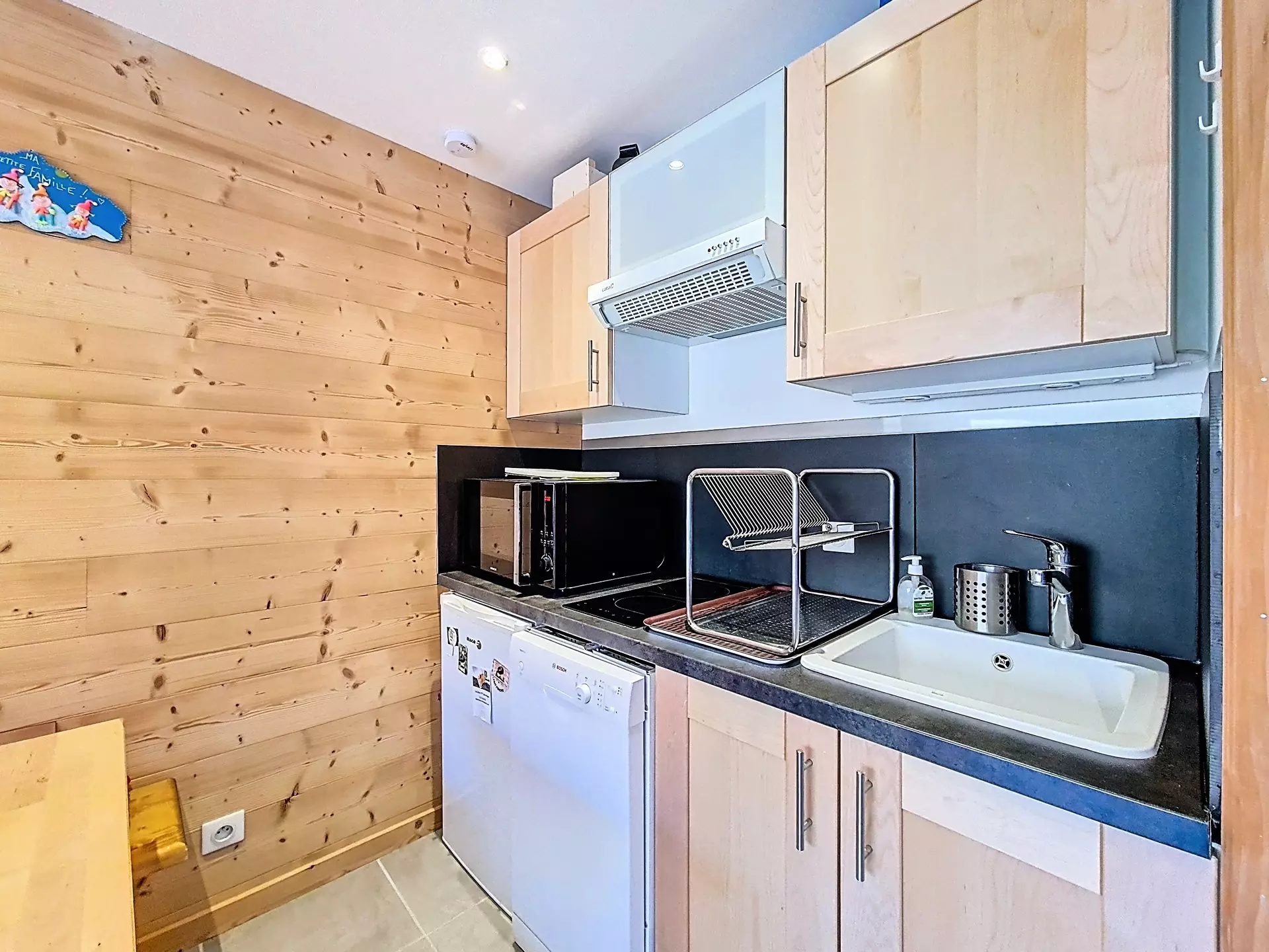 Kitchen equipped with 2 hobs, extractor hood, refrigerator, combination microwave oven, dishwasher, kettle, coffee maker and toaster.