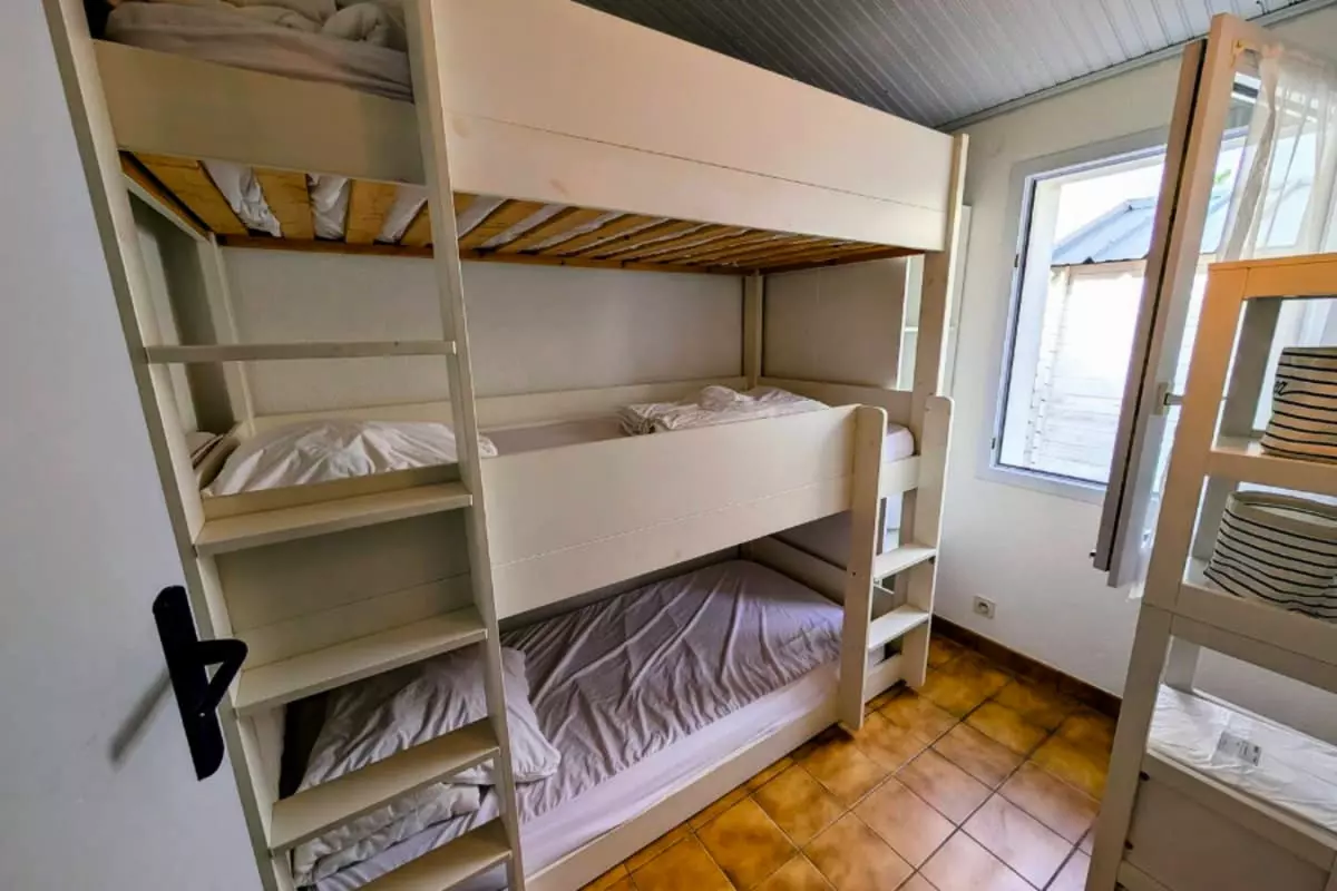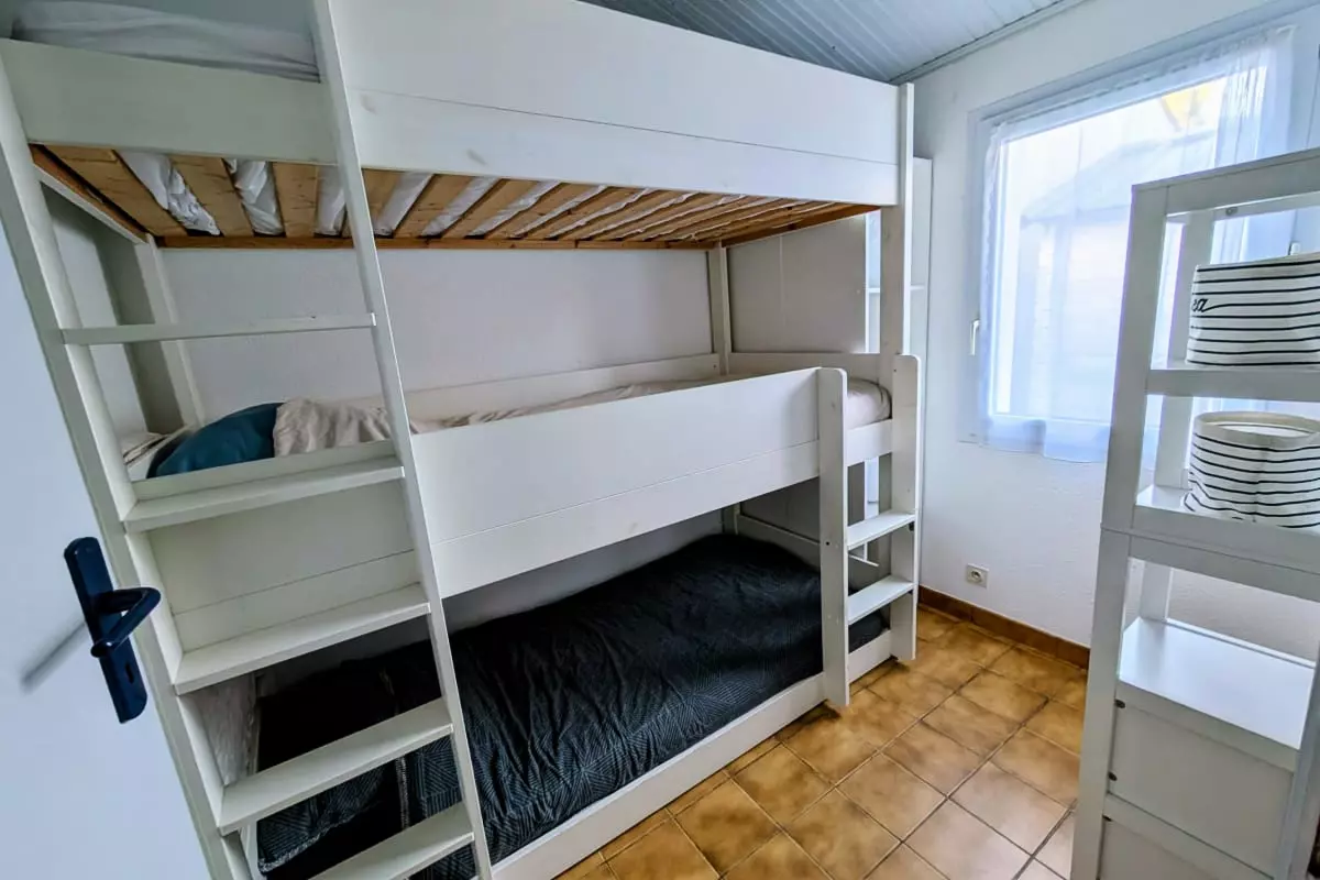 The house includes a bedroom with a 140x200 double bed, another bedroom equipped with a bunk bed that can accommodate 3 90x190 beds, as well as a cozy living room with a 160x200 sofa bed, perfect for relaxing after a day of exploring.