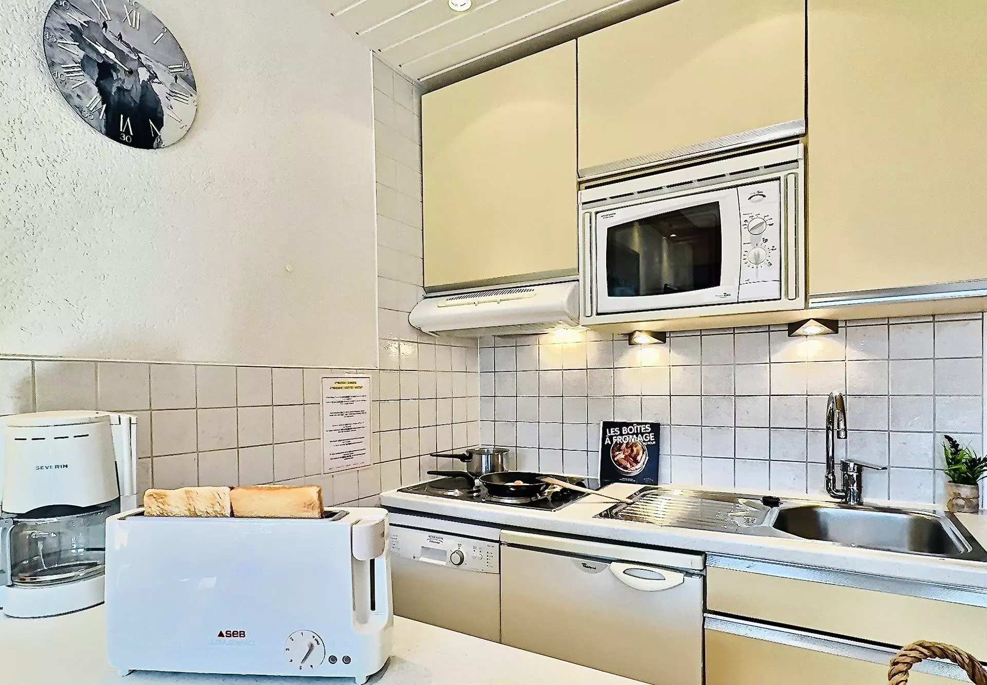 It is functional and equipped with electric hobs, a refrigerator, a dishwasher and a microwave.