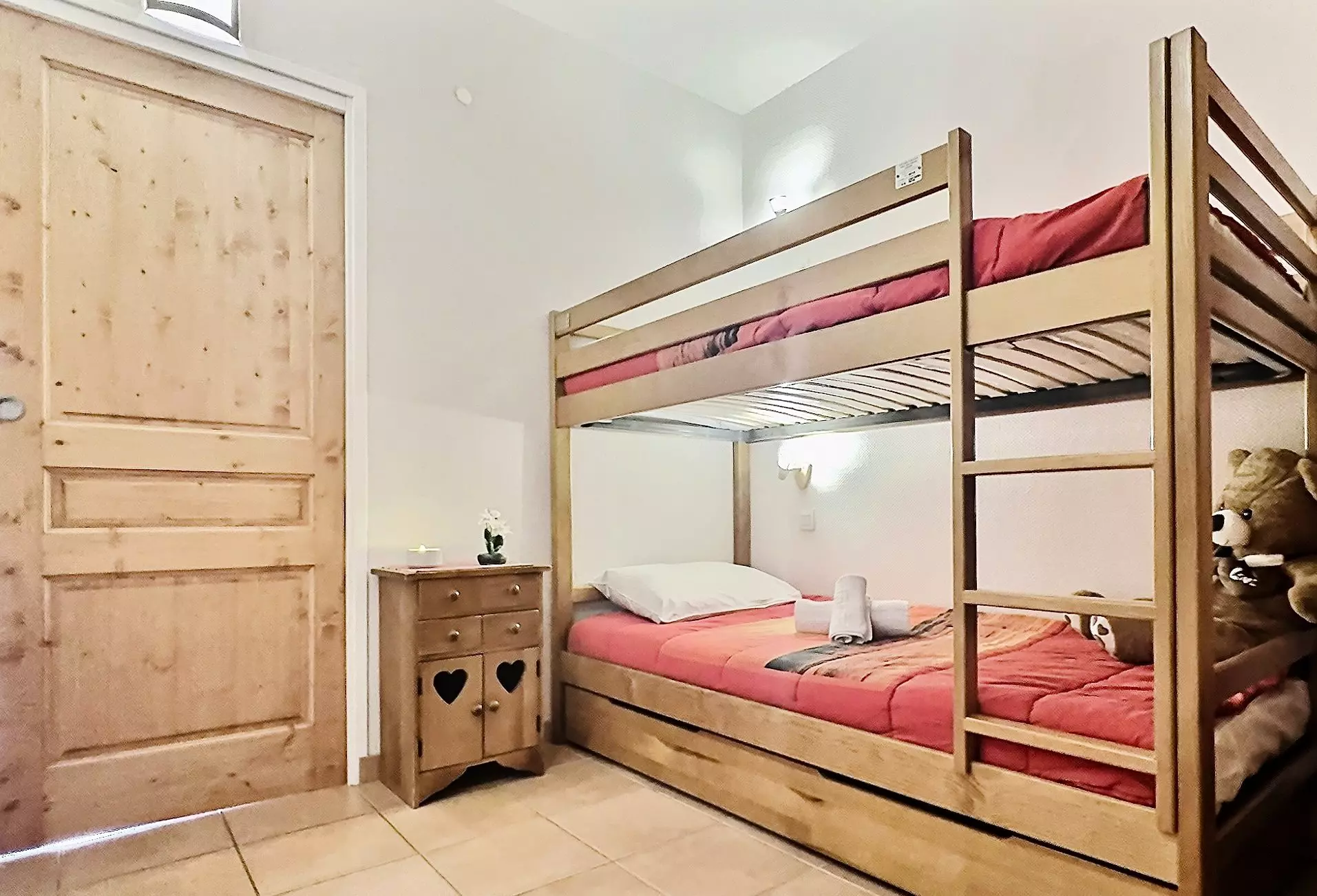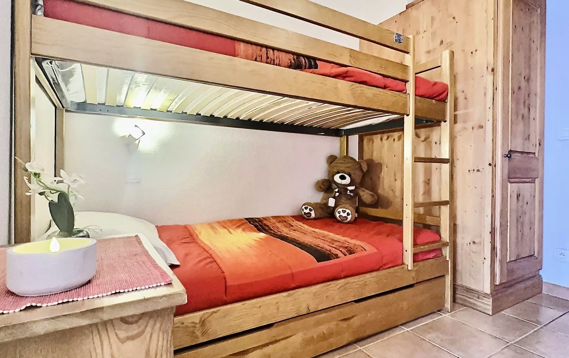 A sleeping area is furnished with a set of bunk beds (80cm). Sleeping in the upper bunk is not suitable for children under 6 years old.