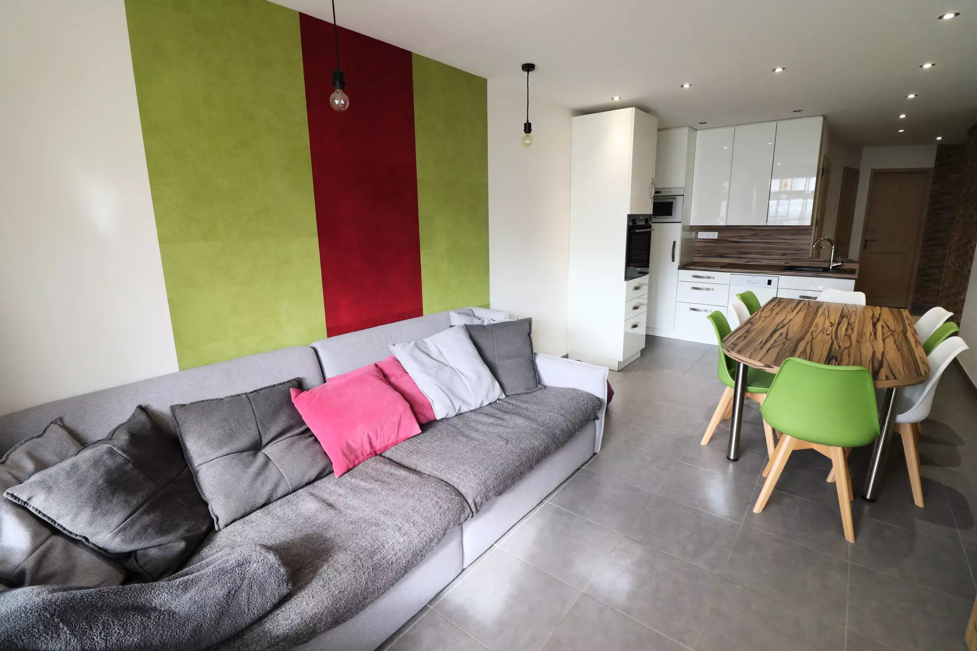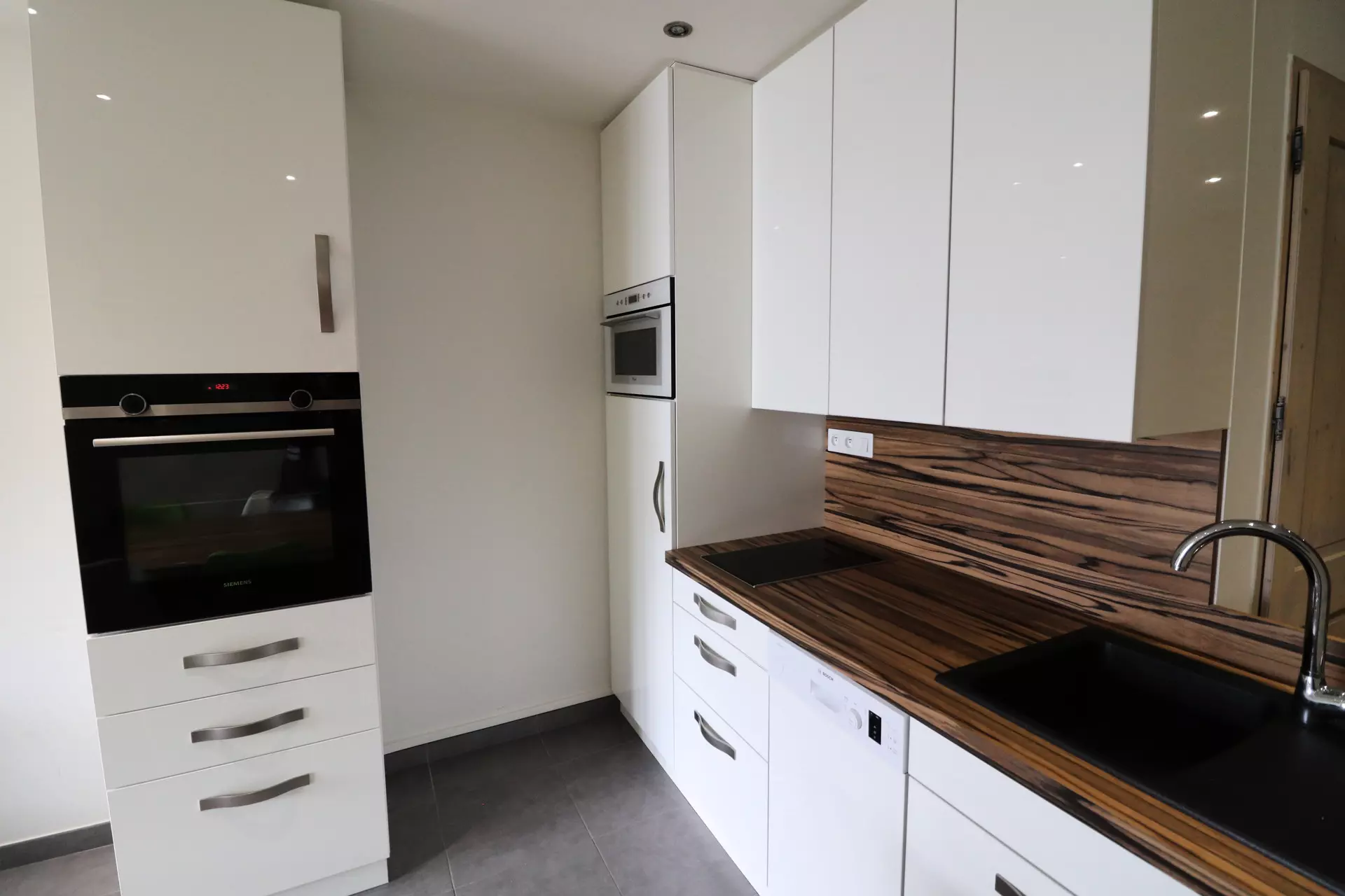 Open-plan kitchen equipped with an oven, microwave and dishwasher
