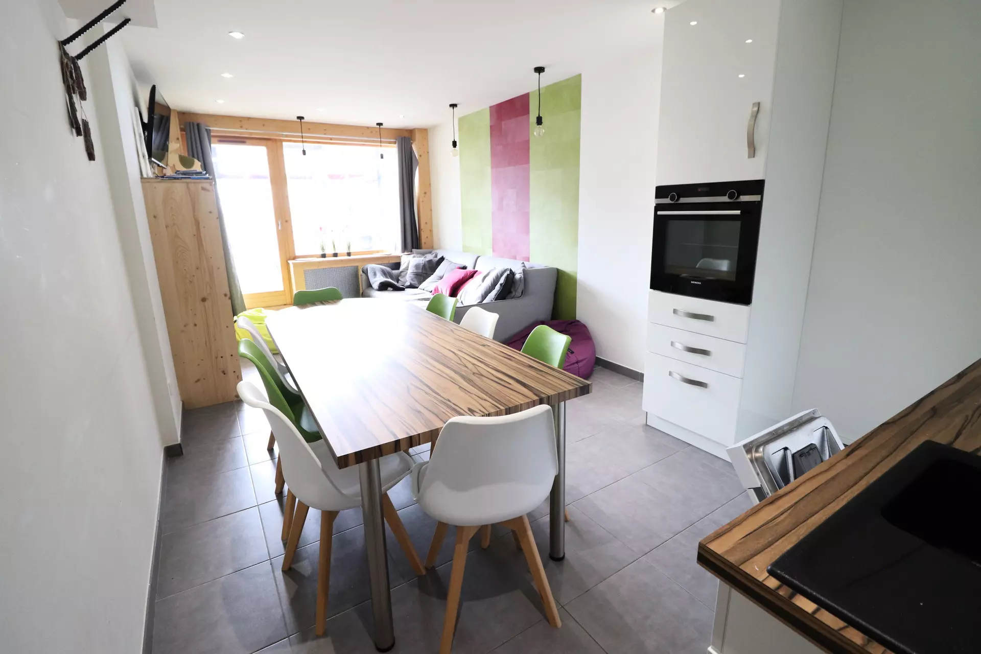 Living room with dining area, sofa bed (double bed) and television