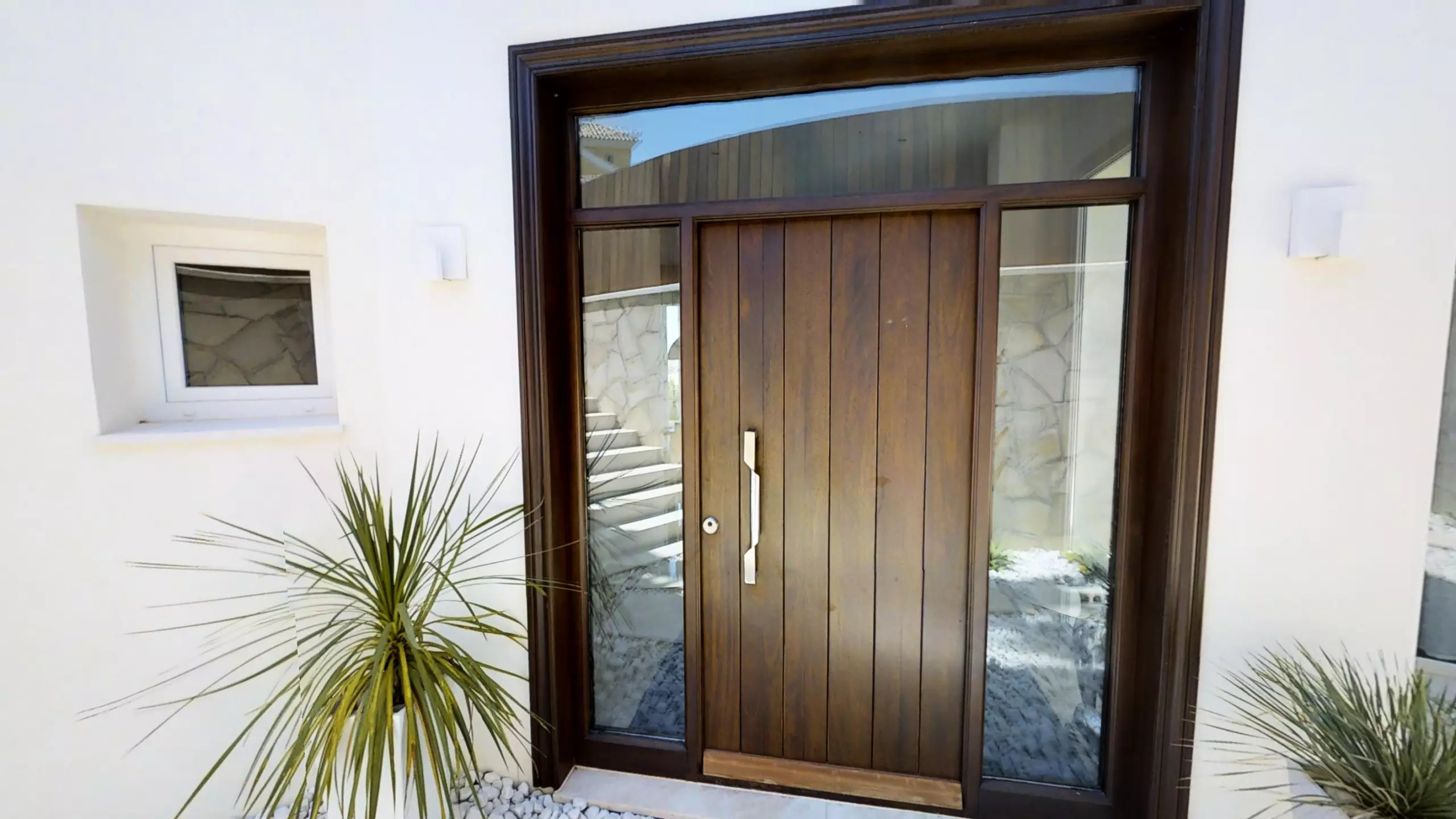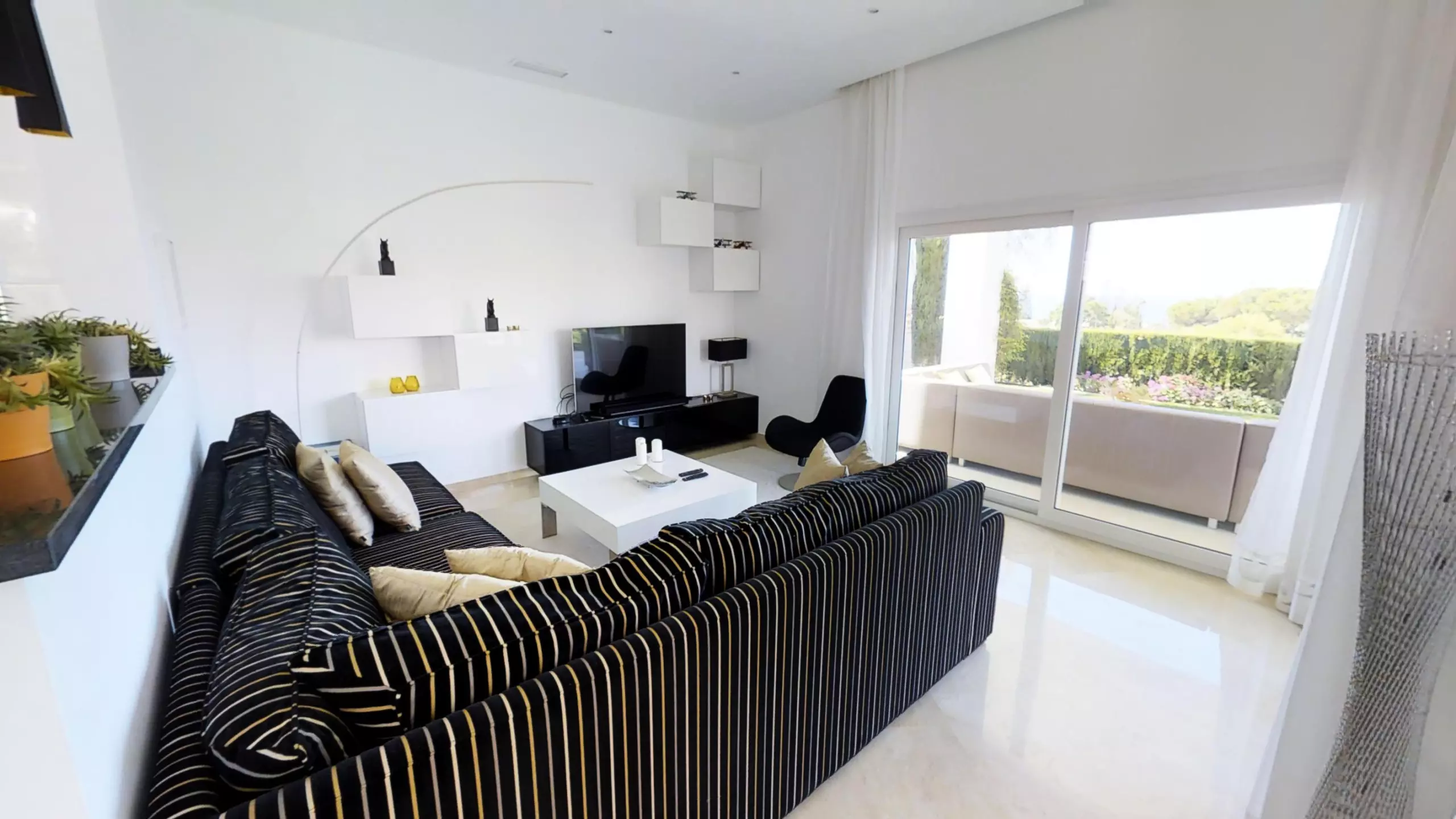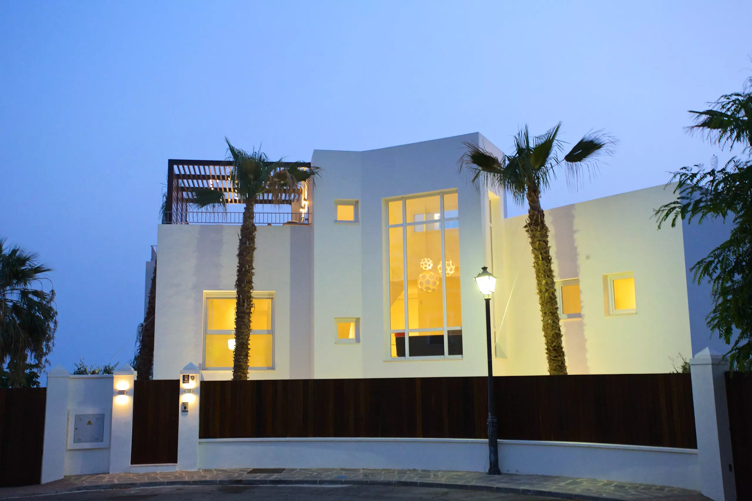 The villa faces due south to west and is located at the end of a quiet cul-de-sac. It comprises a two-story, contemporary-style building with several ground-floor living rooms and four spacious bedrooms, all with en-suite bathrooms.